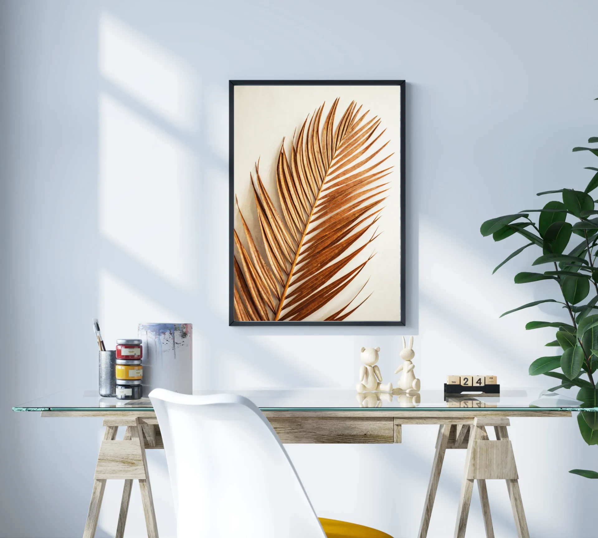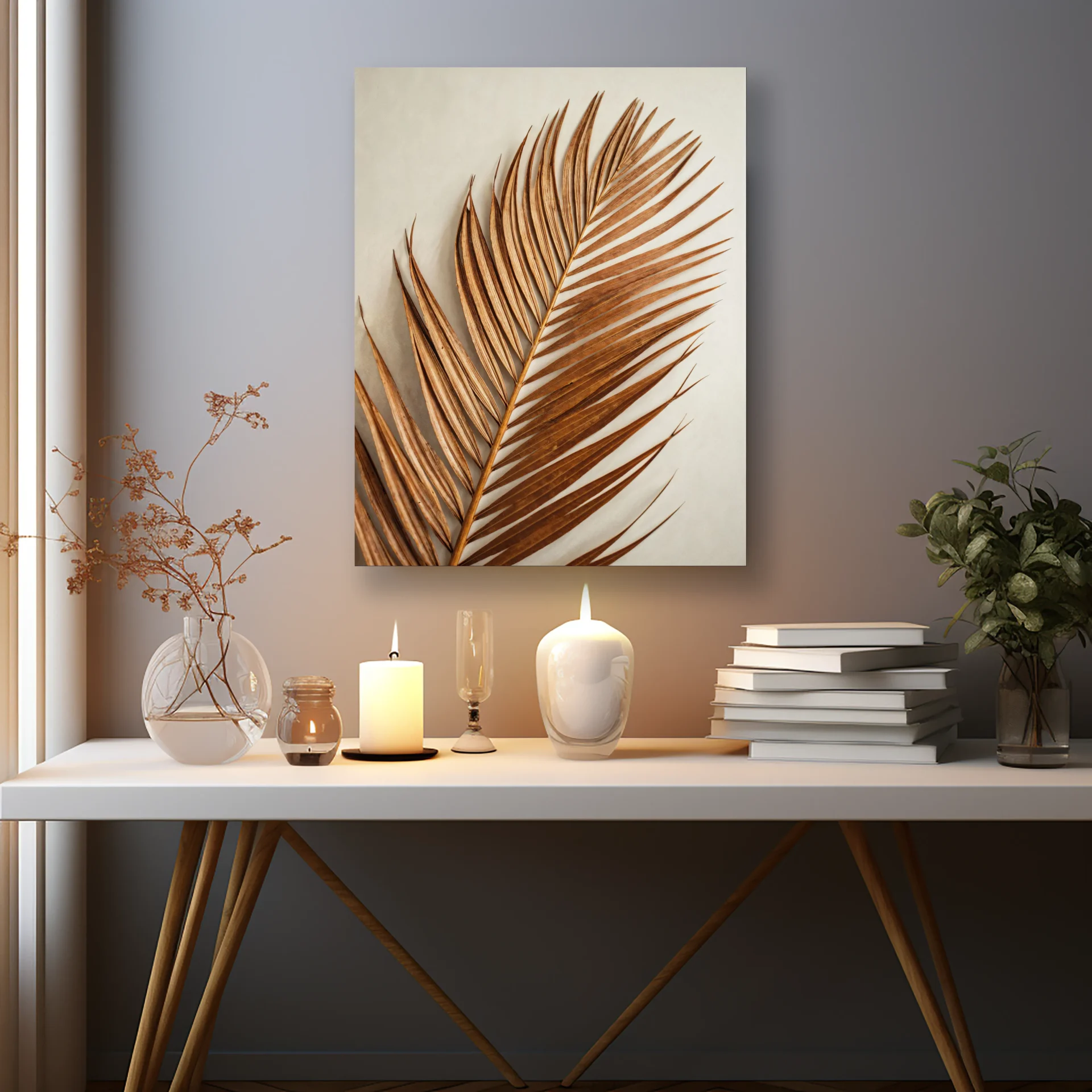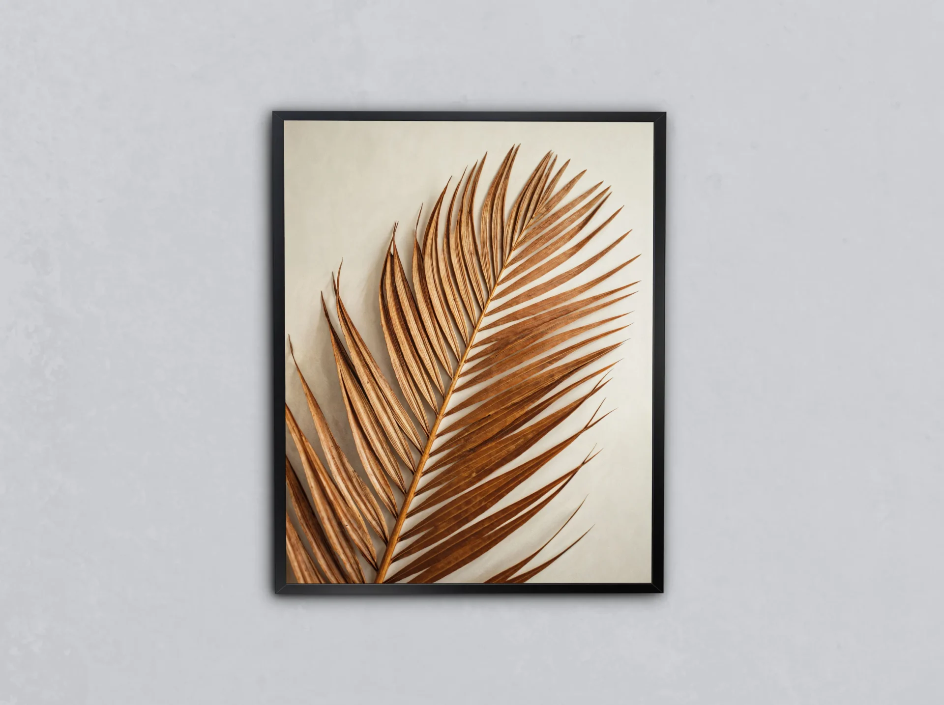 Kuru bir palmiye yaprağının zamansız güzelliği, doğanın sadeliğini zarafetle birleştiriyor. Modern ve doğal detayları sevenler için özgün bir duvar dekorasyonu.