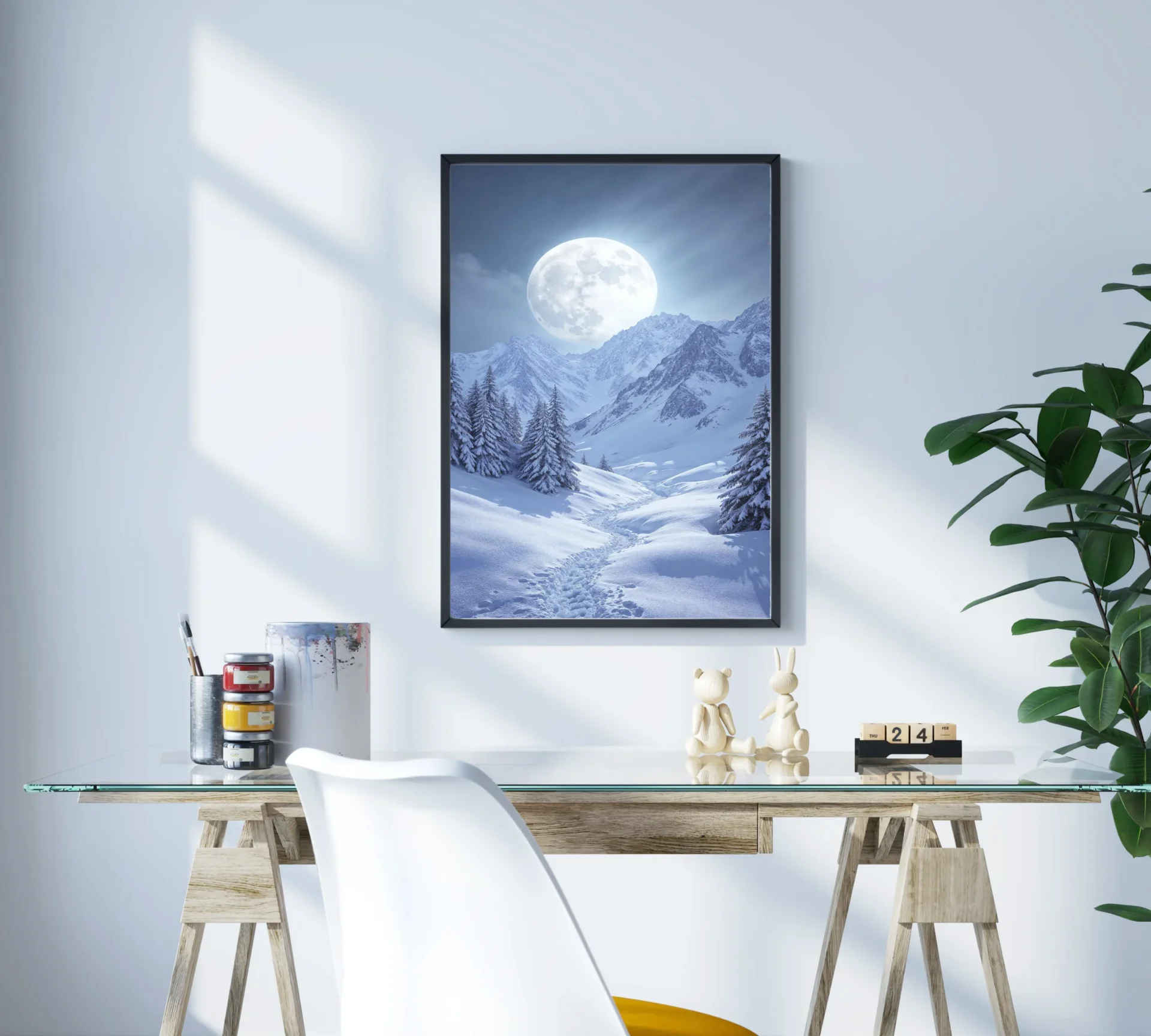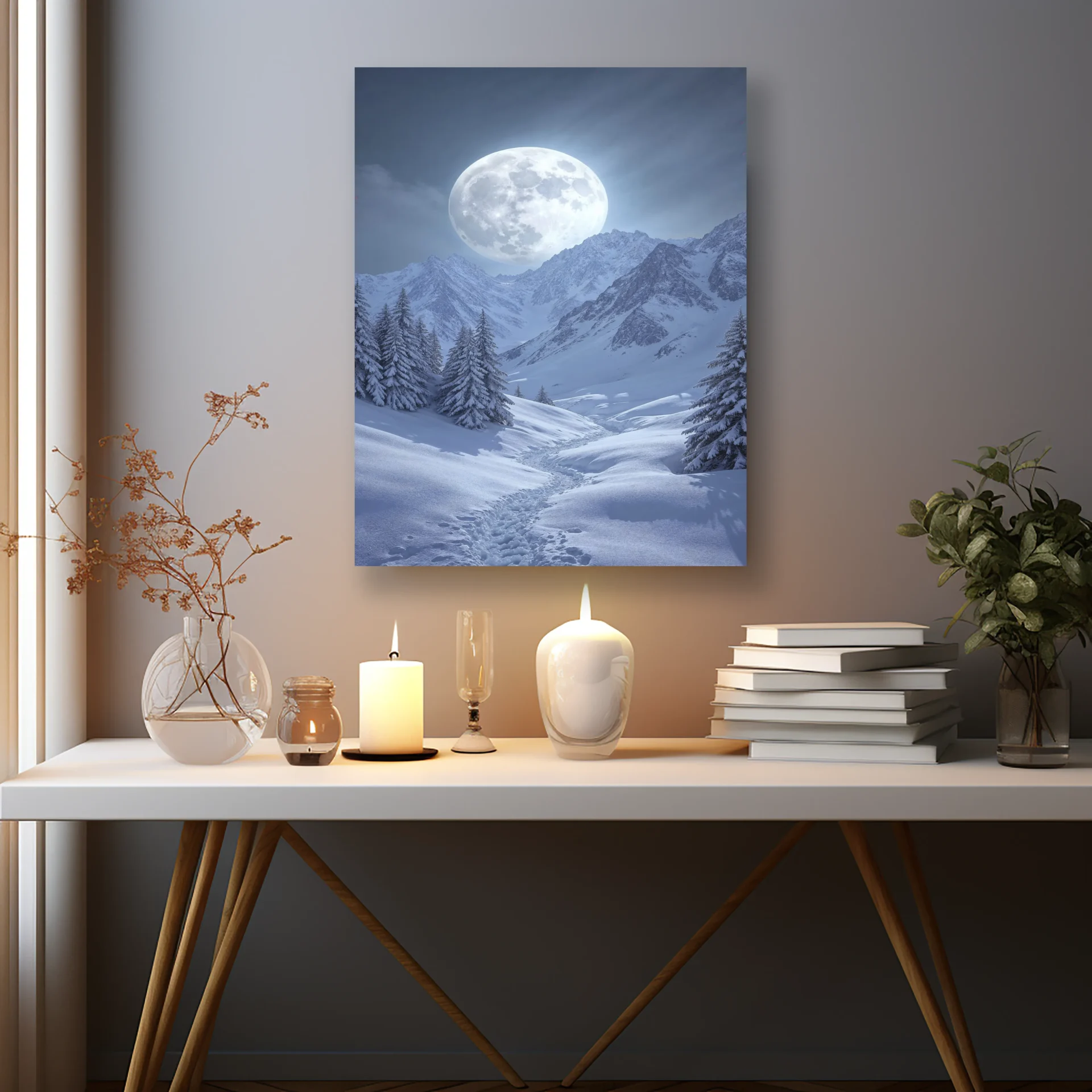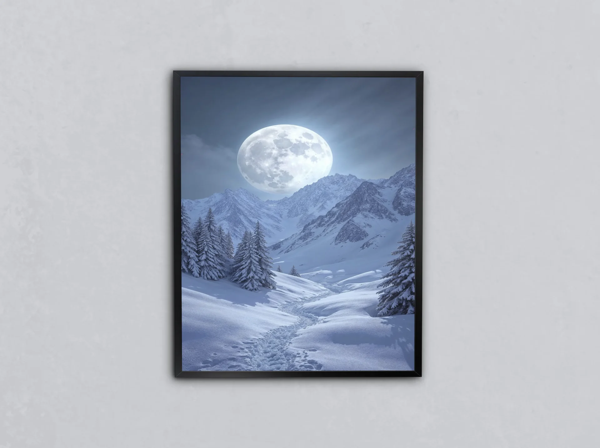 Dağ zirvesi ve karlarla kaplı arazinin üzerinde yükselen dolunay, geceye mistik bir anlam katıyor. Soğuk tonlara ruh katan etkileyici bir tasarım.