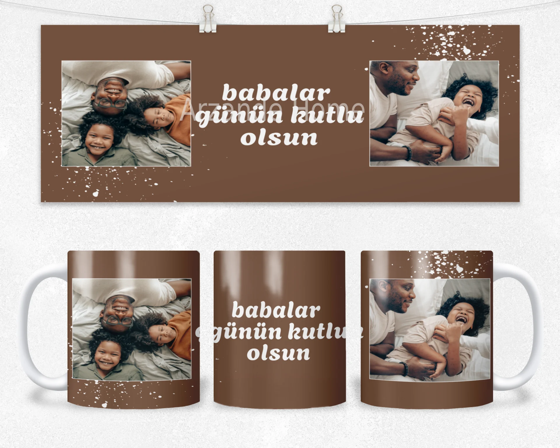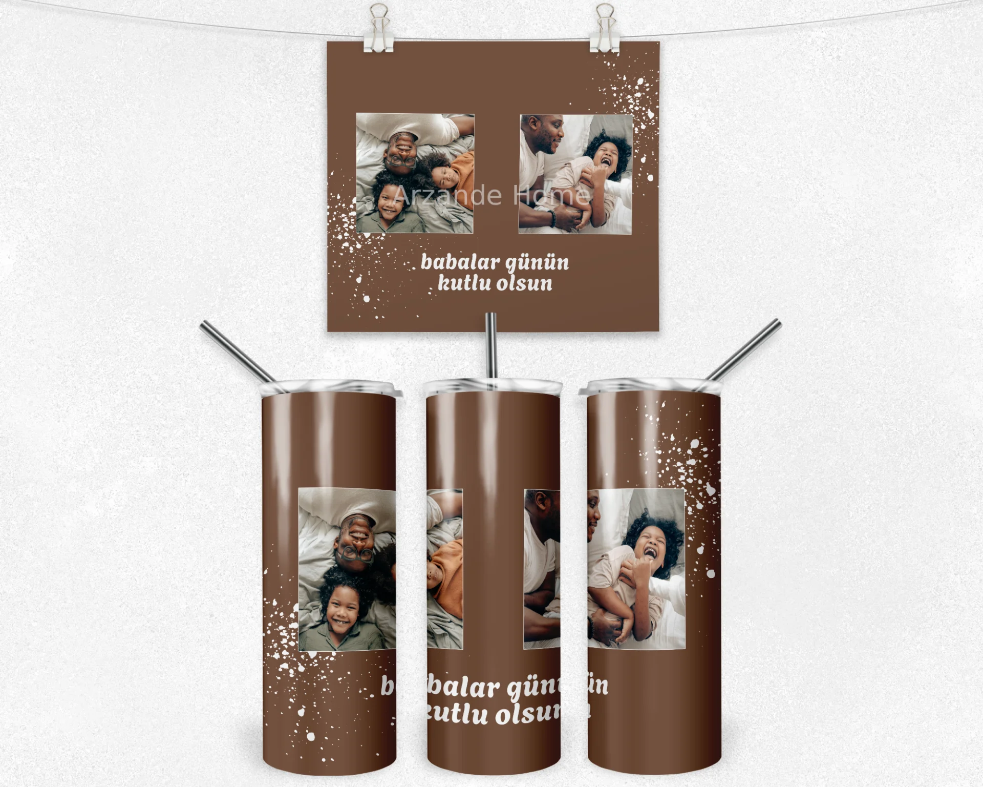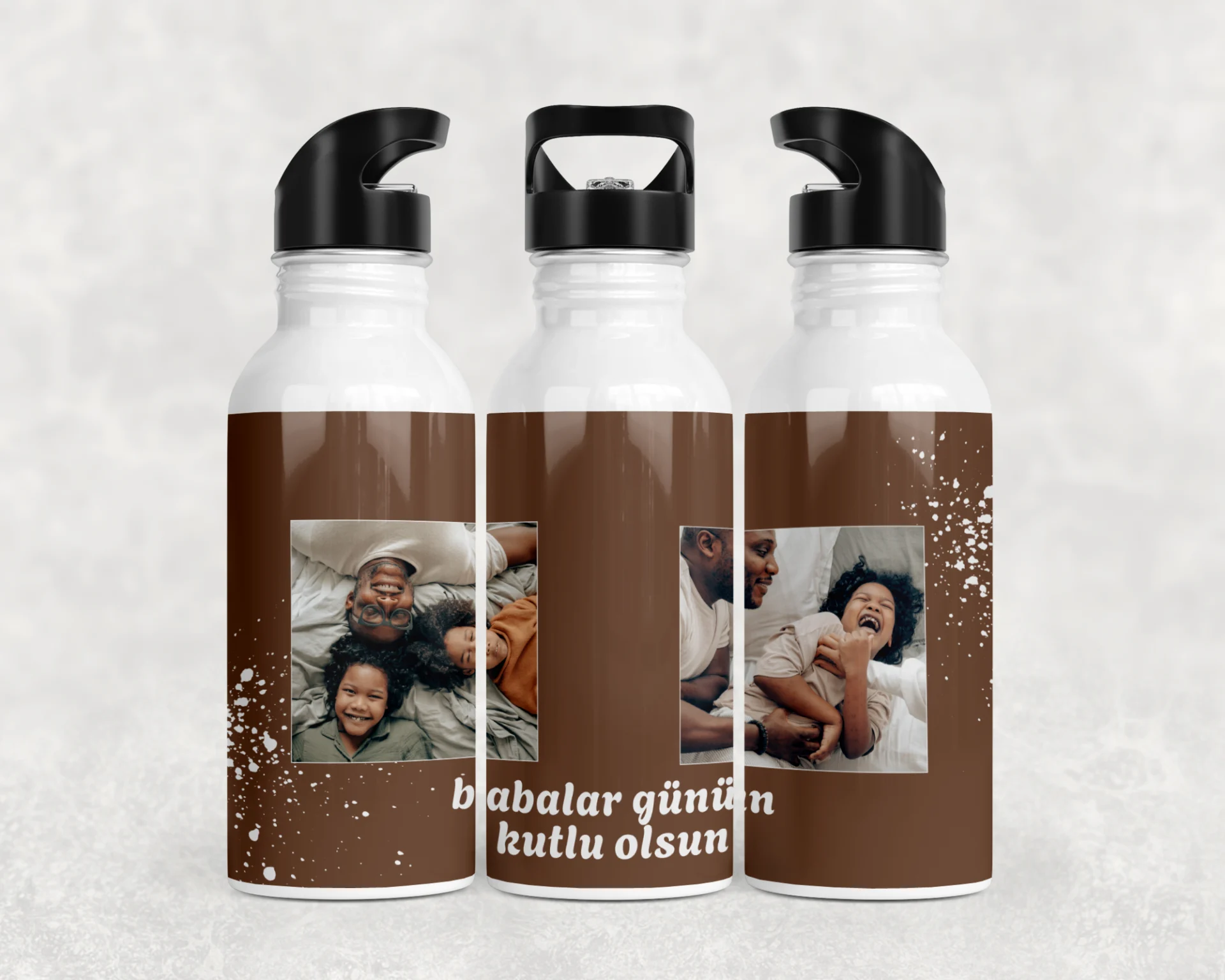 Sıcak kahve tonu zemin ve beyaz sıçrama efektli Babalar Günü tasarımıyla şık set: 600 ml termos, 600 ml matara, 11 oz kupa. İsim/tarih/mesaj kişiselleştirme yapılır; hediye paketi ve not kartı ile gönderilir.