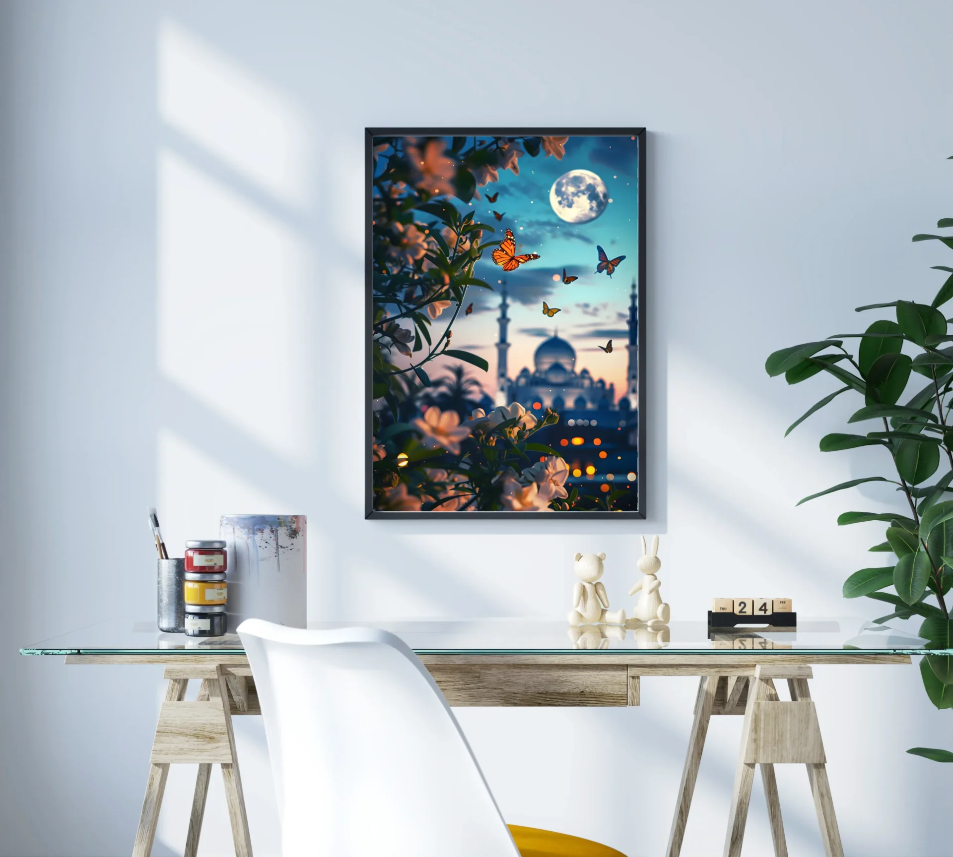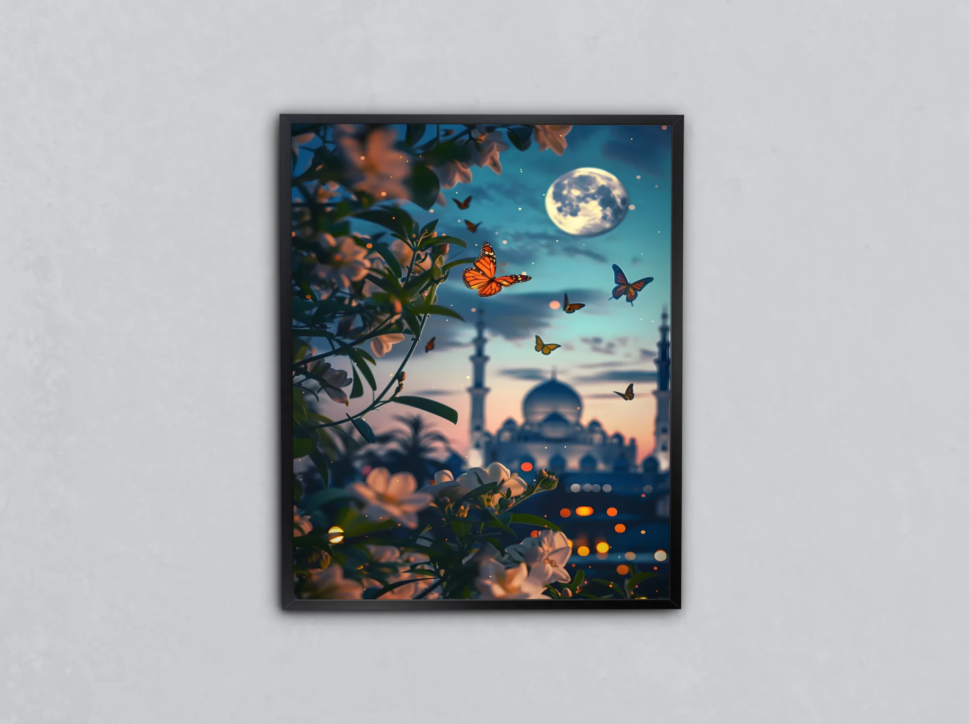 Çiçeklerin ve kubbelerin geceyle dansı, manevi bir rüyayı anlatıyor. Ay ışığında aydınlanan bu sahne içsel bir huzurun resmini sunuyor.