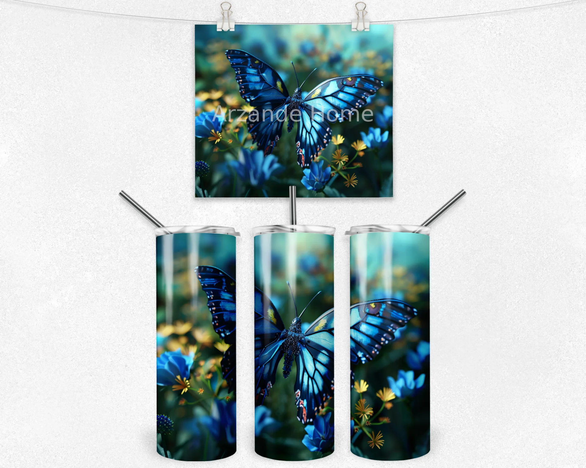 Mavi çiçekler arasında zarif kanatlarını açan kelebekler doğal ve ferah bir atmosfer yaratır. Gün boyu pozitif enerji verir.