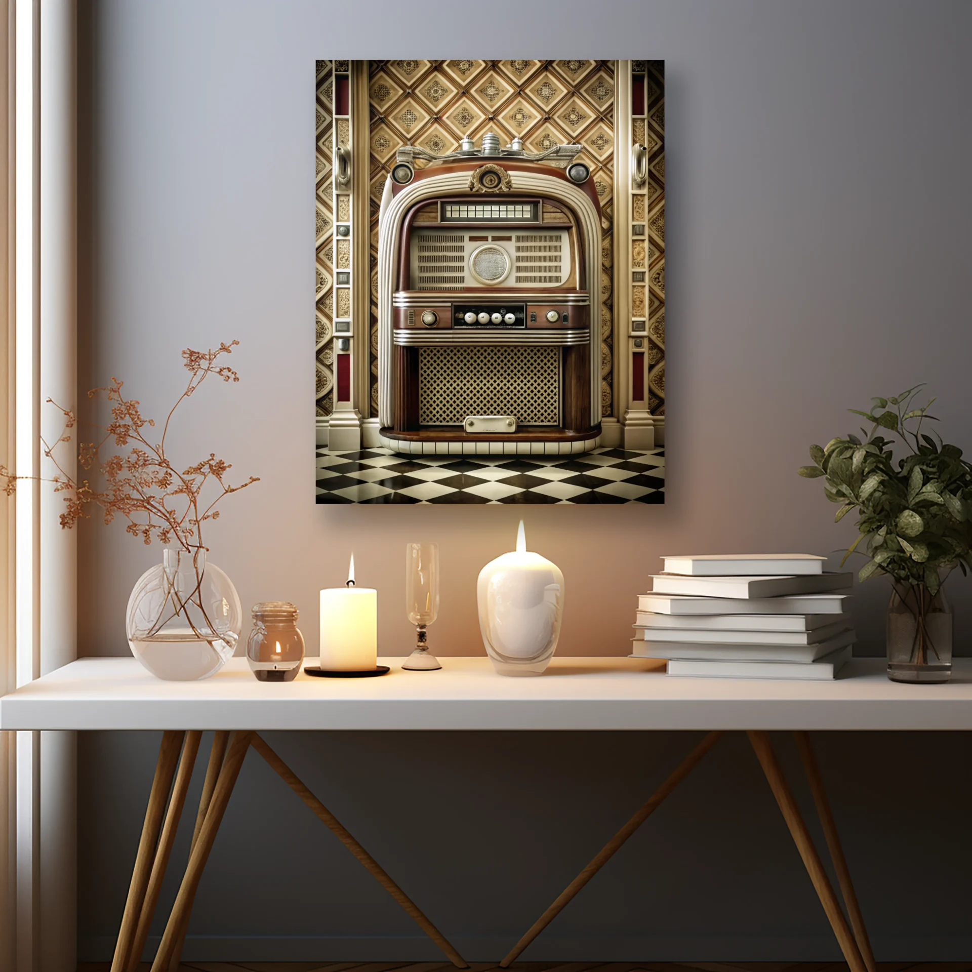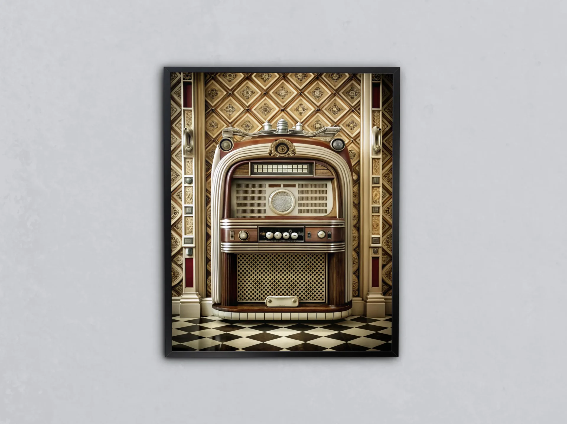 Kareli zeminde duran retro radyo, disko döneminin enerjisini yansıtıyor. Hem eğlenceli hem nostaljik bir detay.