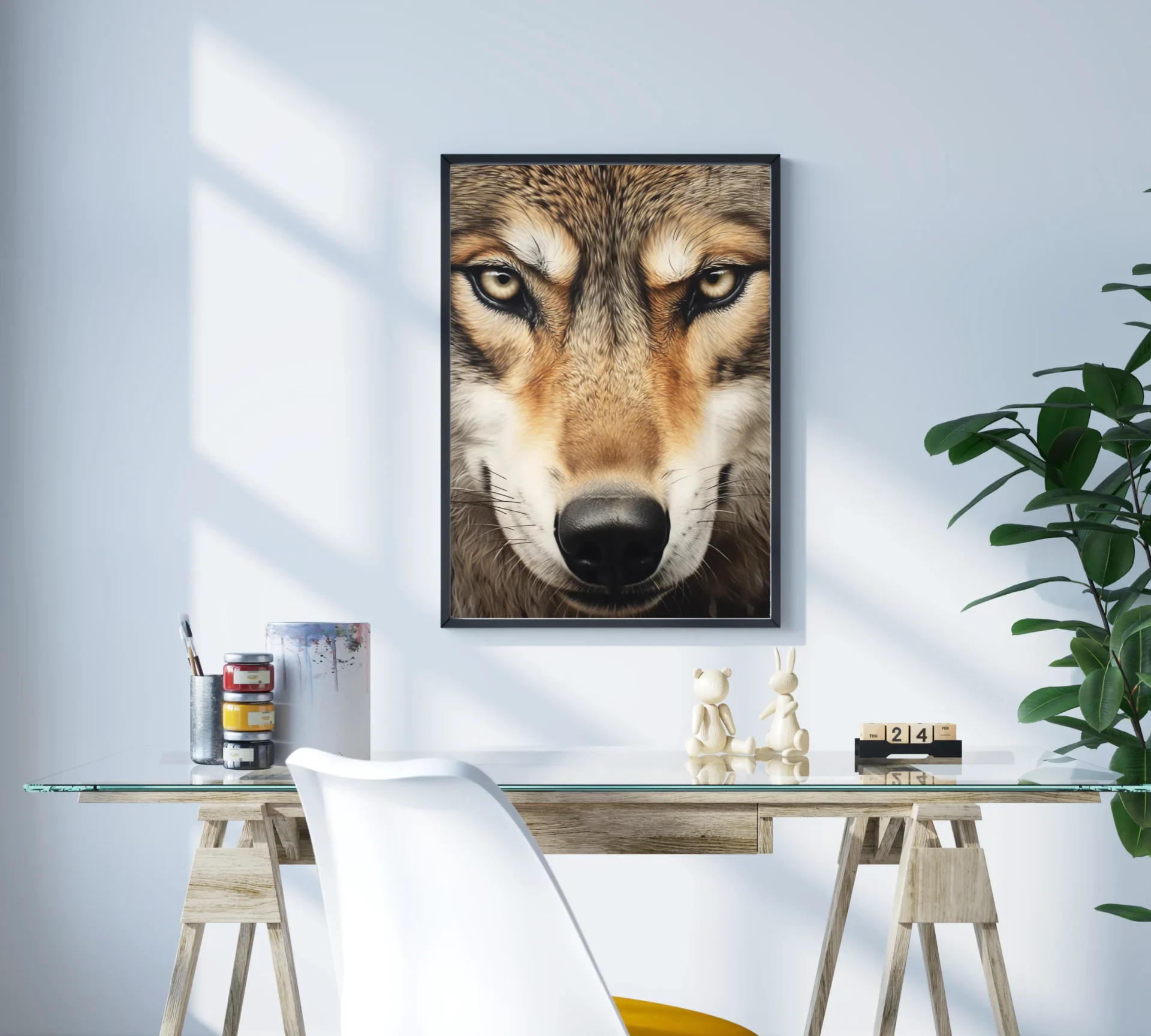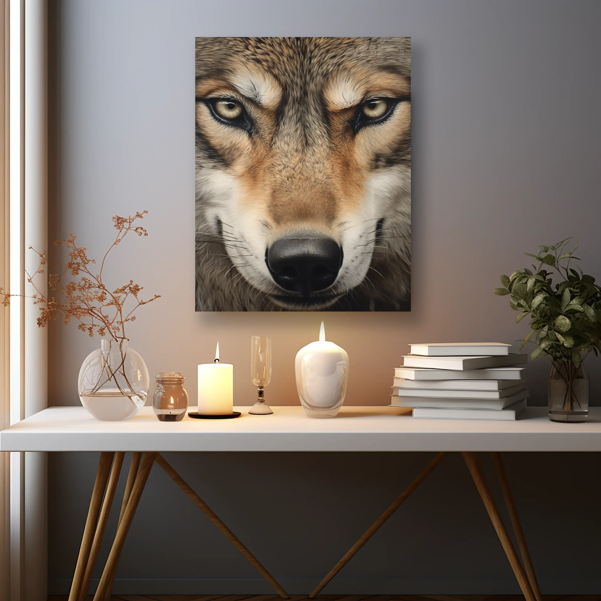 Keskin bakışlarıyla dikkat çeken kurt, doğanın en uyanık bekçilerinden biri olarak huzurlu bir duruş sergiliyor. Güç ve zekânın estetikle buluştuğu bir tasarım.