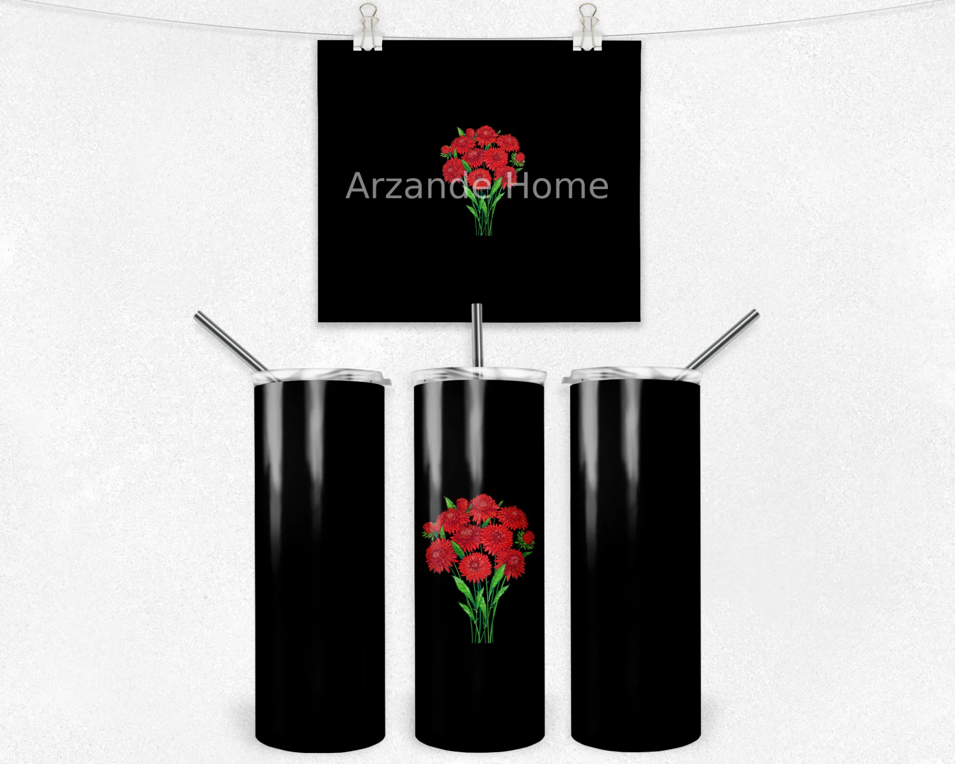 Siyah zemin üzerinde canlı kırmızı çiçek buketiyle minimal ve zarif bir görünüm sunar. Şık tarzını her an yanında taşımak isteyenler için ideal hediye seçeneği.