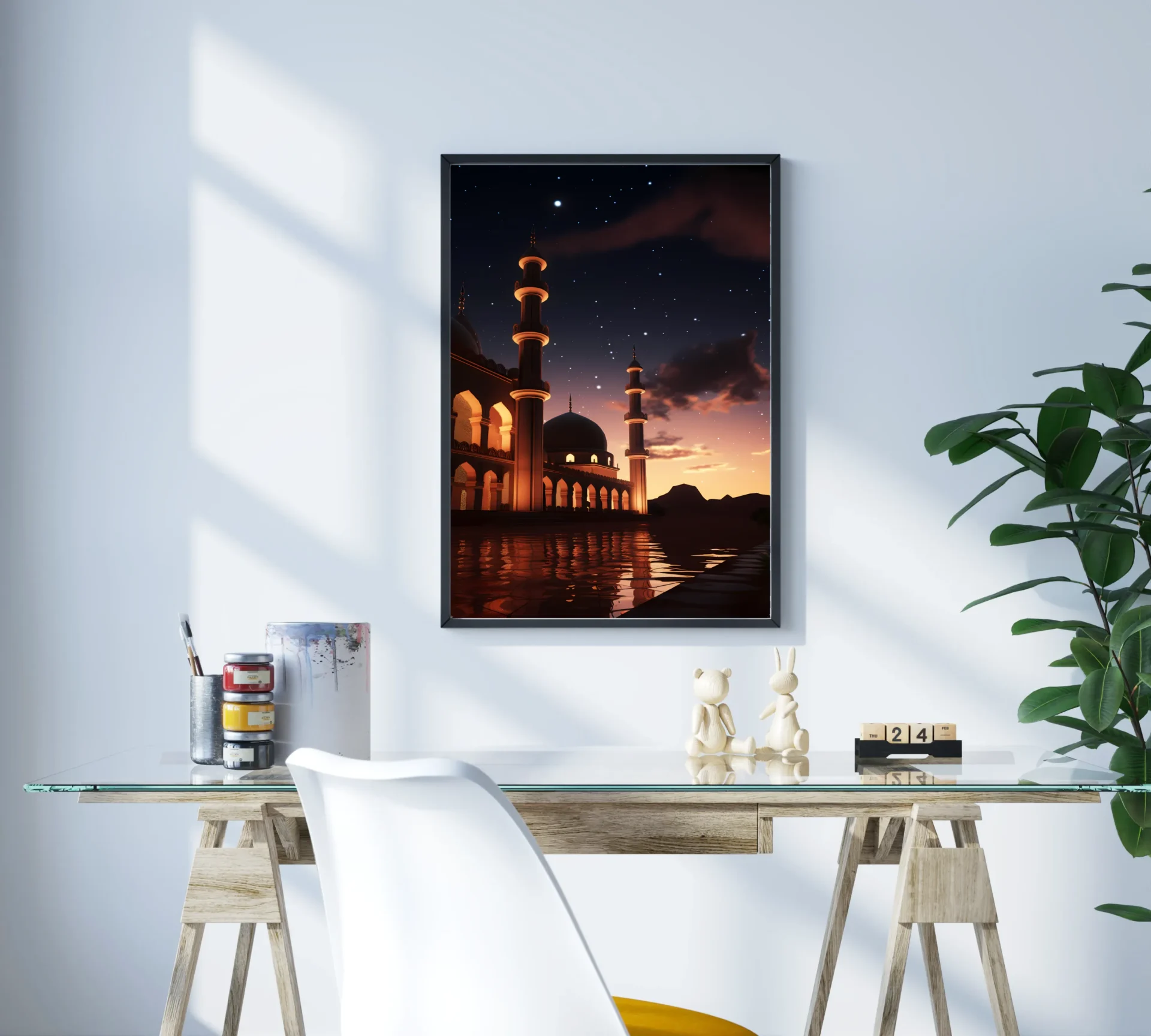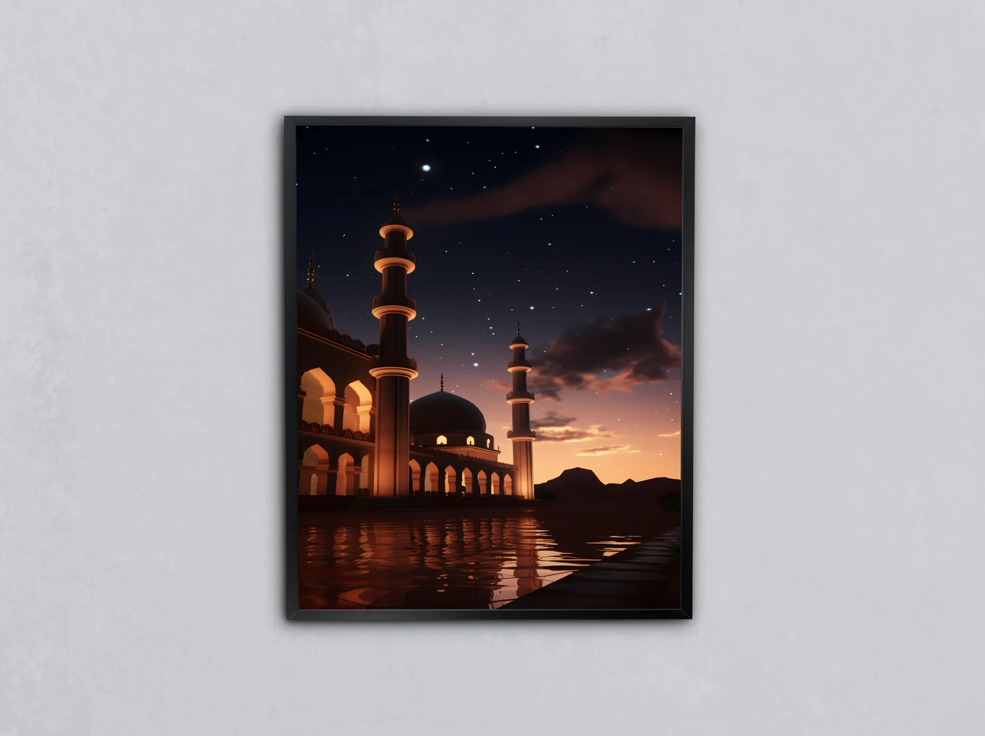 Gece karanlığında yükselen minareler sessizliğin sesi oluyor. Ruhani derinliği hissetmek isteyenler için anlam yüklü bir tasarım.