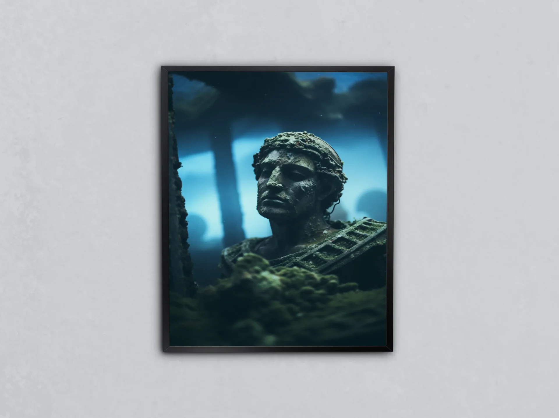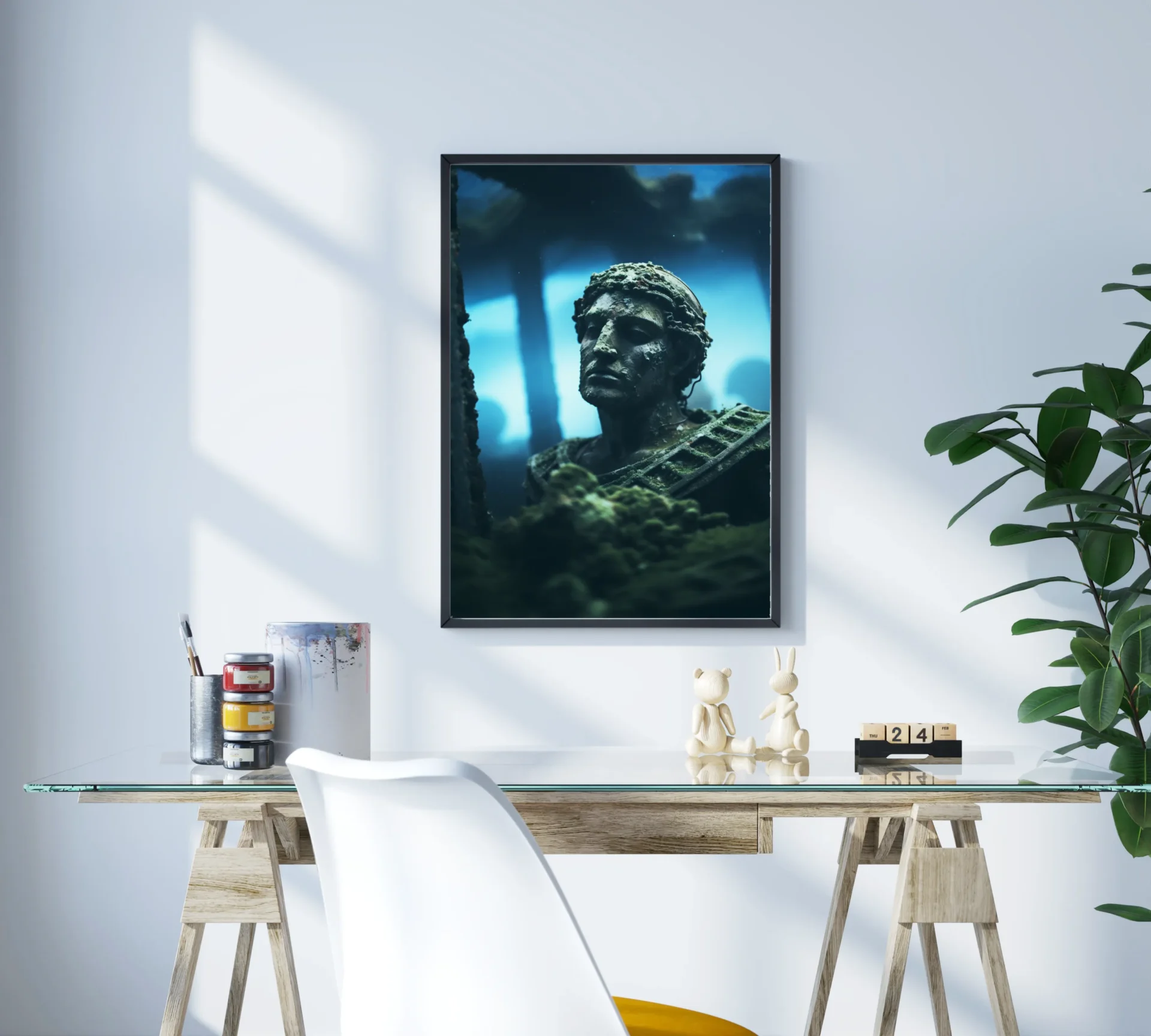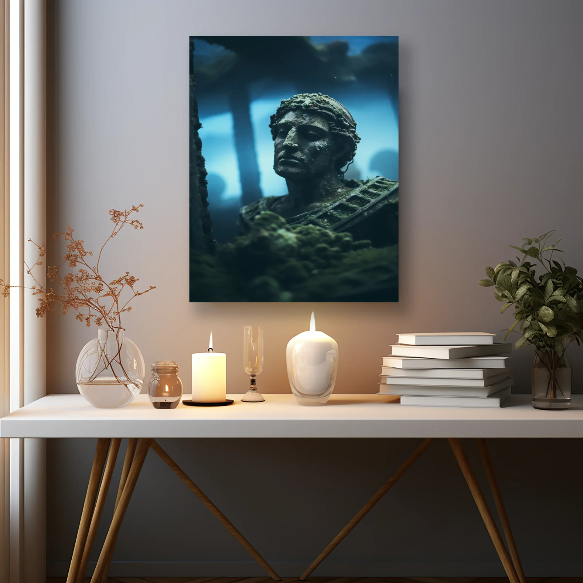 Karanlık arka planda sert bir yüz ifadesiyle yükselen büst, cesareti temsil eder. Heykel estetiği sunar.