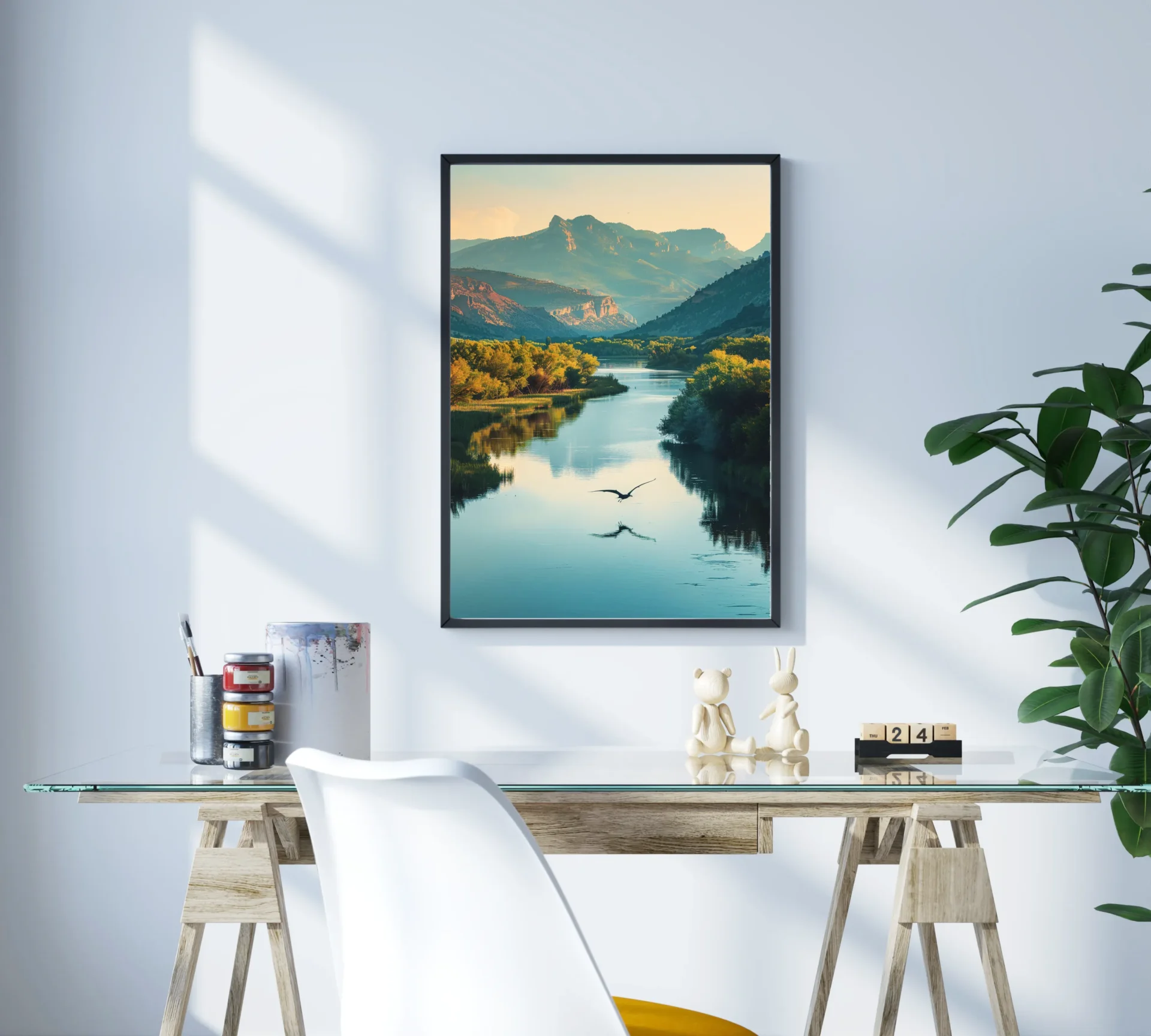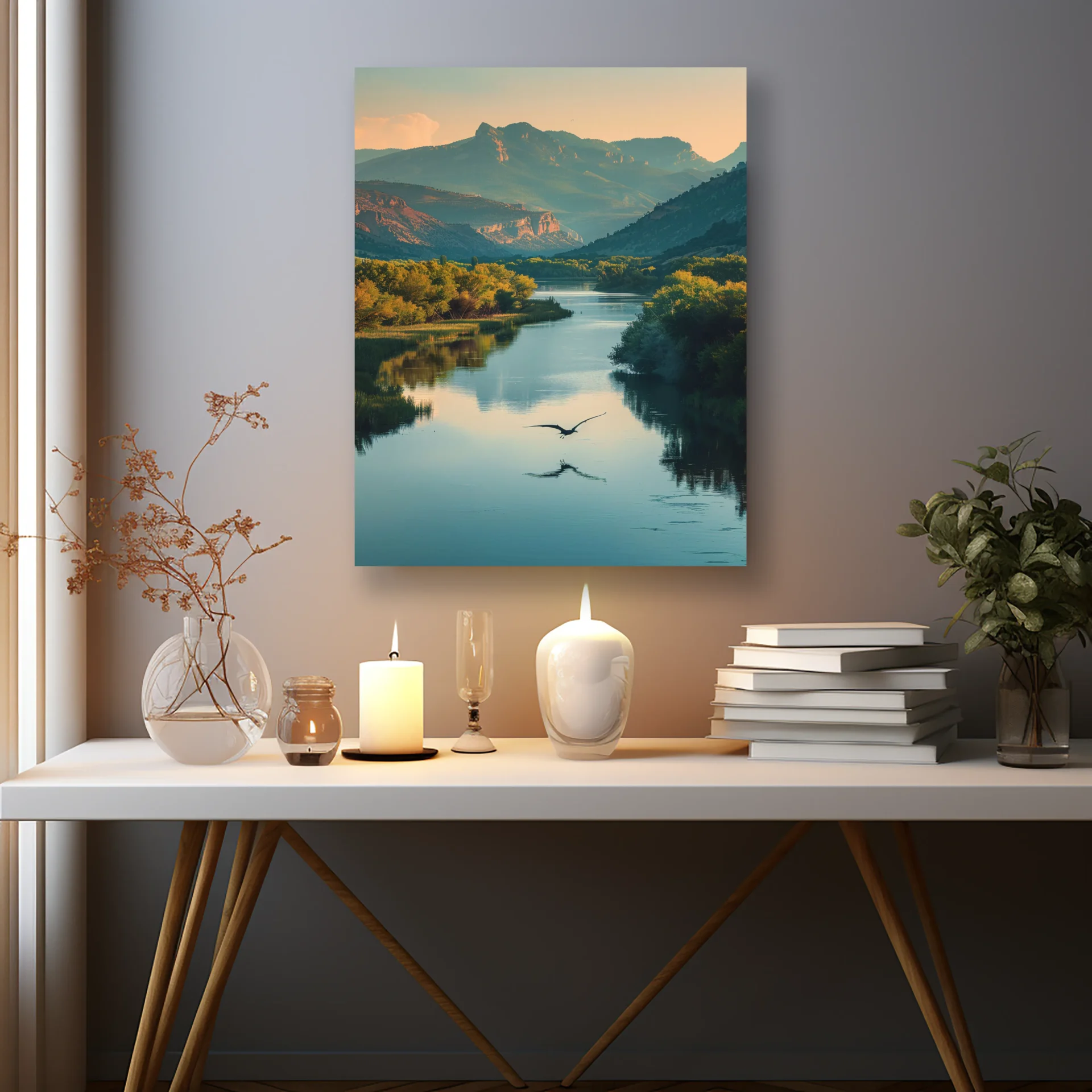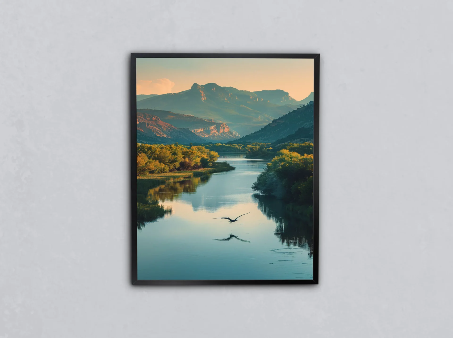Hafif sisli gökyüzünde süzülen kuşlar ve dağlarla çevrili bir nehir, huzur ve özgürlüğü simgeliyor. Manzara tutkunları için yalın bir kaçış hissi sunar.