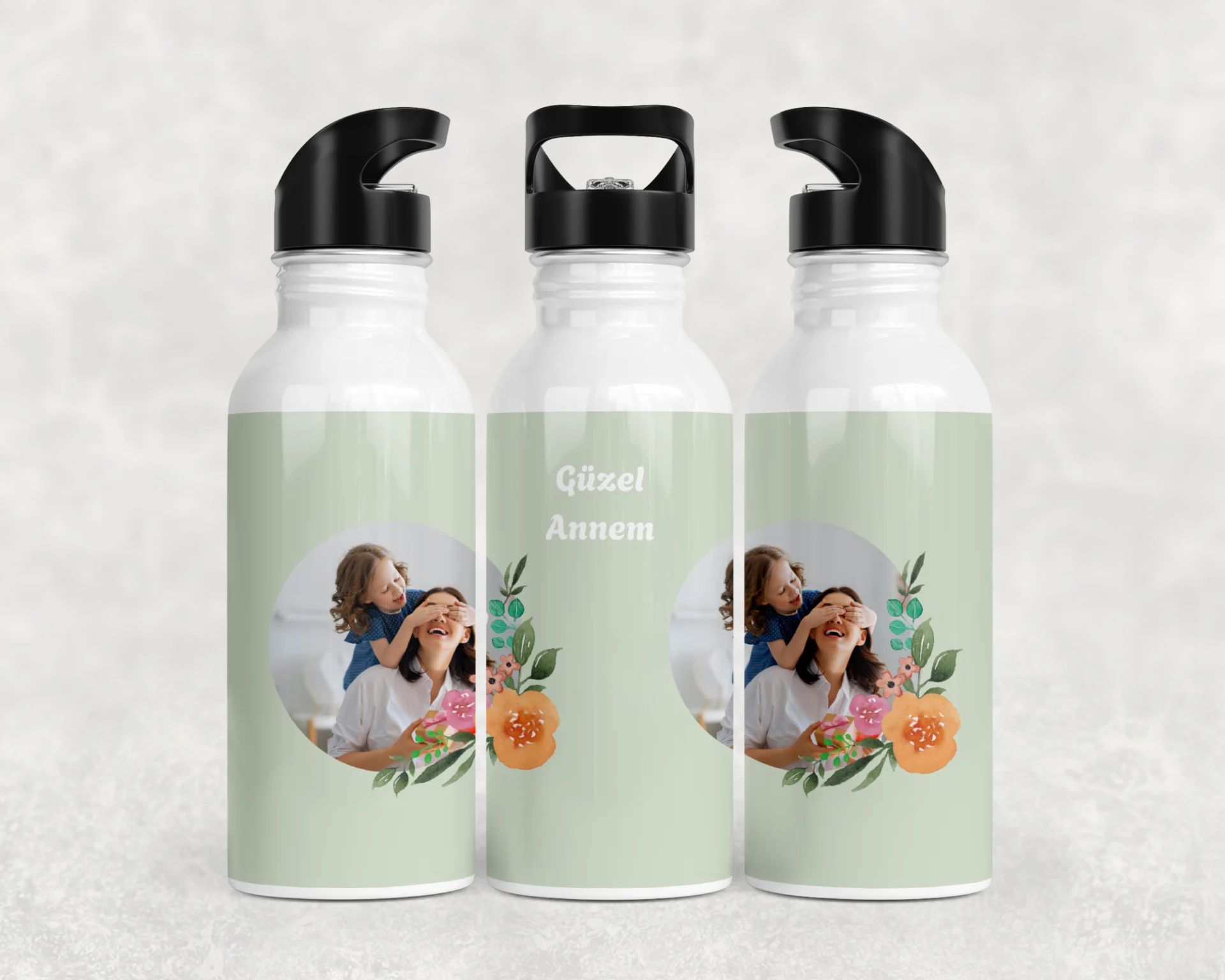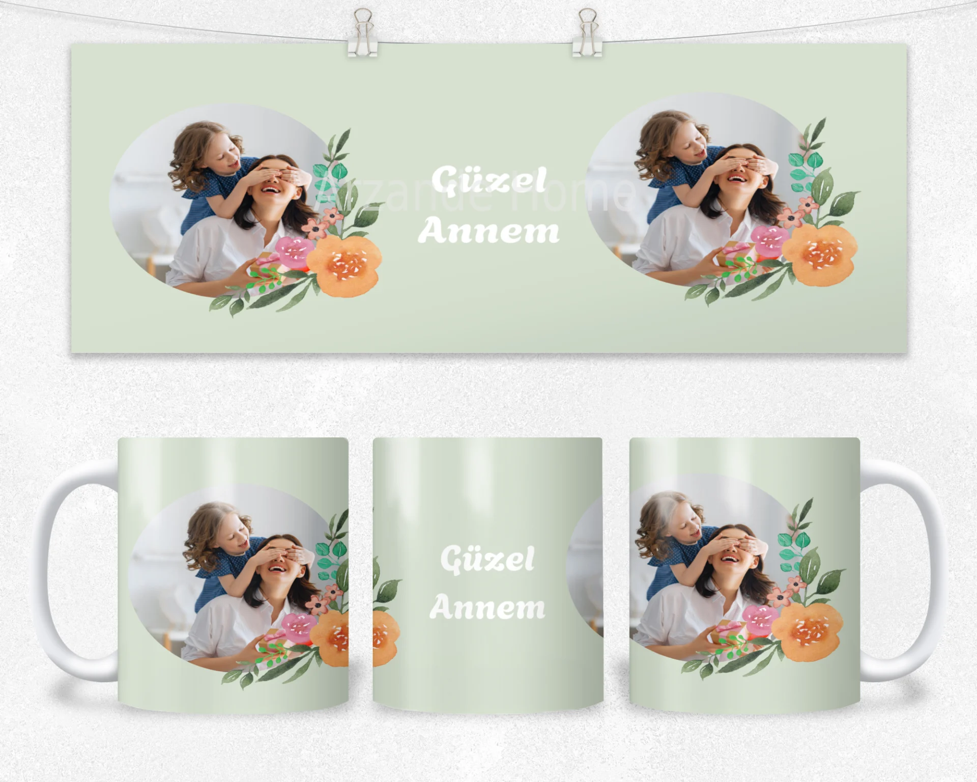 Nane yeşili zemin, akvarel çiçekler ve iki dairesel fotoğraf alanı ile zarif “Güzel Annem” teması. 600 ml termos, 600 ml matara, 11 oz kupa; ad/mesaj/tarih kişiselleştirme ve hediye paketi mevcuttur.