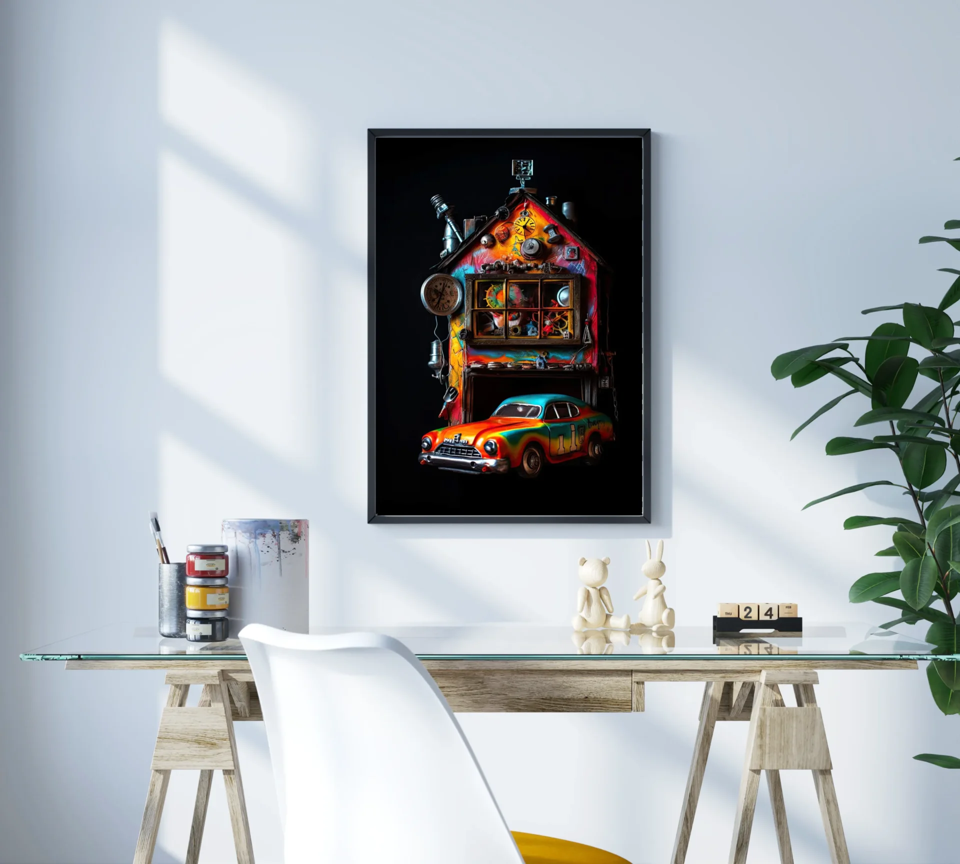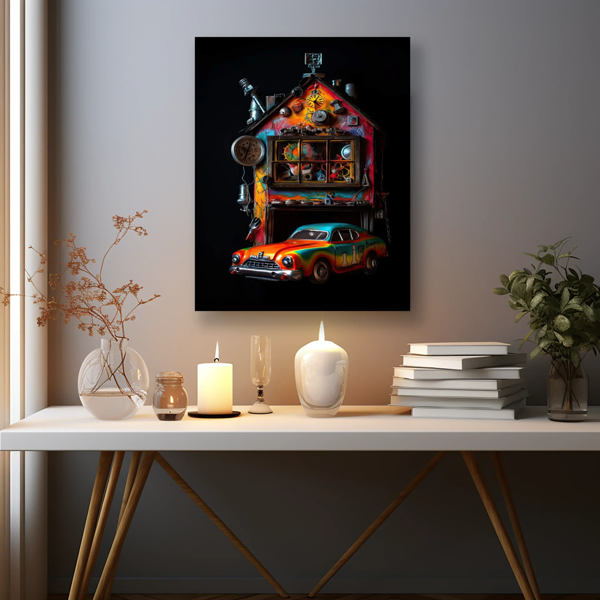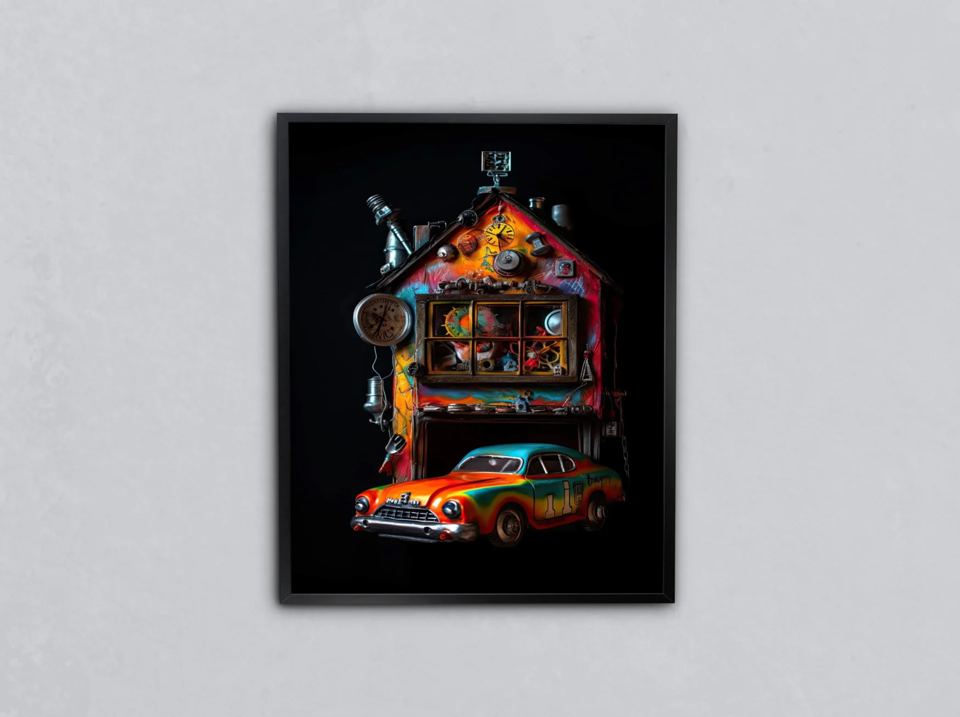 İçinde anılar saklayan bir ev modeli ve altında klasik araba… Bu tablo geçmişe yapılan bir yolculuğu betimliyor.