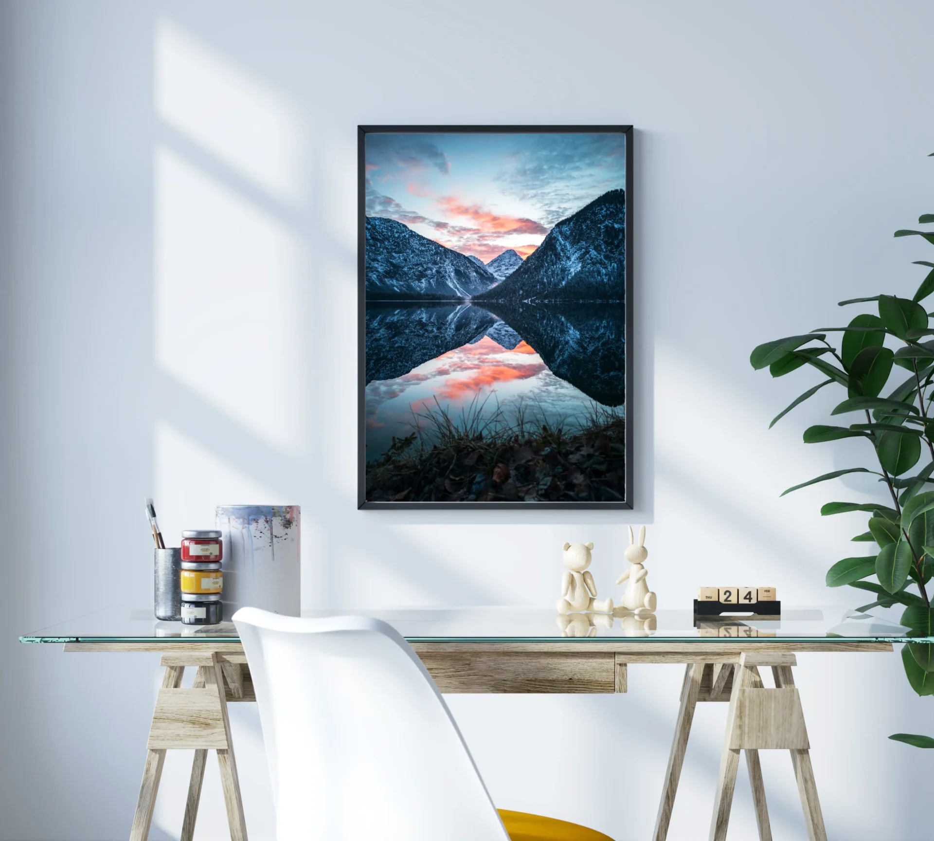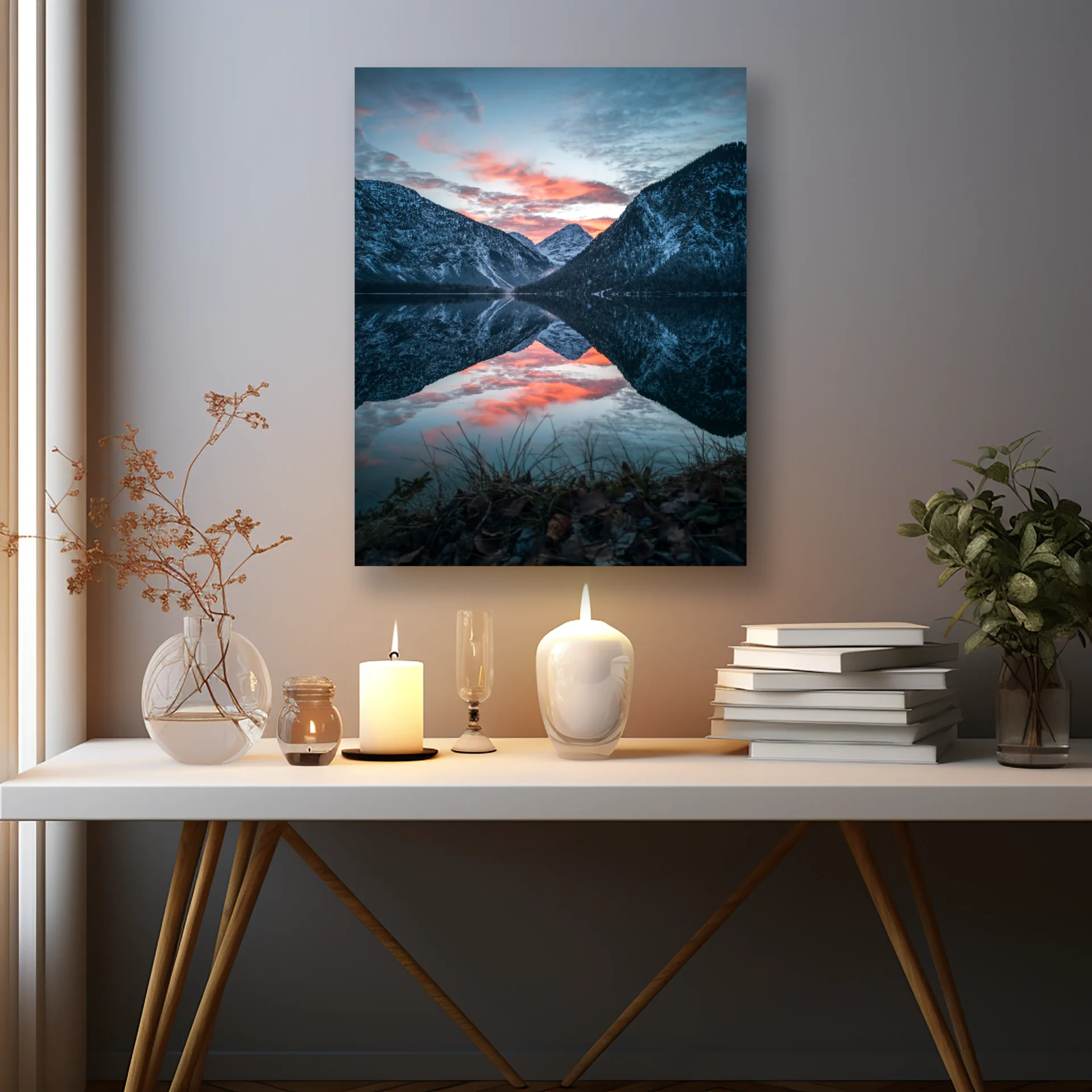 Alacakaranlıkta suya yansıyan dağlar, doğanın büyüleyici simetrisinin görsel anlatımıdır. Derinlik ve sakinlik arayanlar için ideal.