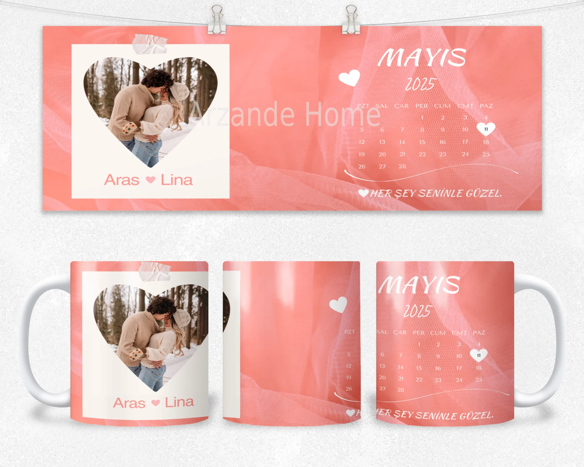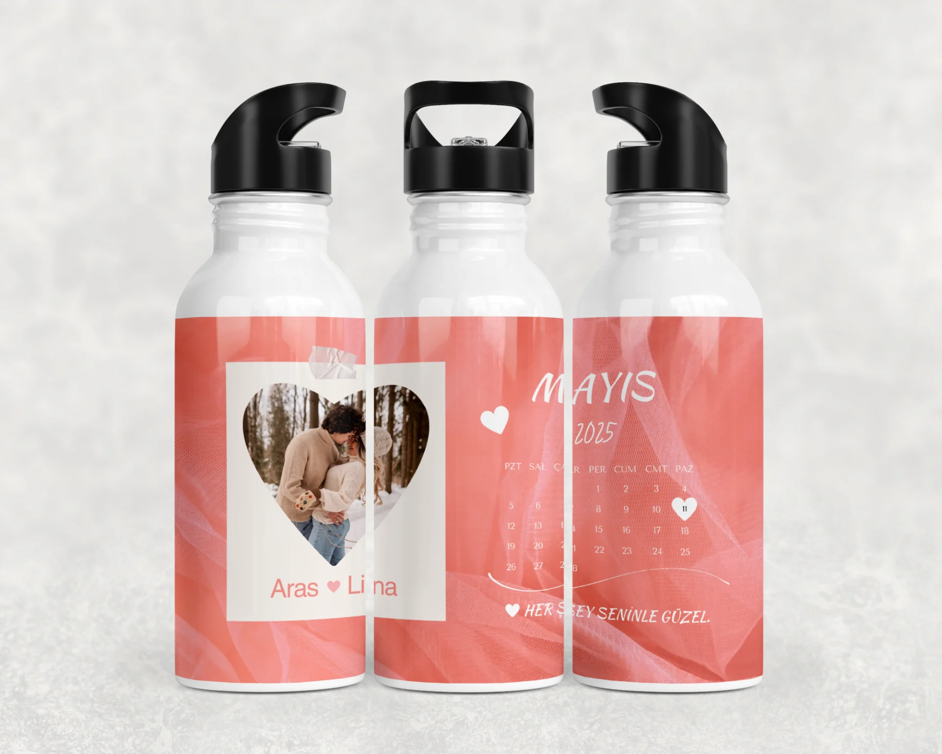 Somon-pembe tül doku zemin, kalp kesimli polaroid fotoğraf ve takvimde özel gün kalp işareti ile romantik tasarım. 600 ml termos, 600 ml matara, 11 oz kupa; isimler/mesaj ve ay-yıl/özel tarih kişiselleştirme yapılır, hediye paketi ve not kartıyla gönderilir.