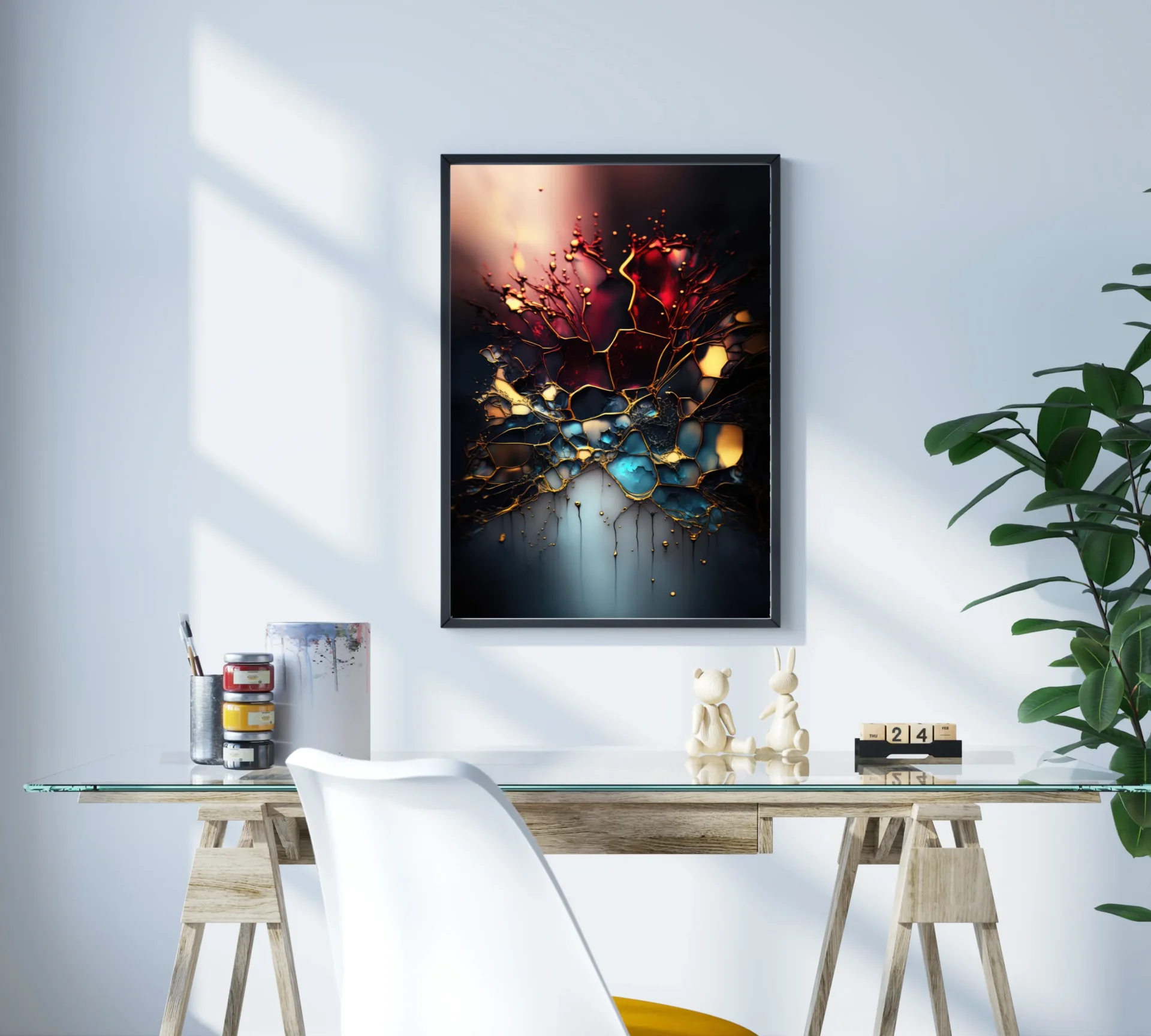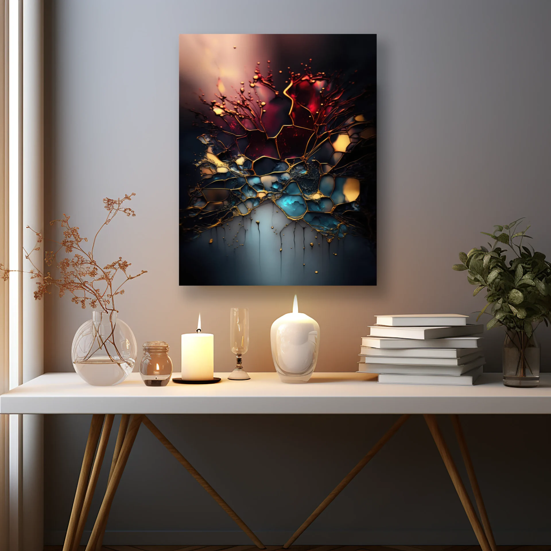 Kırık camı andıran yapılar ve loş renk geçişleriyle gizemi vurgular. Derinlikli mekanlar için dramatik bir seçim.