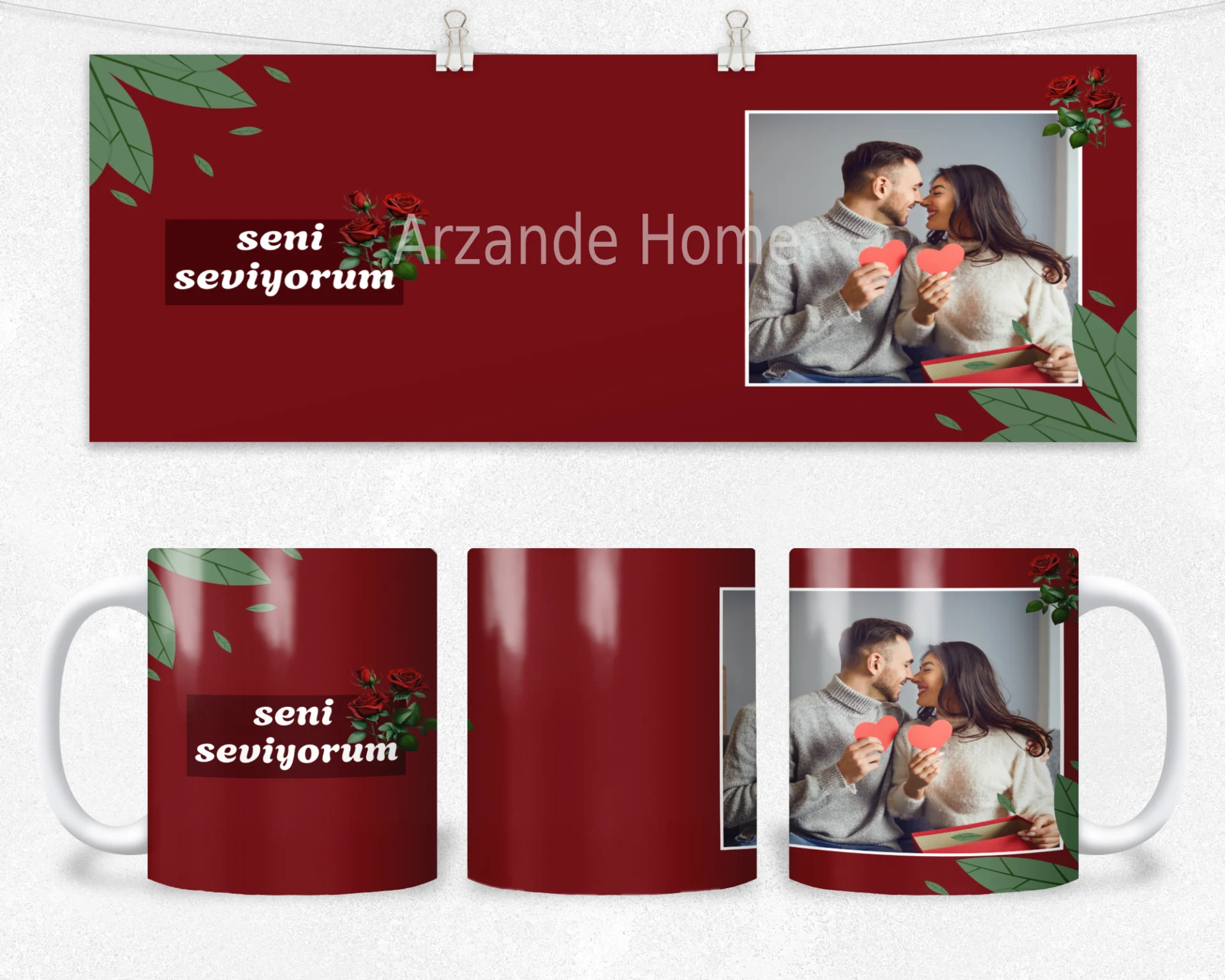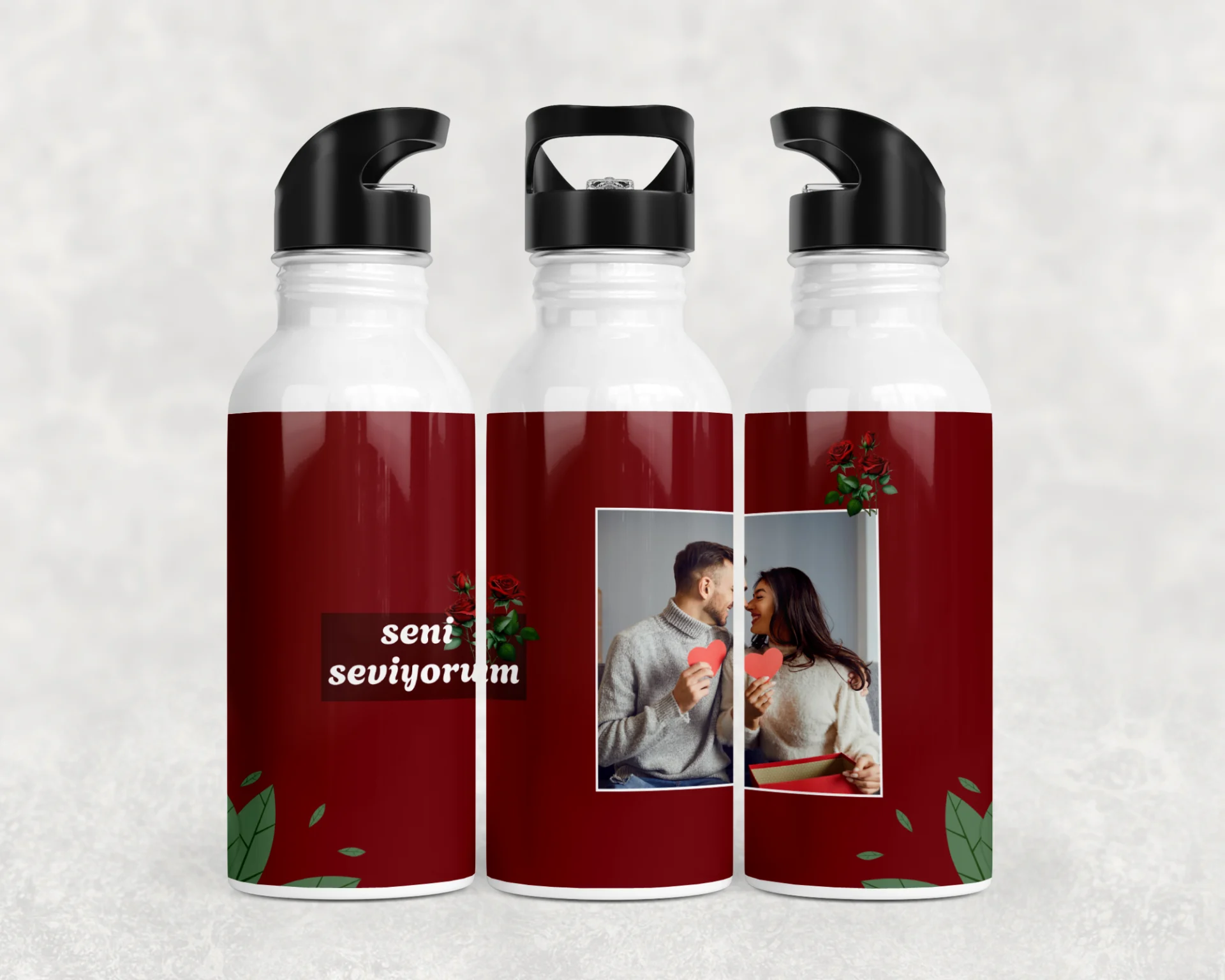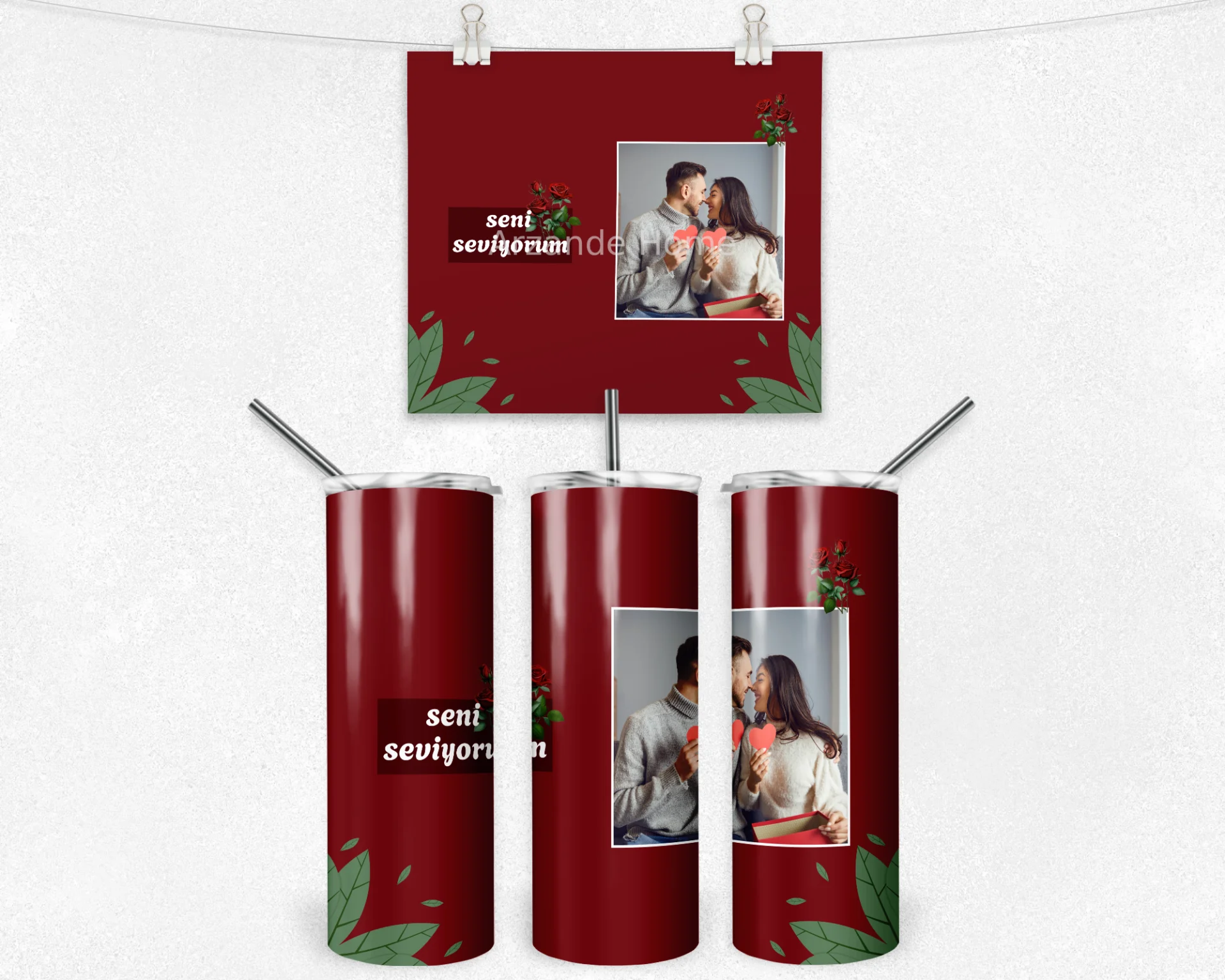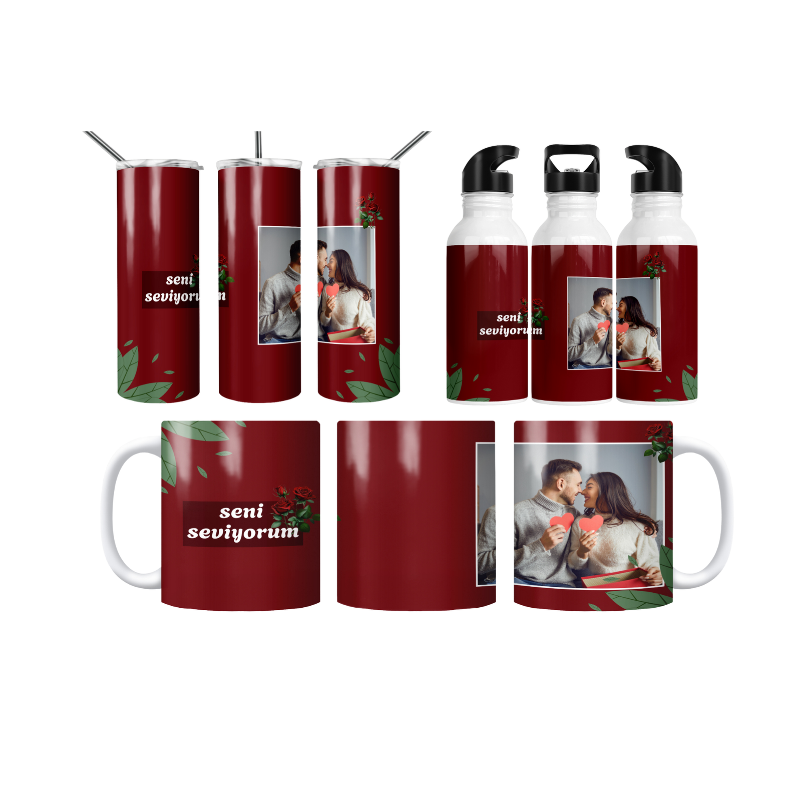 Bordo zemin, kırmızı gül detayları ve fotoğraf çerçevesiyle romantik tasarım; Sevgililer Günü ve yıldönümü için ideal. 600 ml termos, 600 ml matara, 11 oz kupa; ad/mesaj/tarih kişiselleştirme yapılır, hediye paketi ve not kartıyla gönderilir.