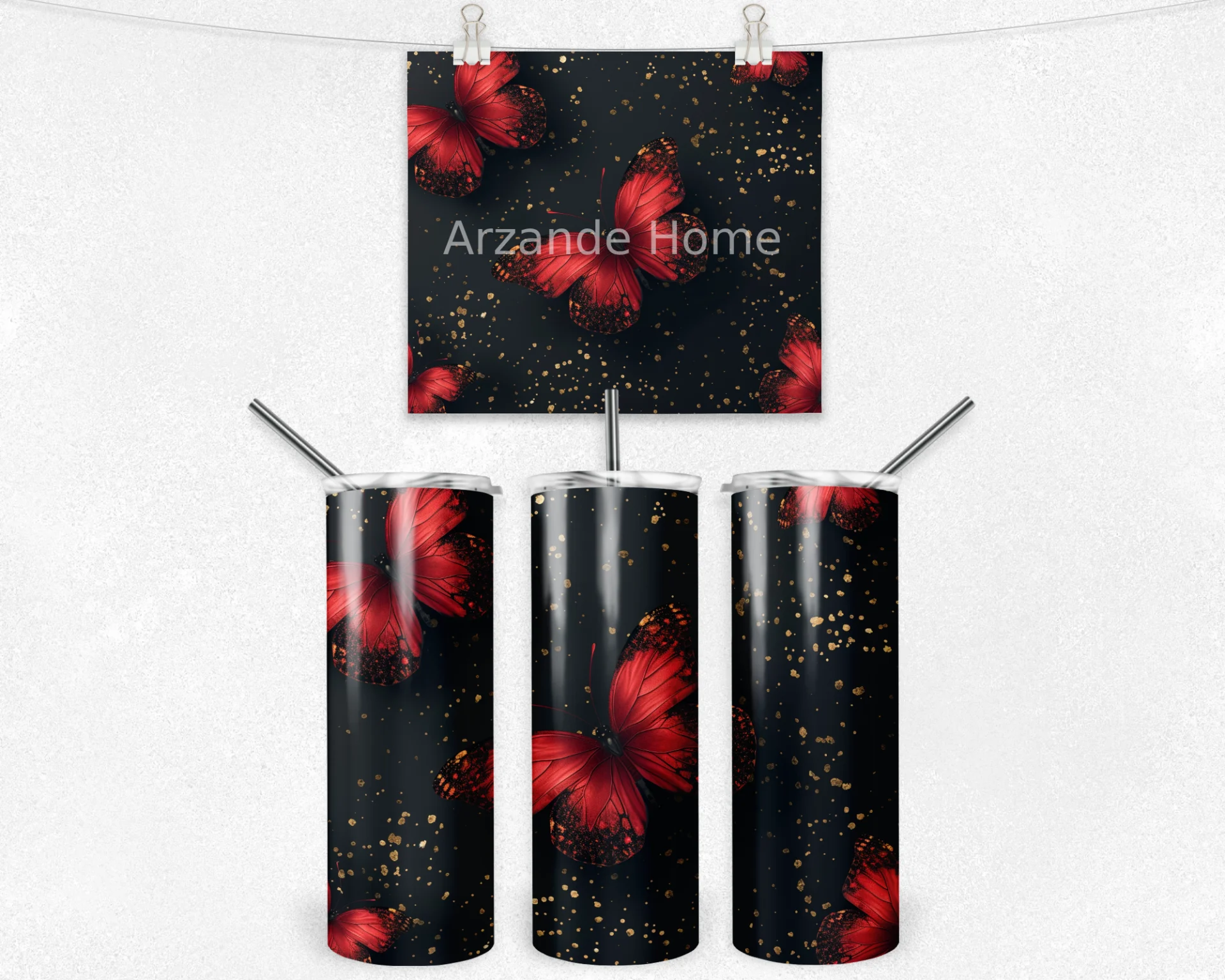 Siyah fon üzerinde zarif kırmızı kelebekler ve altın yansımalarla şık bir tasarım. Gece şıklığını günlük hayatınıza taşıyın.