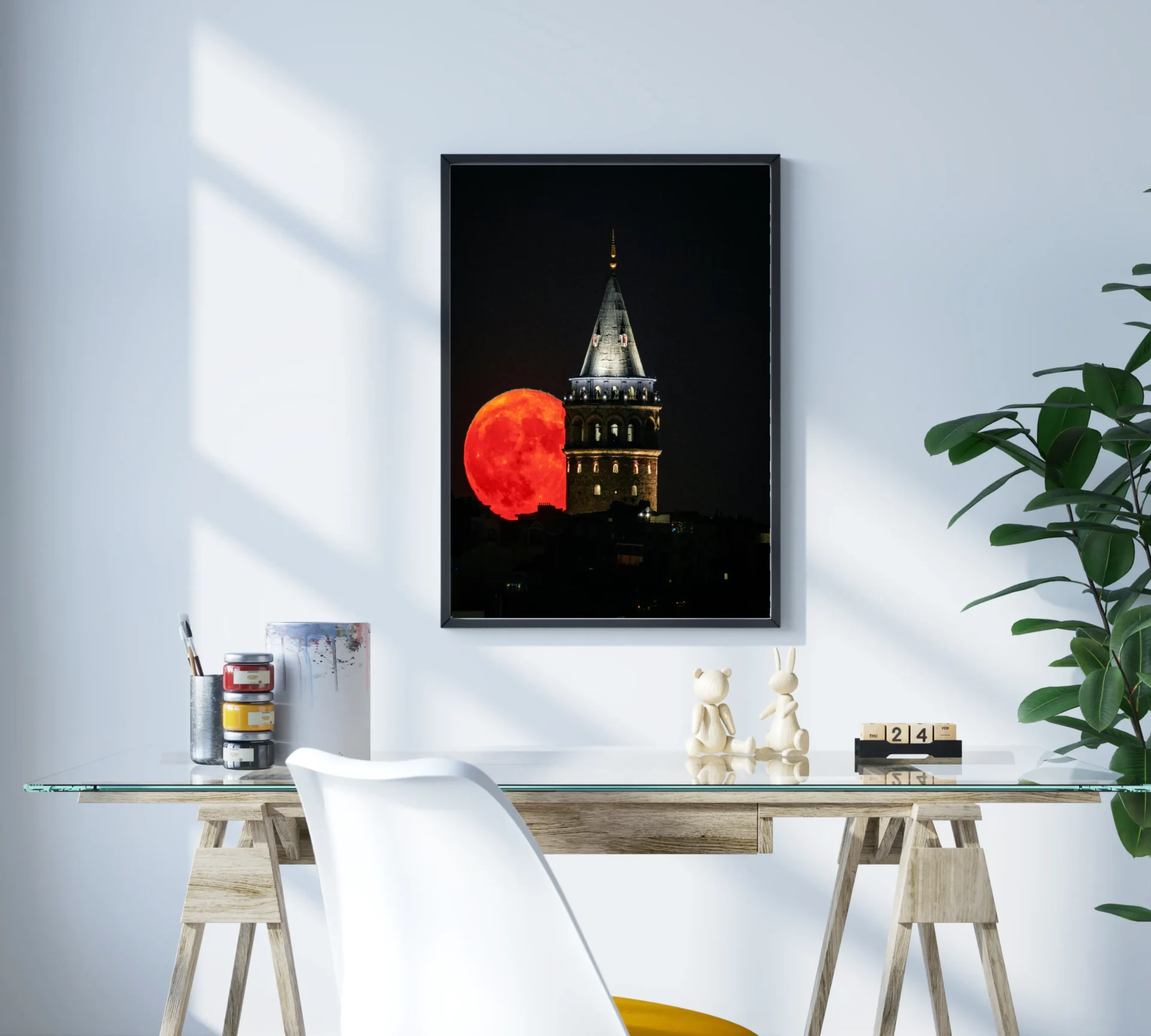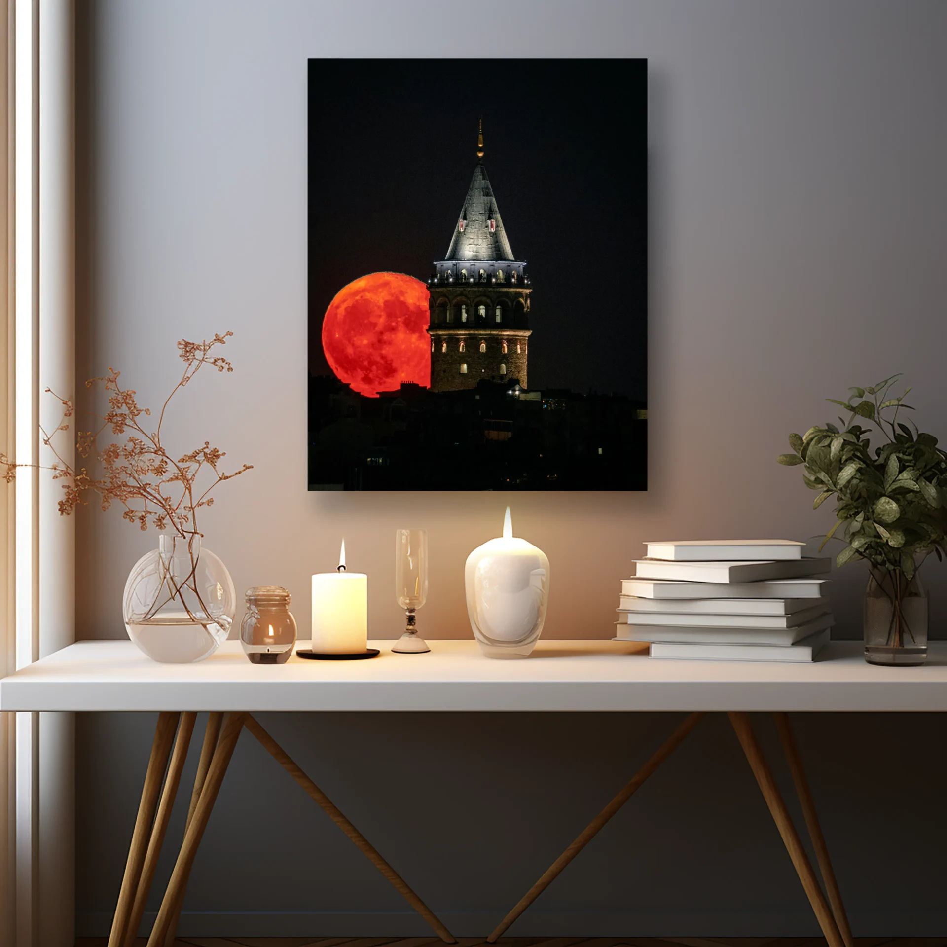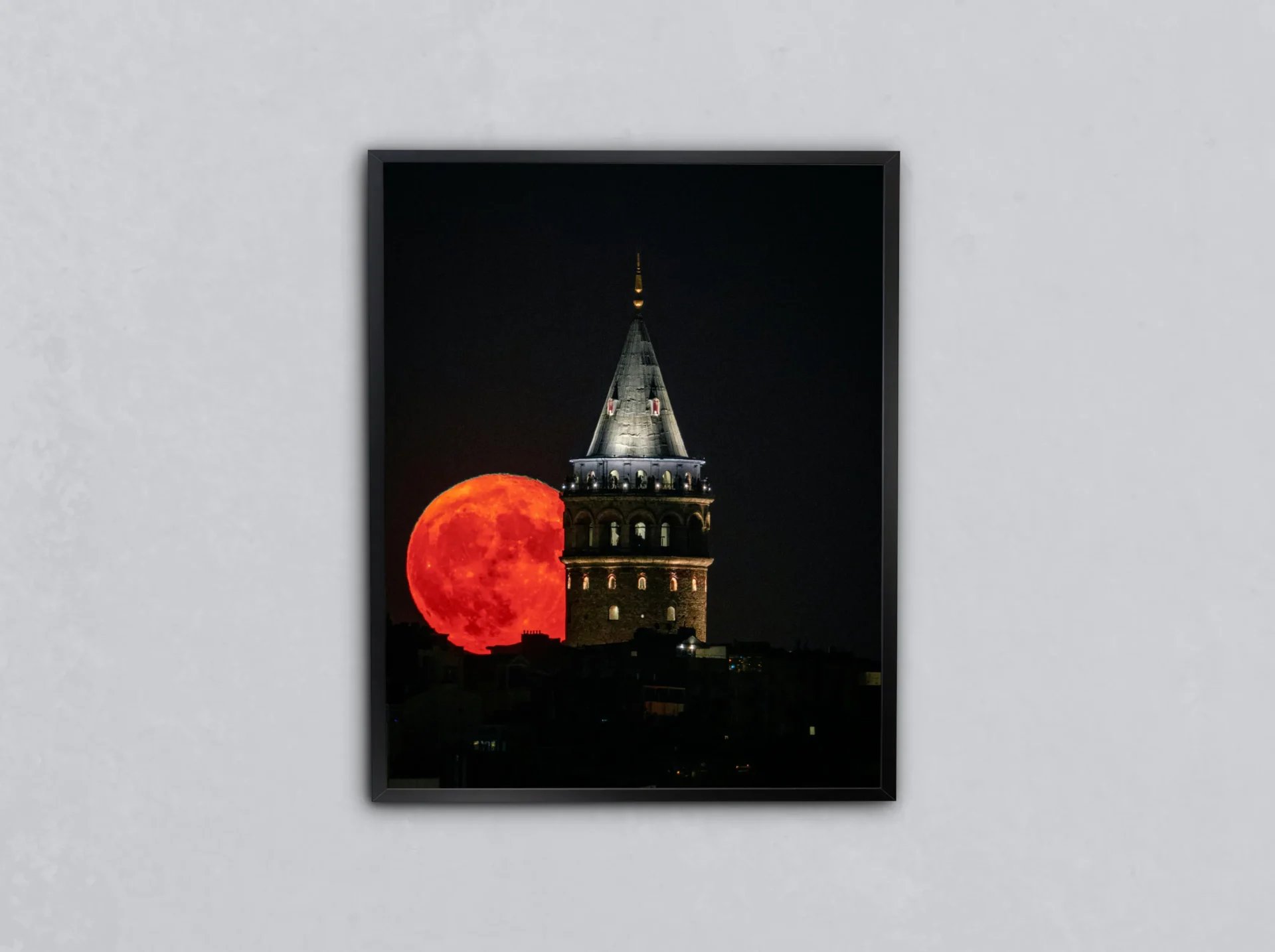 Geceyi delen bir kule ve kızıl ayın gökyüzündeki hakimiyetiyle bu sahne, efsanelere konu olacak bir gecenin yansımasıdır. Gizem ve görkem bir aradadır.