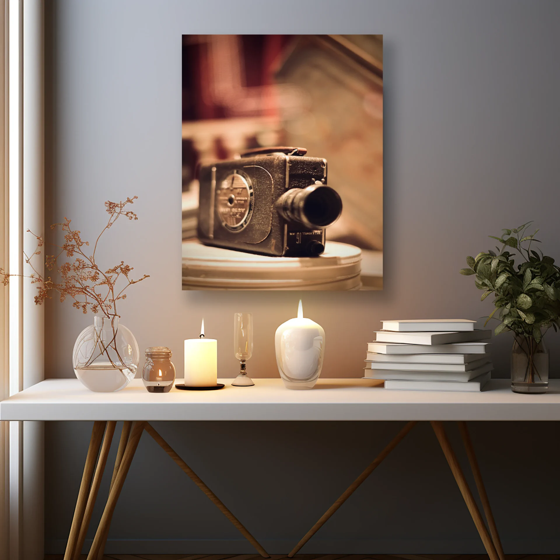 Eski bir kamera sıcak bir ışıkla aydınlatılmış. Sinema tutkunlarının bayılacağı retro bir detay.