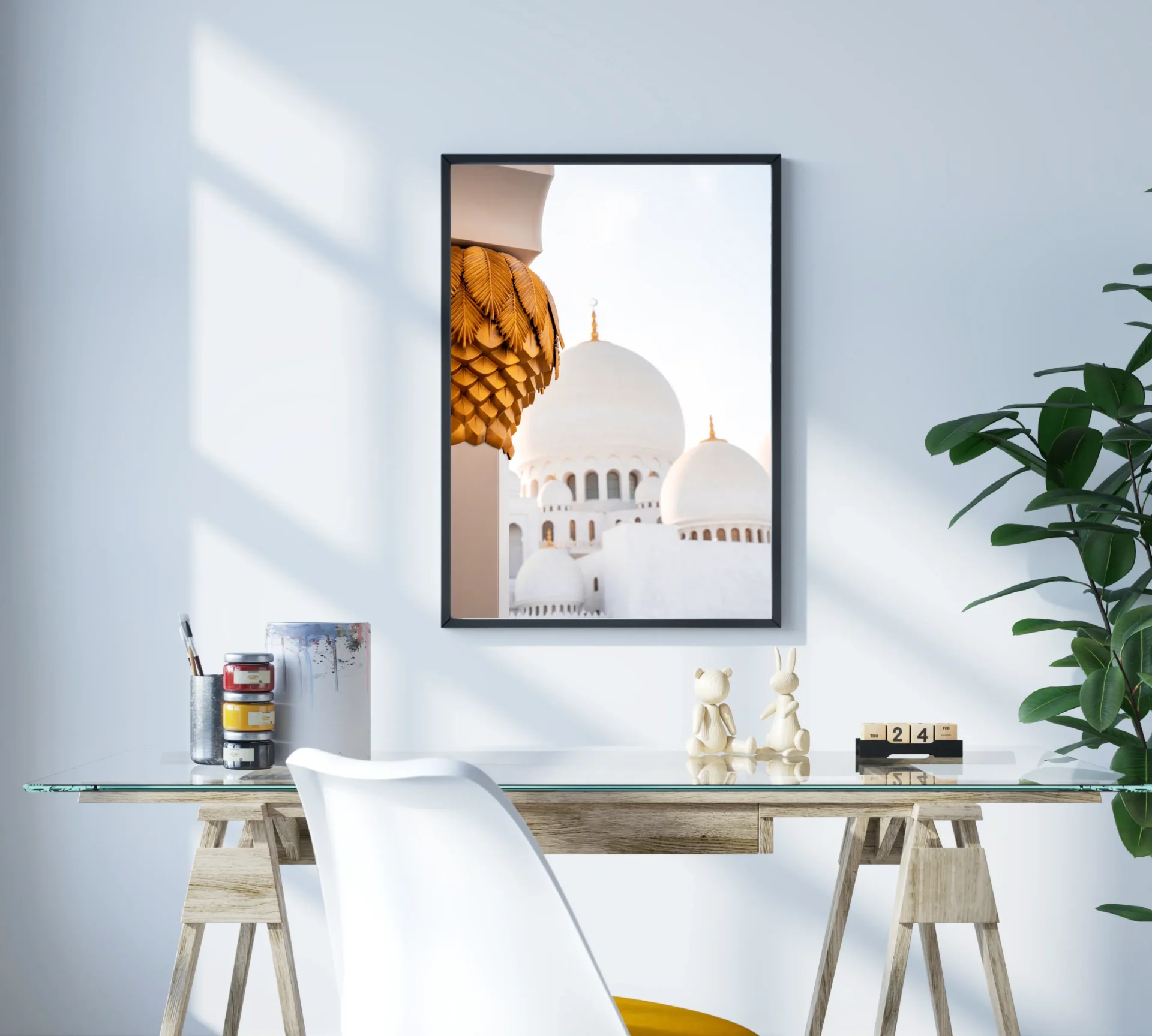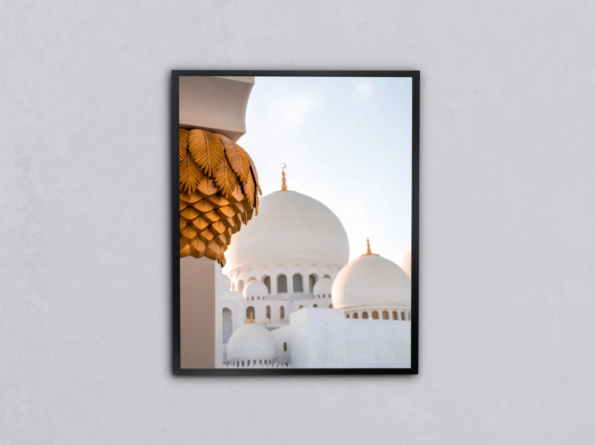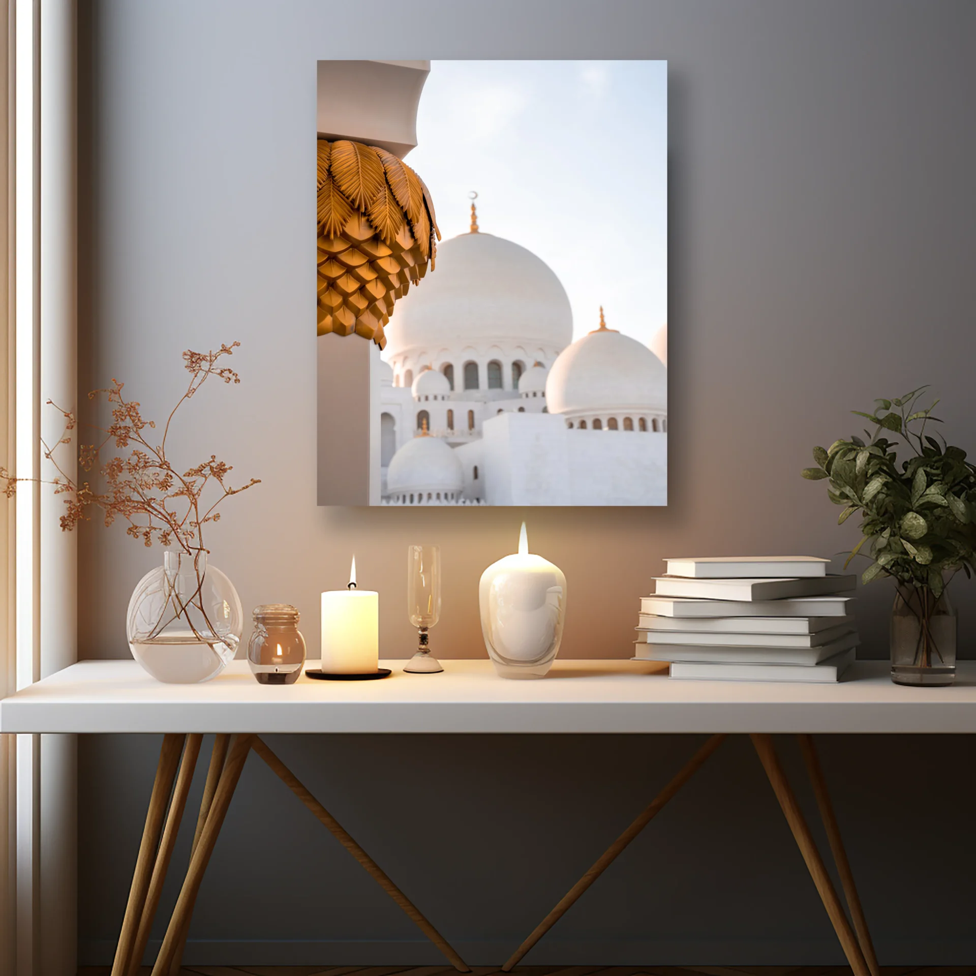 Sabahın ilk ışıkları beyaz kubbeler üzerinde süzülürken bu tablo huzur ve maneviyatı yansıtıyor. İslam mimarisinin sade ve etkileyici duruşu evinize mistik bir atmosfer katıyor.