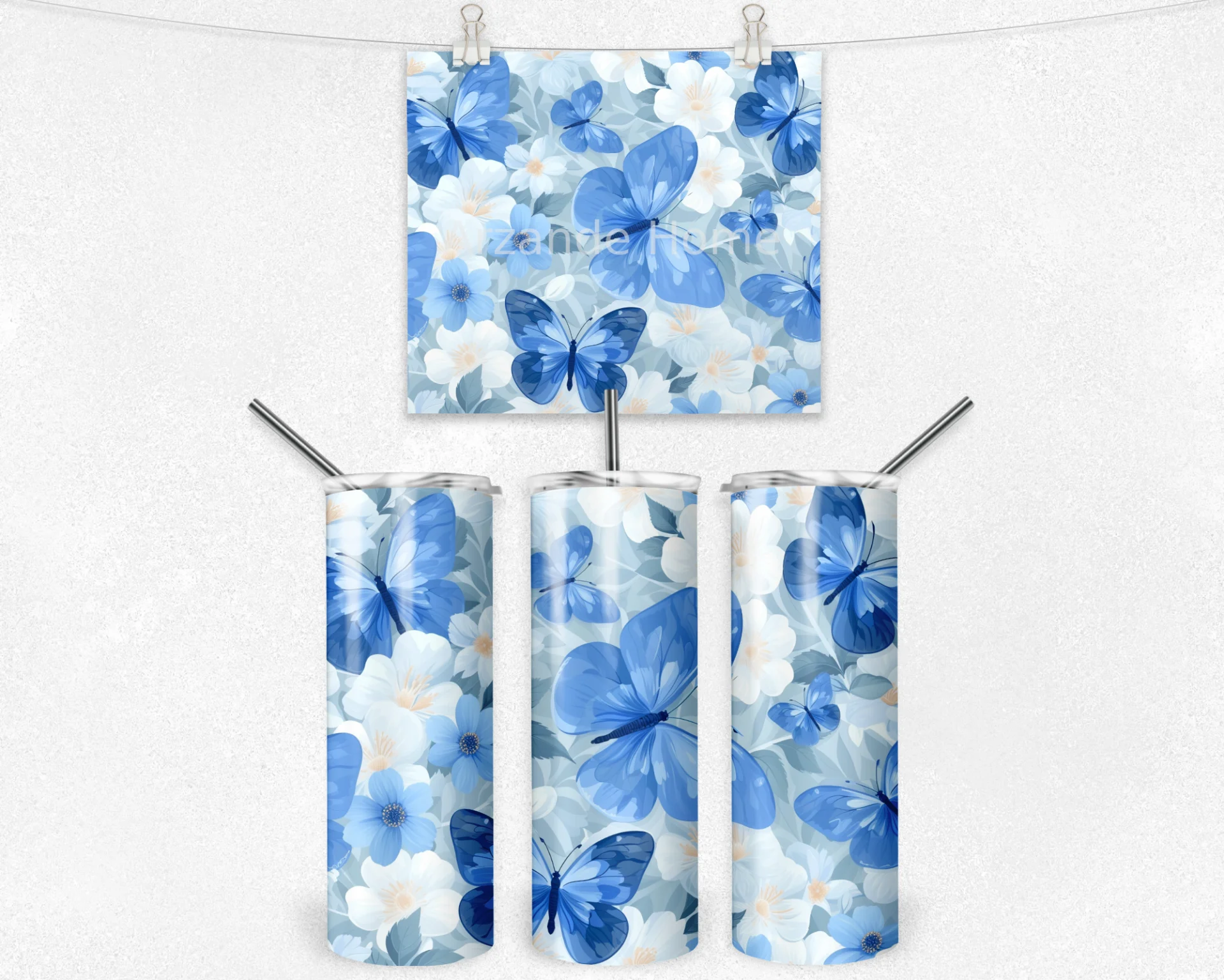 Gökyüzü tonlarındaki kelebekler ve çiçeklerle zarif ve huzur verici bir tasarım.