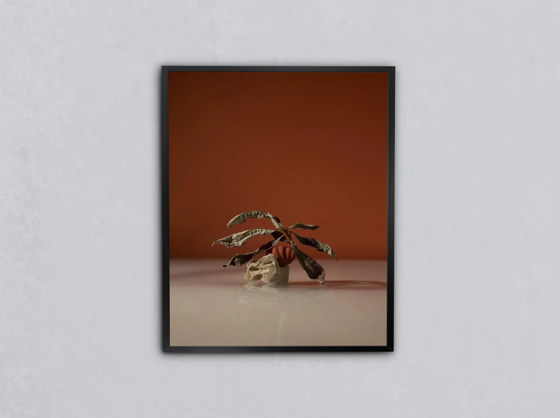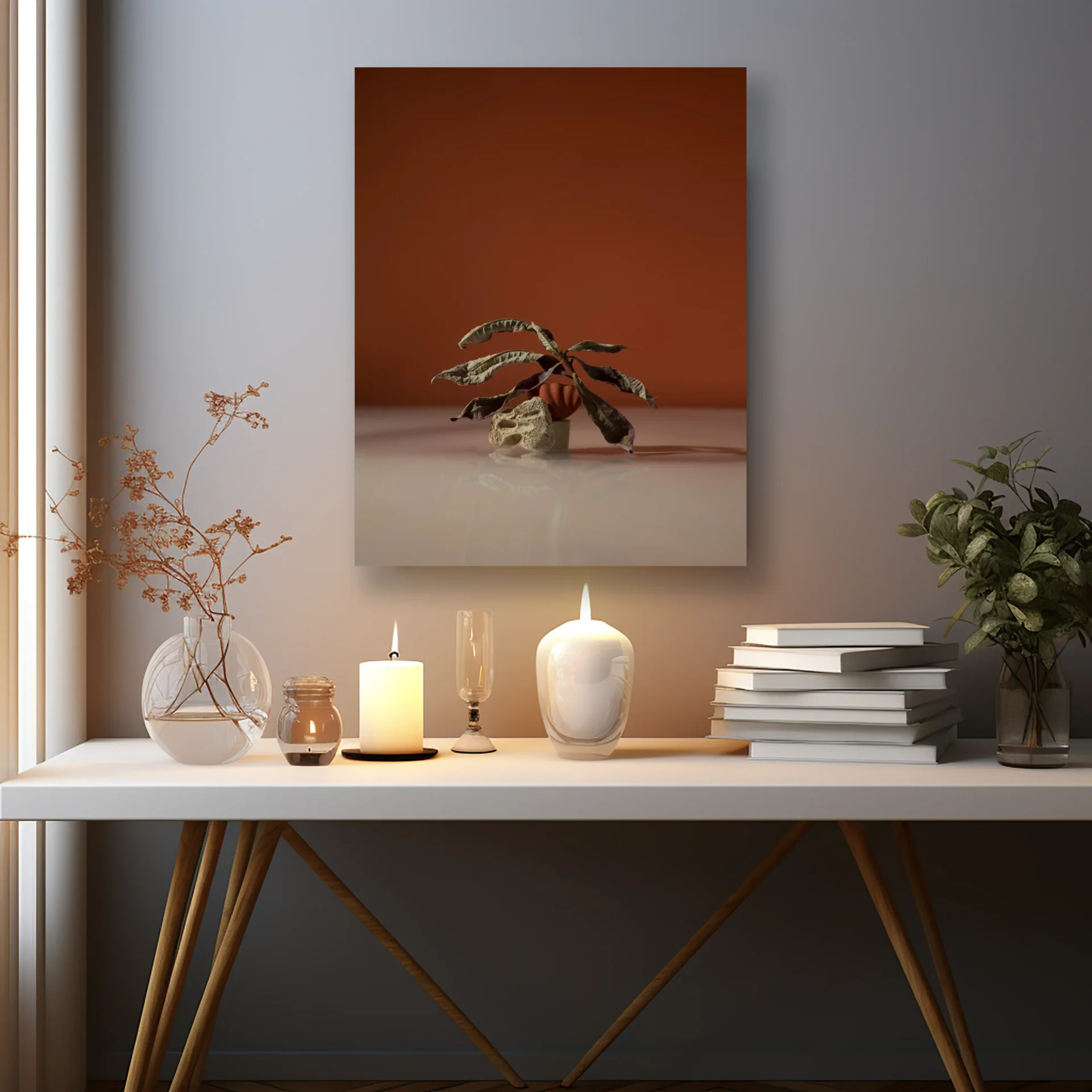 Sade arka plan üzerinde kuru çiçek vurgusuyla modern atmosfer.