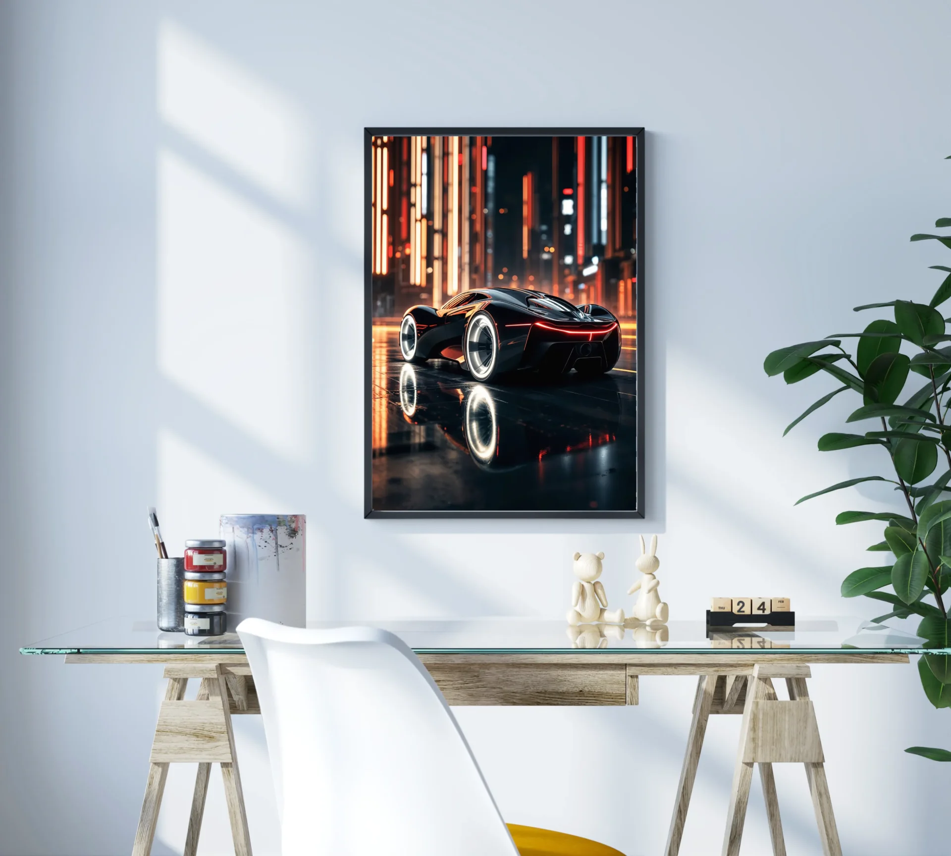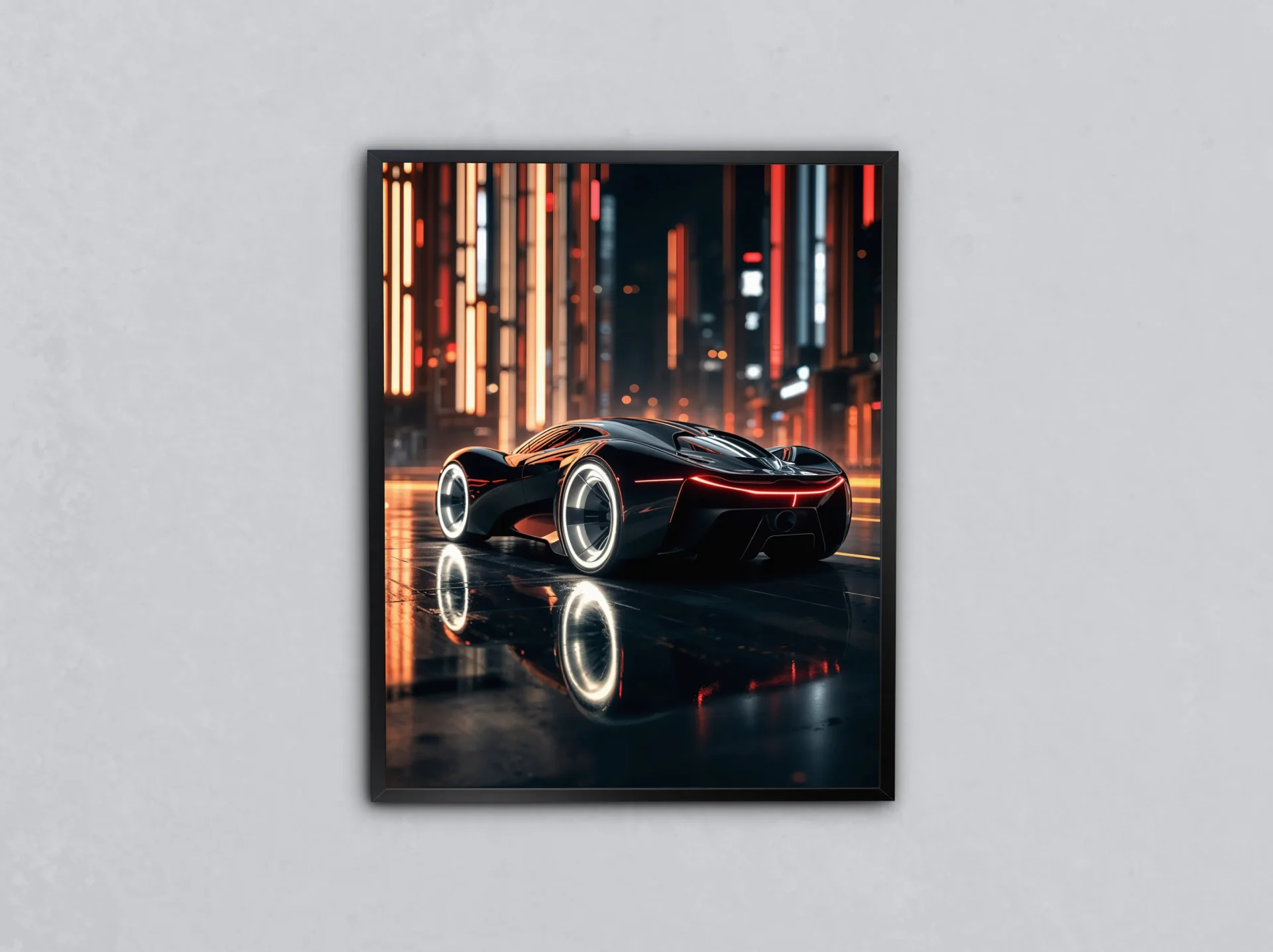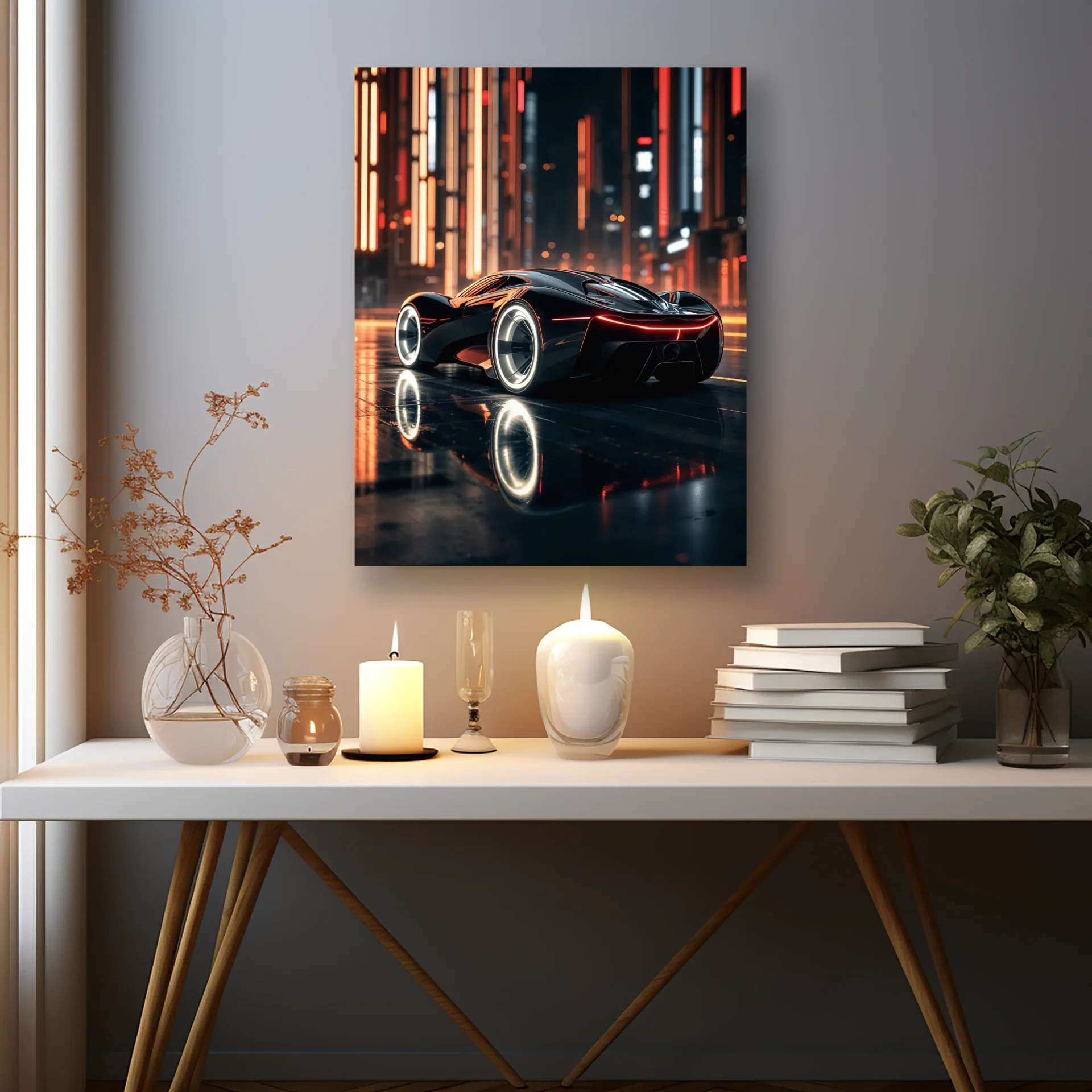 Geleceğin sokaklarında ilerleyen hiper araba, neon ışıklarla yarışıyor. Teknolojiyle hızın dans ettiği bu tasarım, modern dekorlar için ideal.