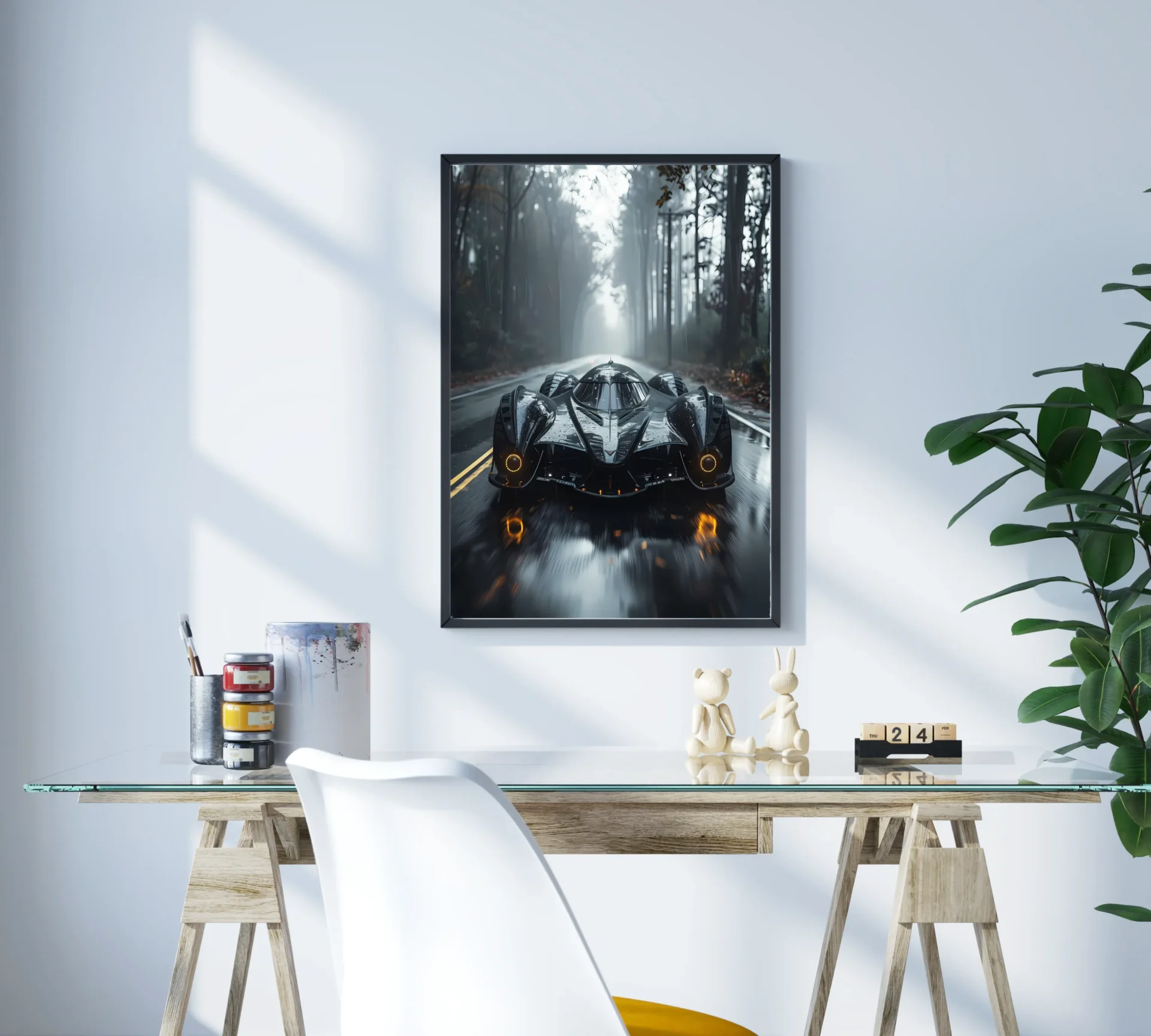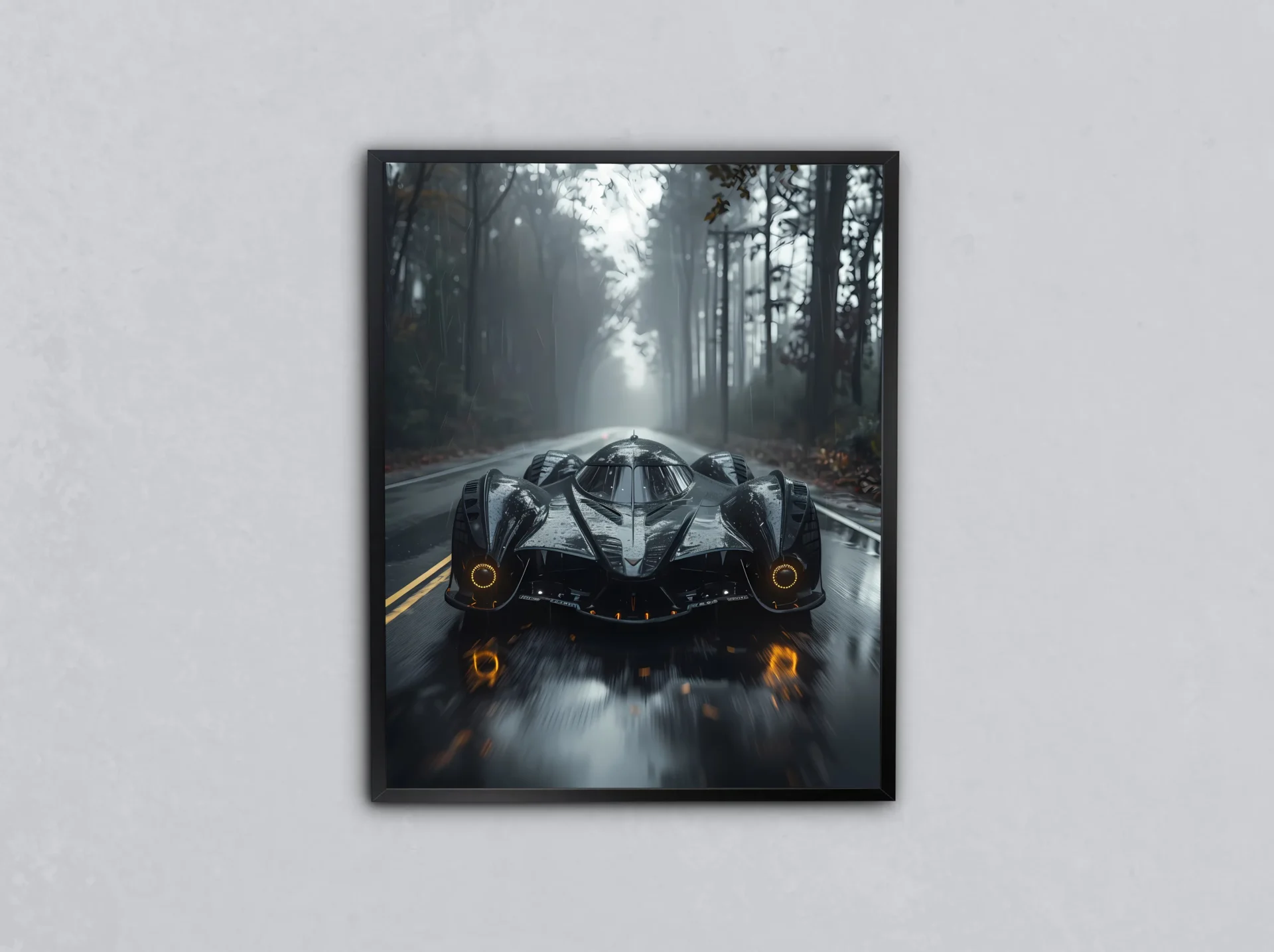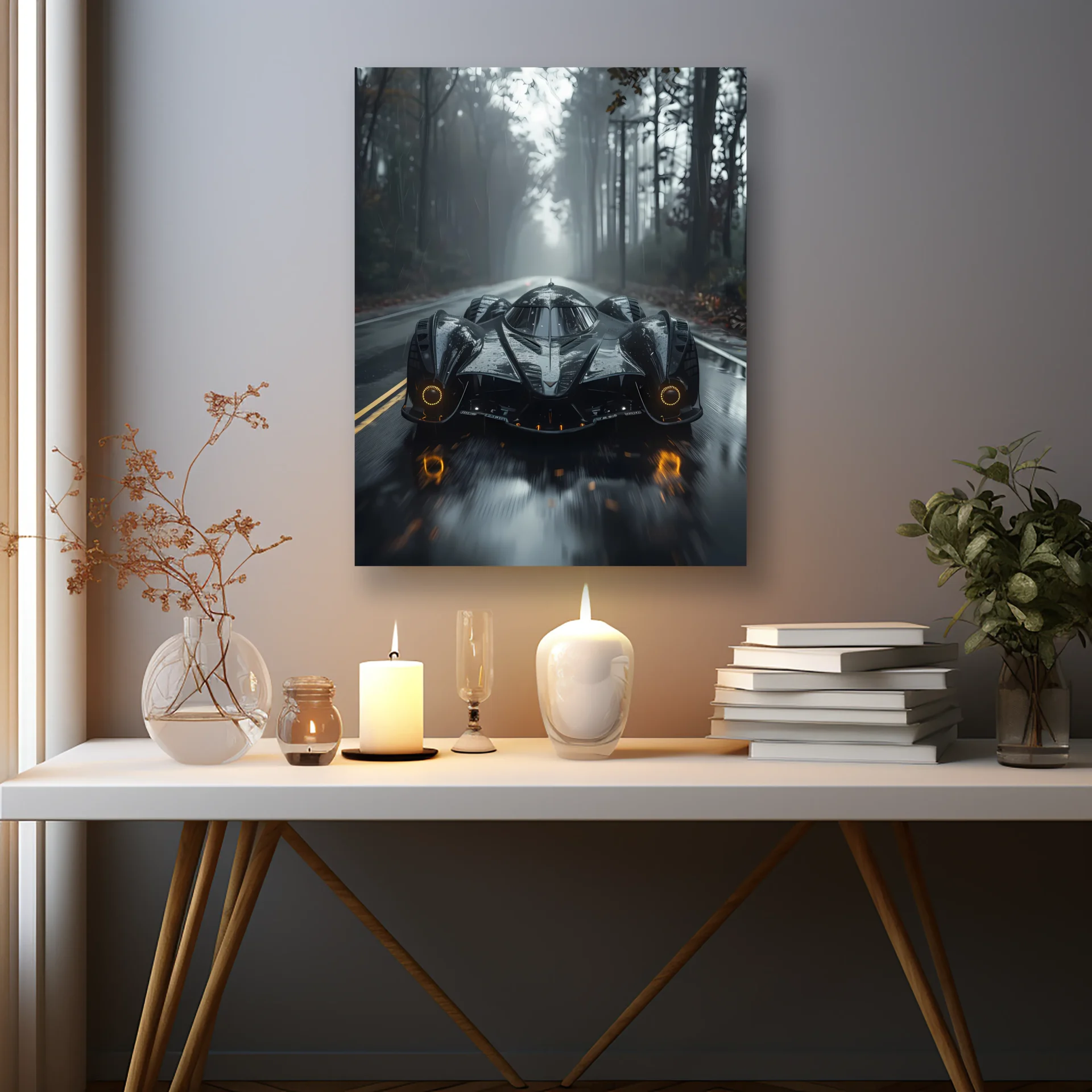 Kaslı tasarımıyla ormanda ilerleyen bu spor araba, doğayla yarışıyor. Güç ve estetik, bu Metal Tabloda benzersiz bir uyum içinde.