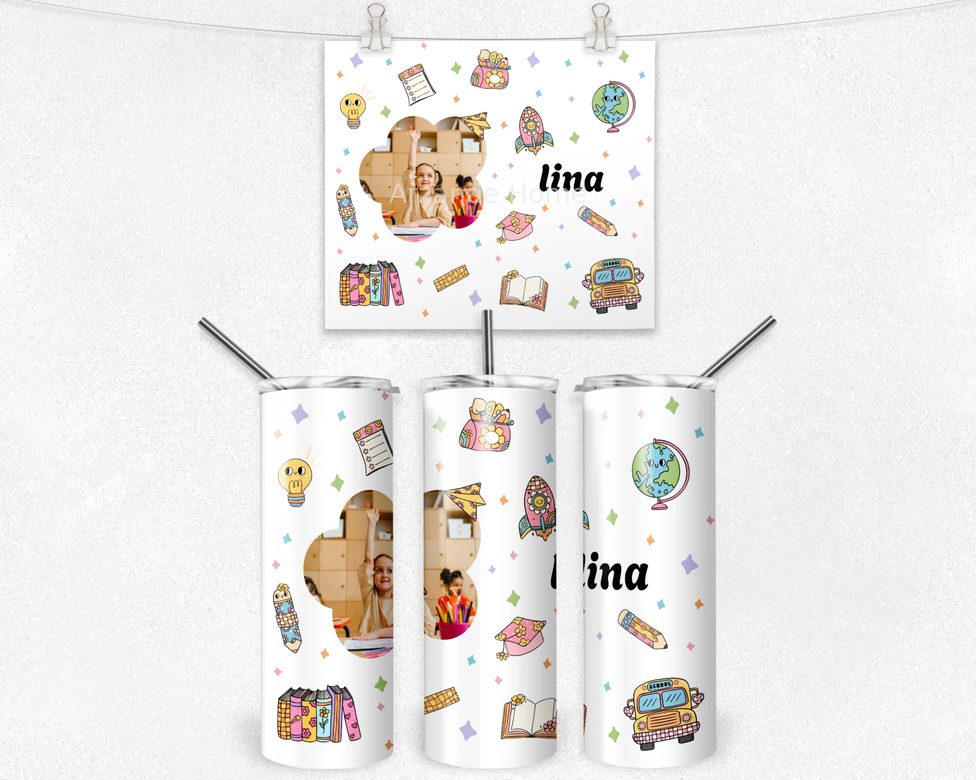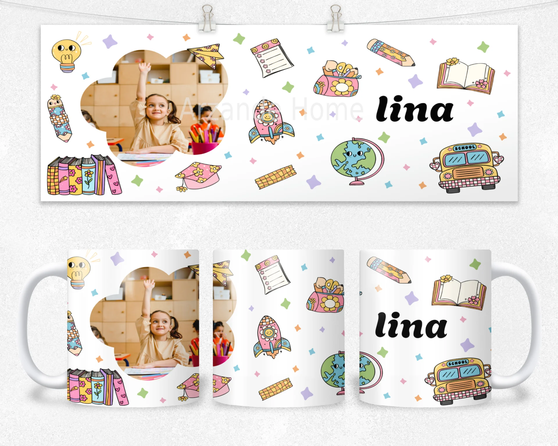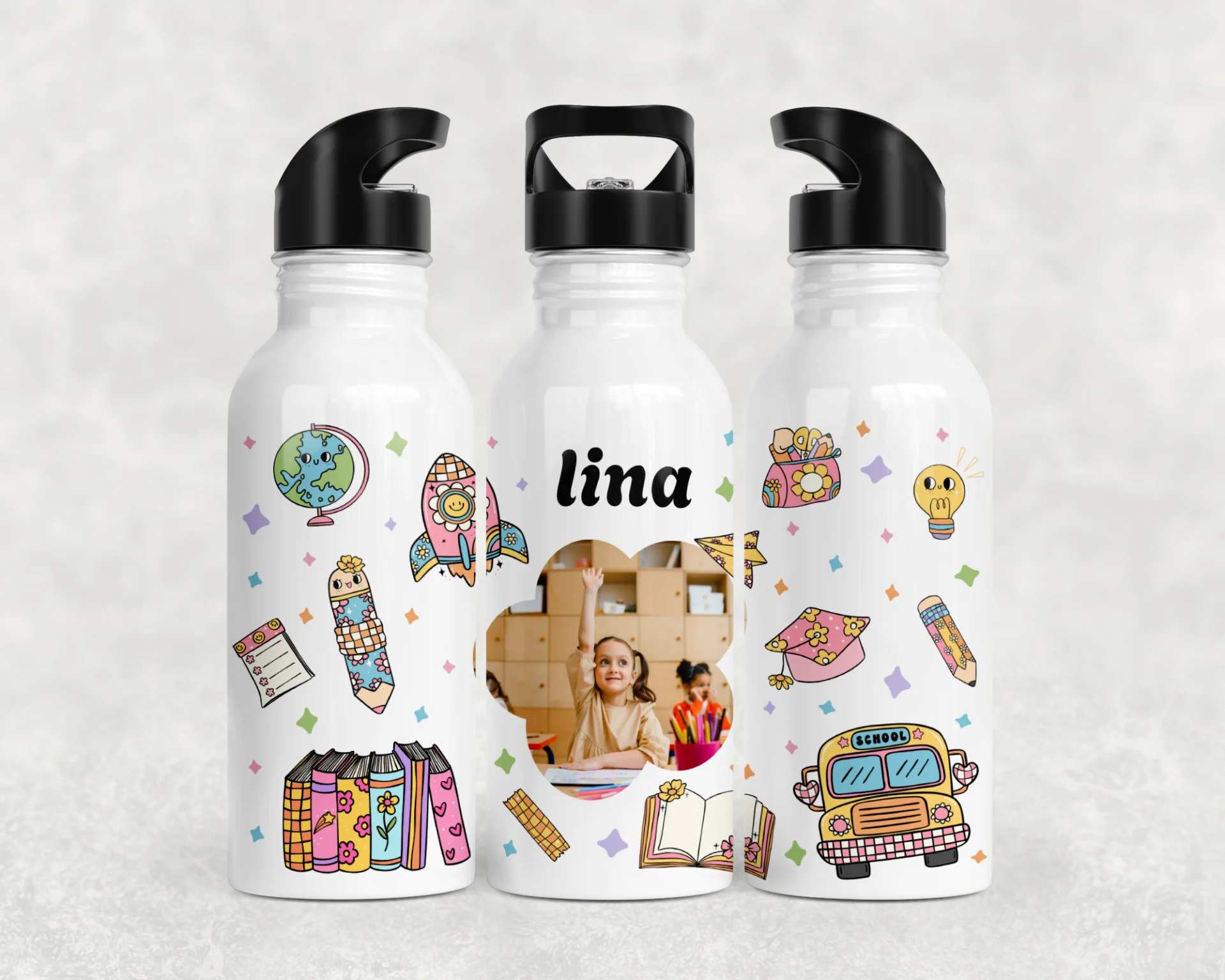 Beyaz zemin üzerine pastel okul çizimleri (roket, otobüs, küre, kalem) ve çiçek formunda fotoğraf penceresi; ortada isim yazımı ile tam kişisel. 600 ml termos, 600 ml matara, 11 oz kupa; isim/mesaj baskısı yapılır, hediye paketi ve not kartıyla gönderilir.