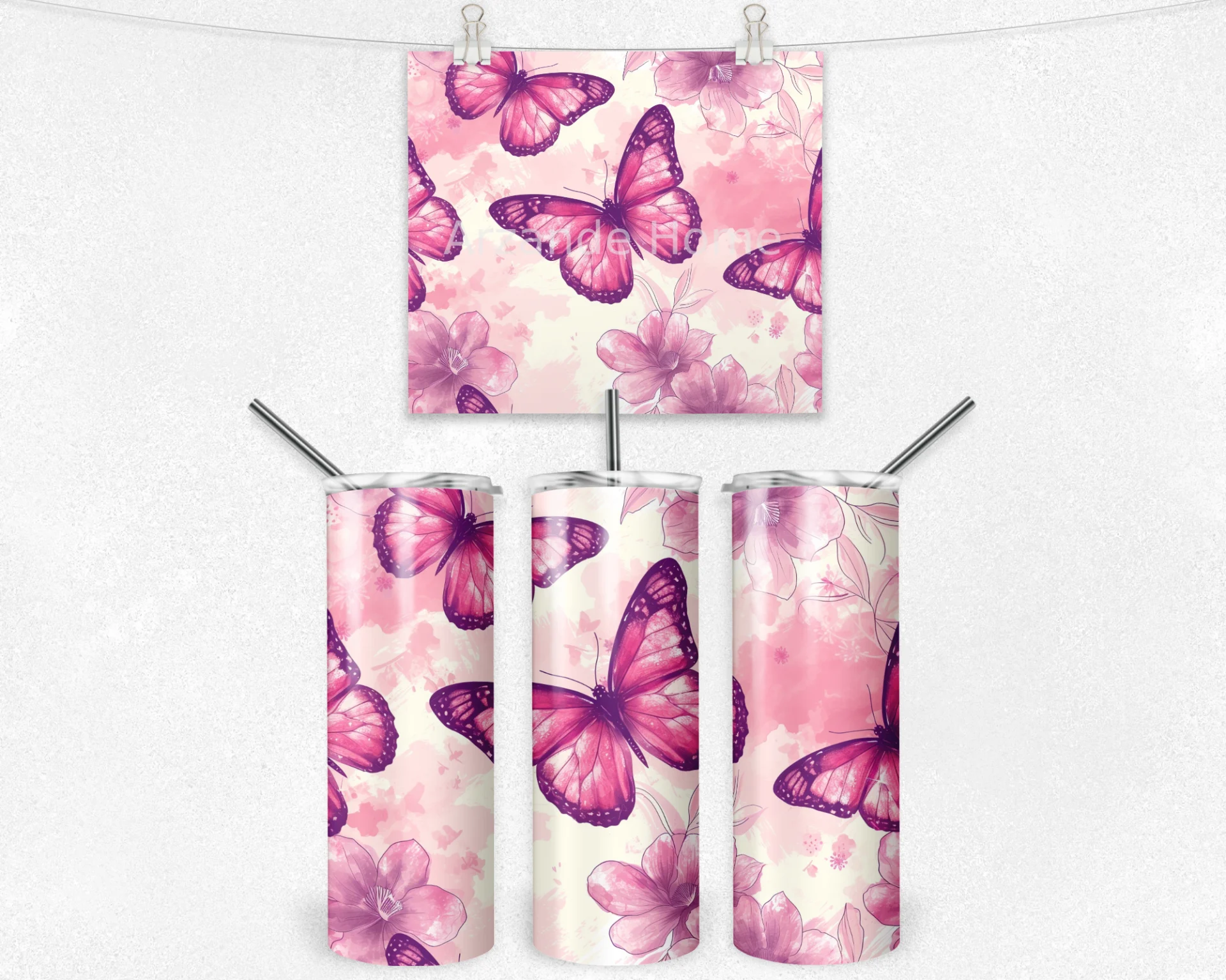 Pastel pembe tonlarında çiçekler ve kelebekler romantik bir atmosfer yaratır. Günlük kullanımda zarafet sunar.