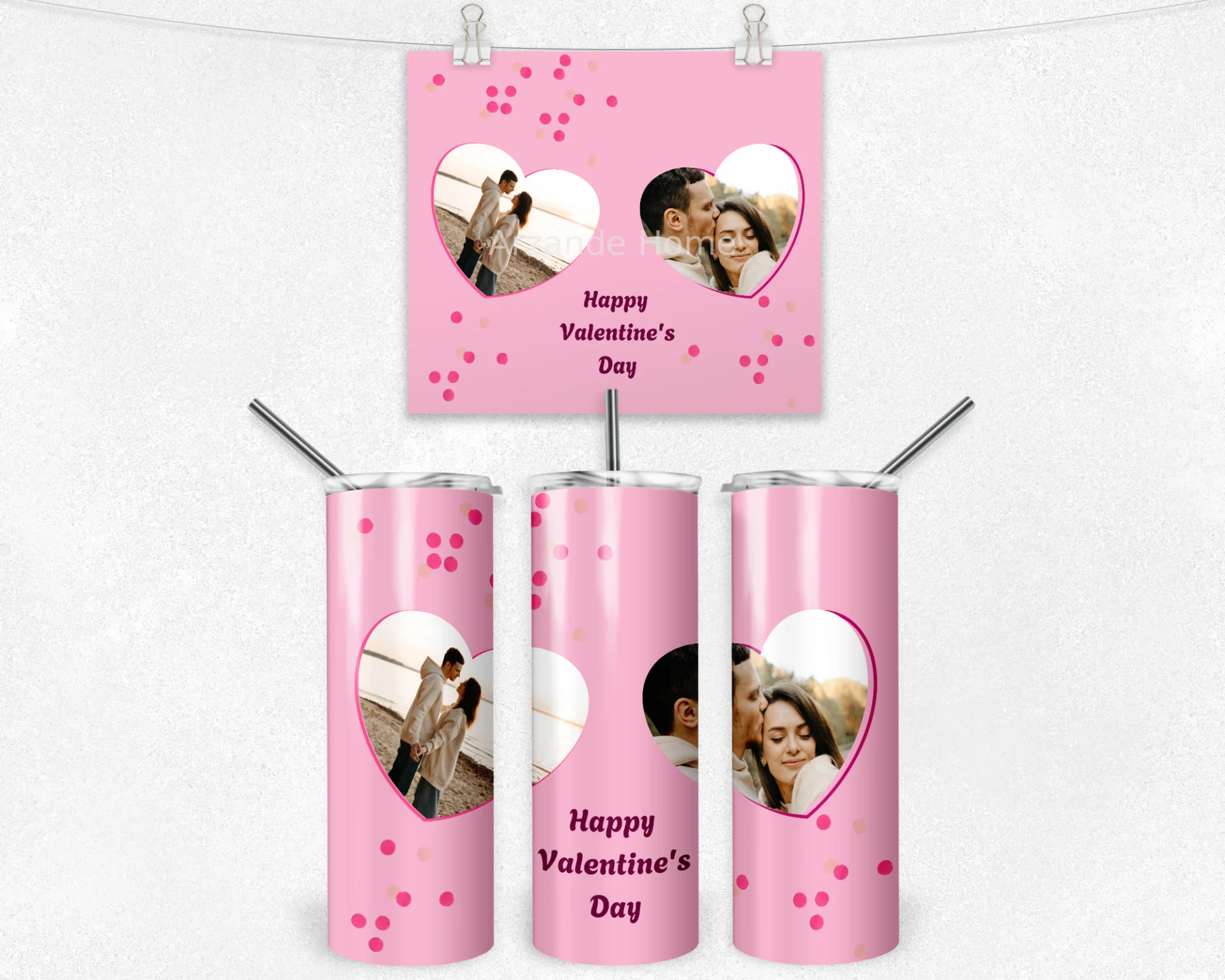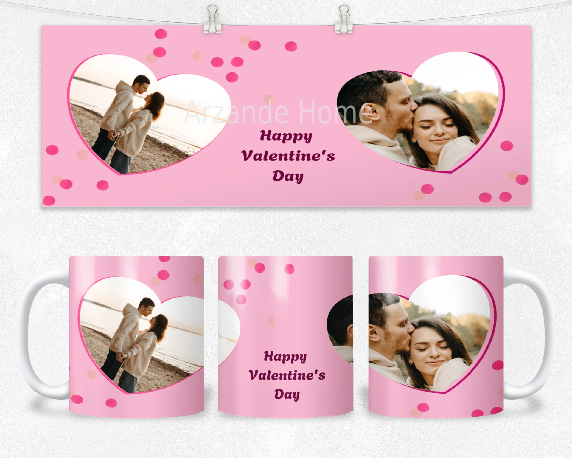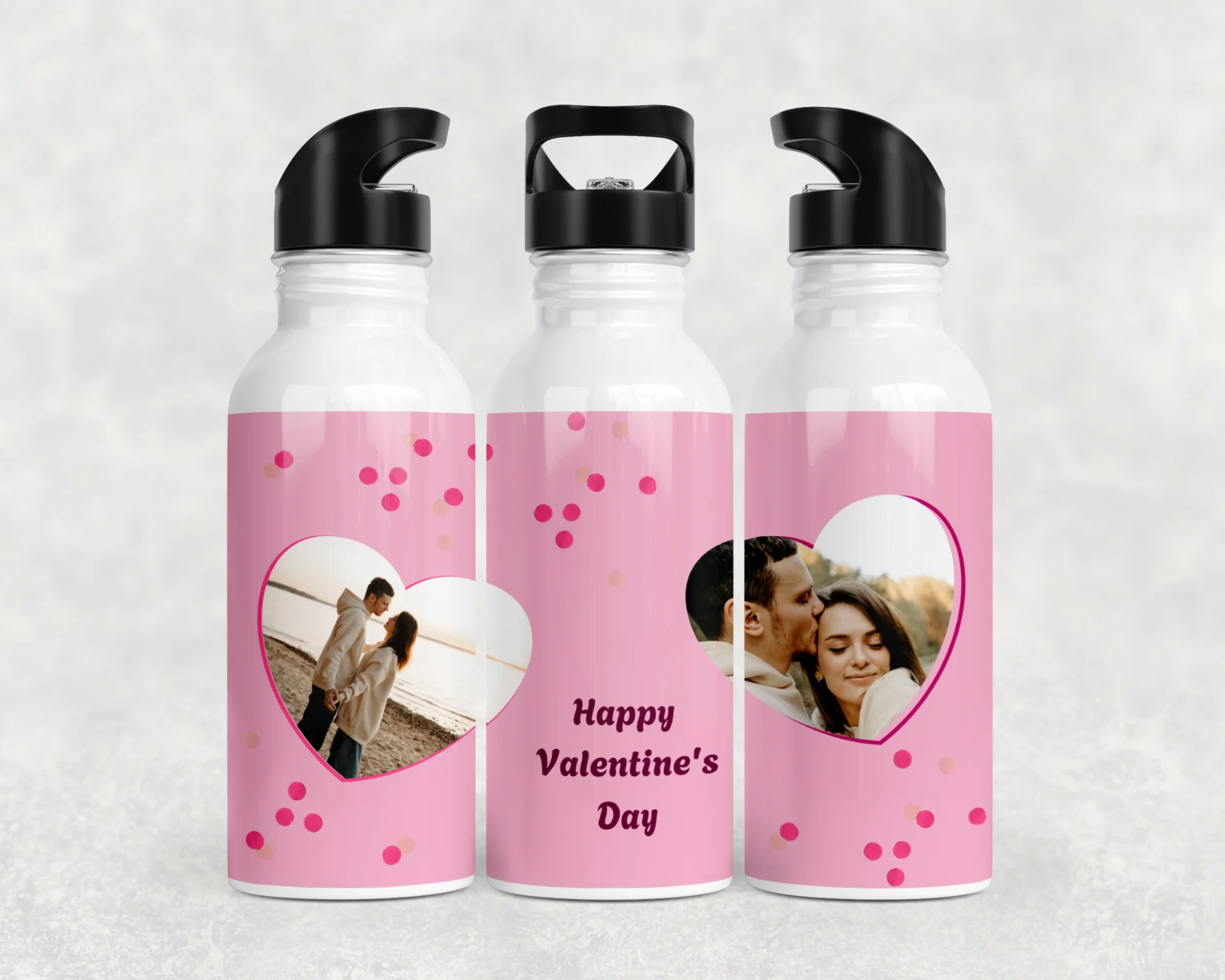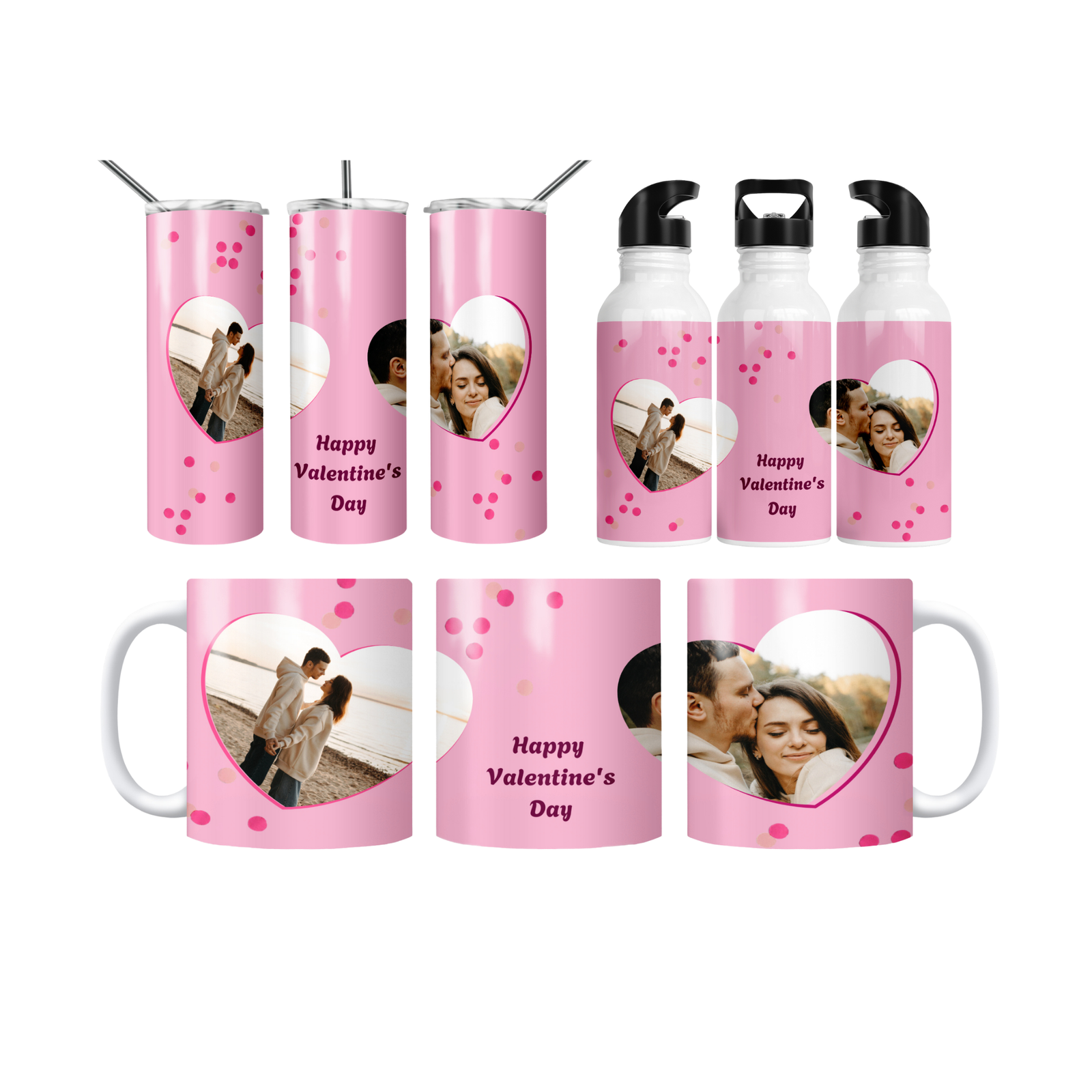 Pembe zemin, konfeti noktalar ve iki kalp biçimli fotoğraf alanıyla romantik tasarım. 600 ml termos, 600 ml matara, 11 oz kupa içerir. İsim/mesaj/tarih kişiselleştirme yapılır; hediye paketi ve not kartıyla gönderilir.