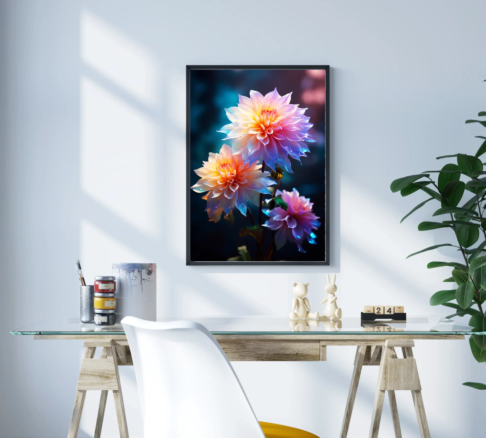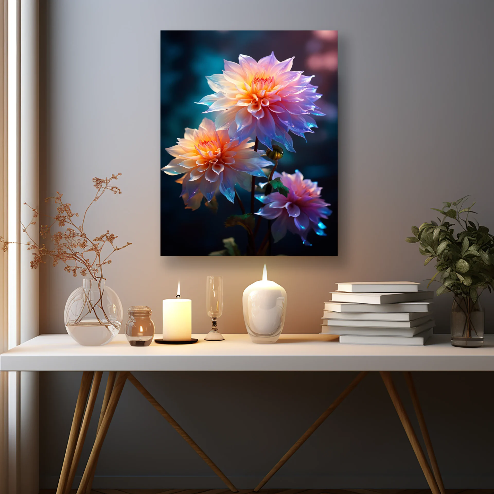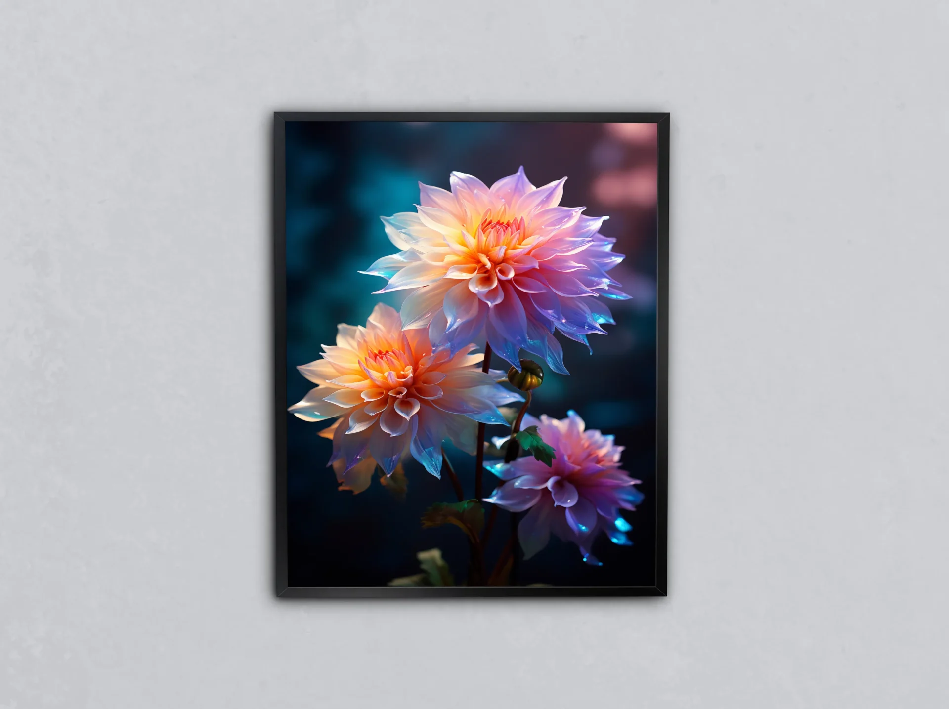 Canlı renklerde açmış çiçekler, gece fonunda adeta parlıyor. Enerjisi yüksek, dikkat çekici bir duvar dekorasyonu arayanlar için birebir.
