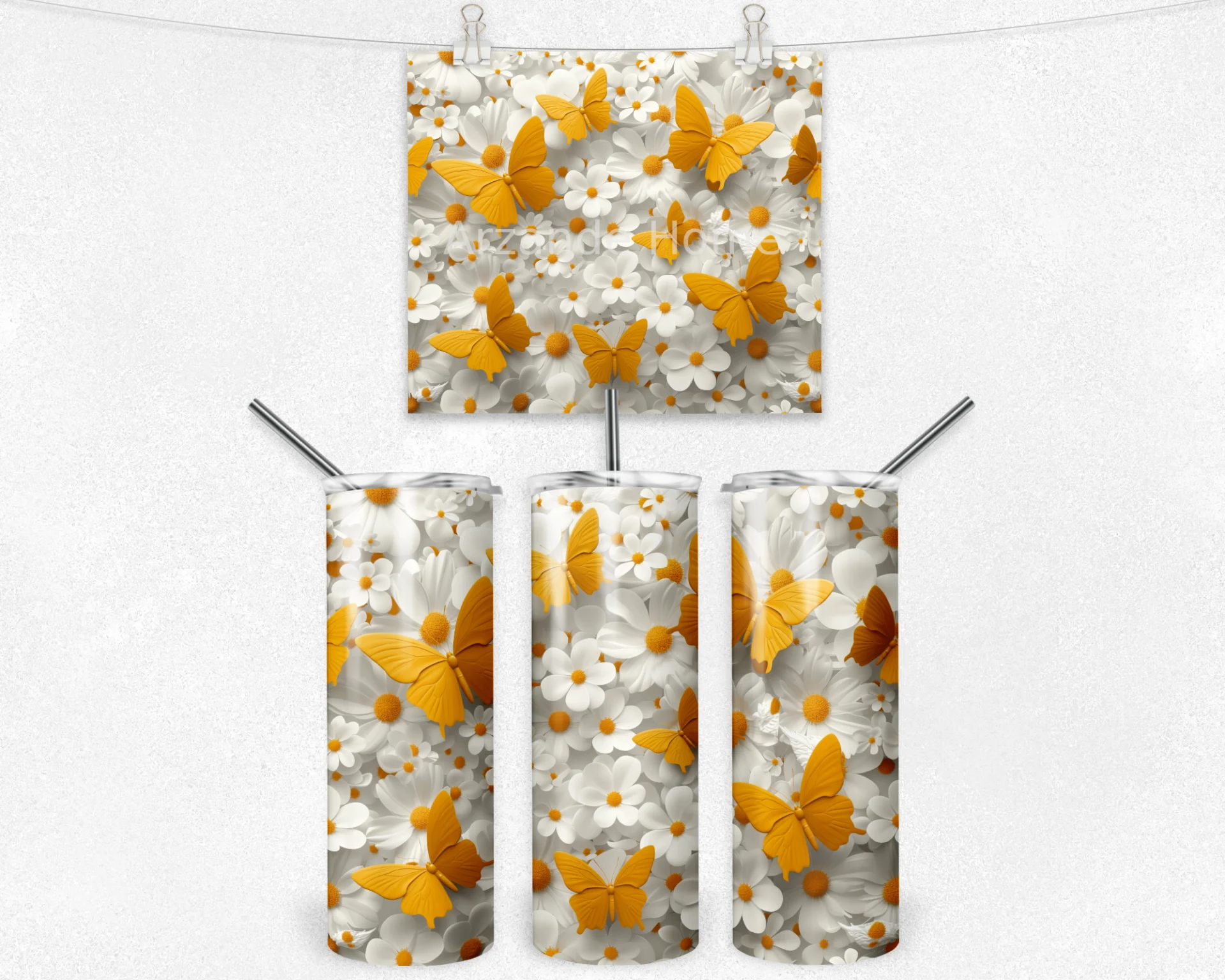 Canlı sarı kelebekler ve papatya desenleriyle doğanın zarafetini yanınızda taşıyın. Bahar ruhunu yansıtır.