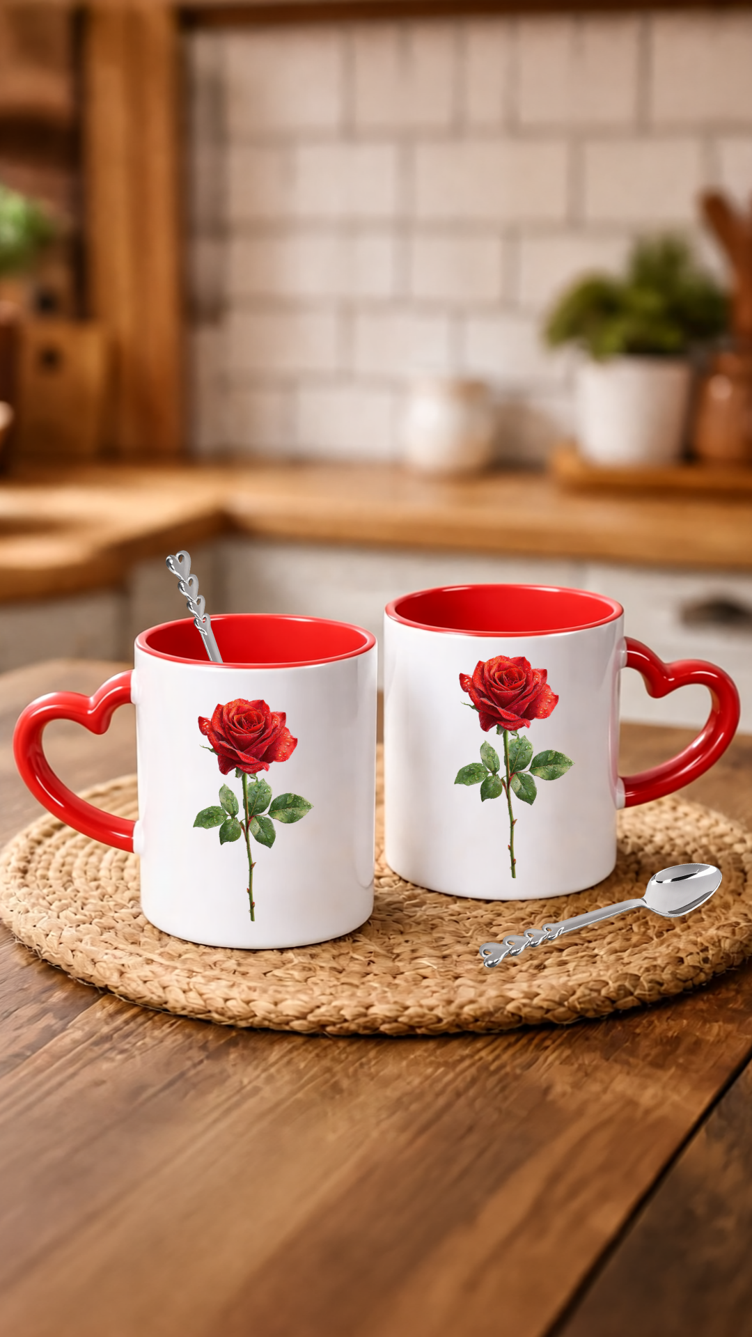Özel olarak tasarlanan kırmızı kalp desenli porselen kupa bardak, yanında kalpli kaşık hediyesi ve premium hediye kutusu ile romantik ve zarif bir hediye alternatifi sunar.
