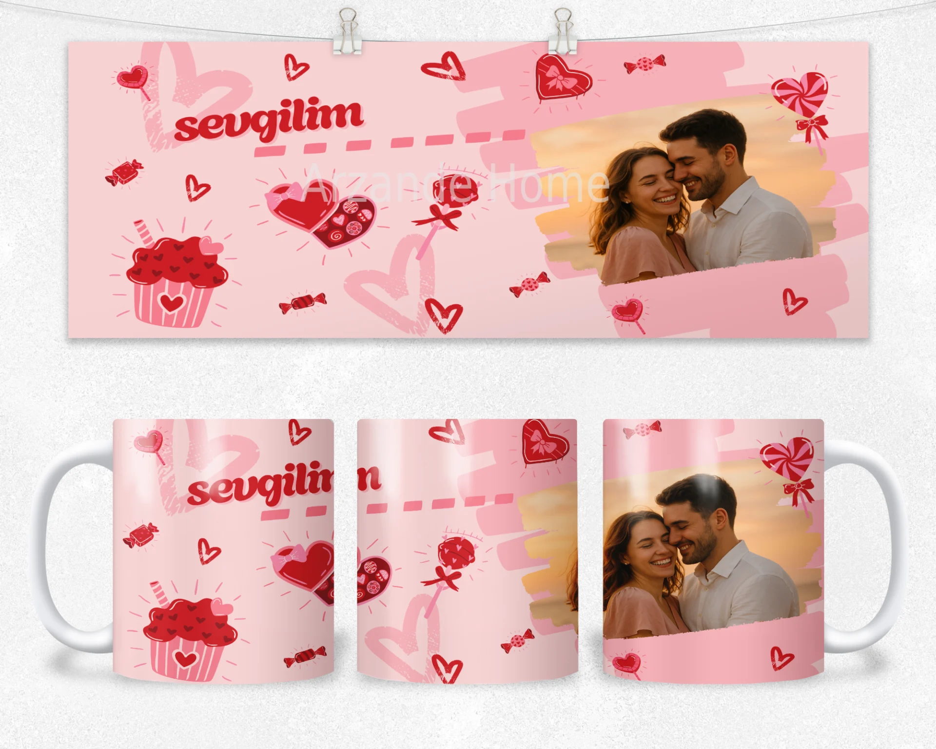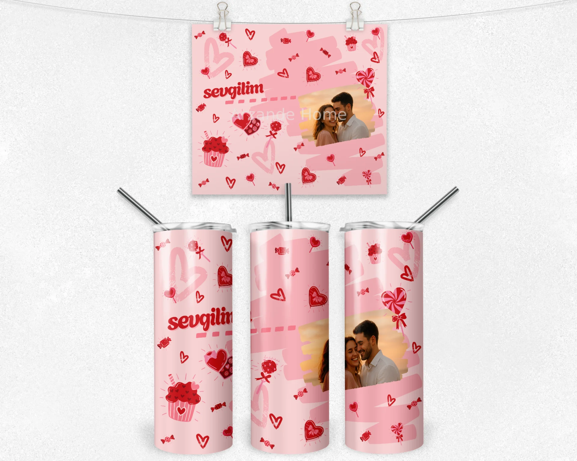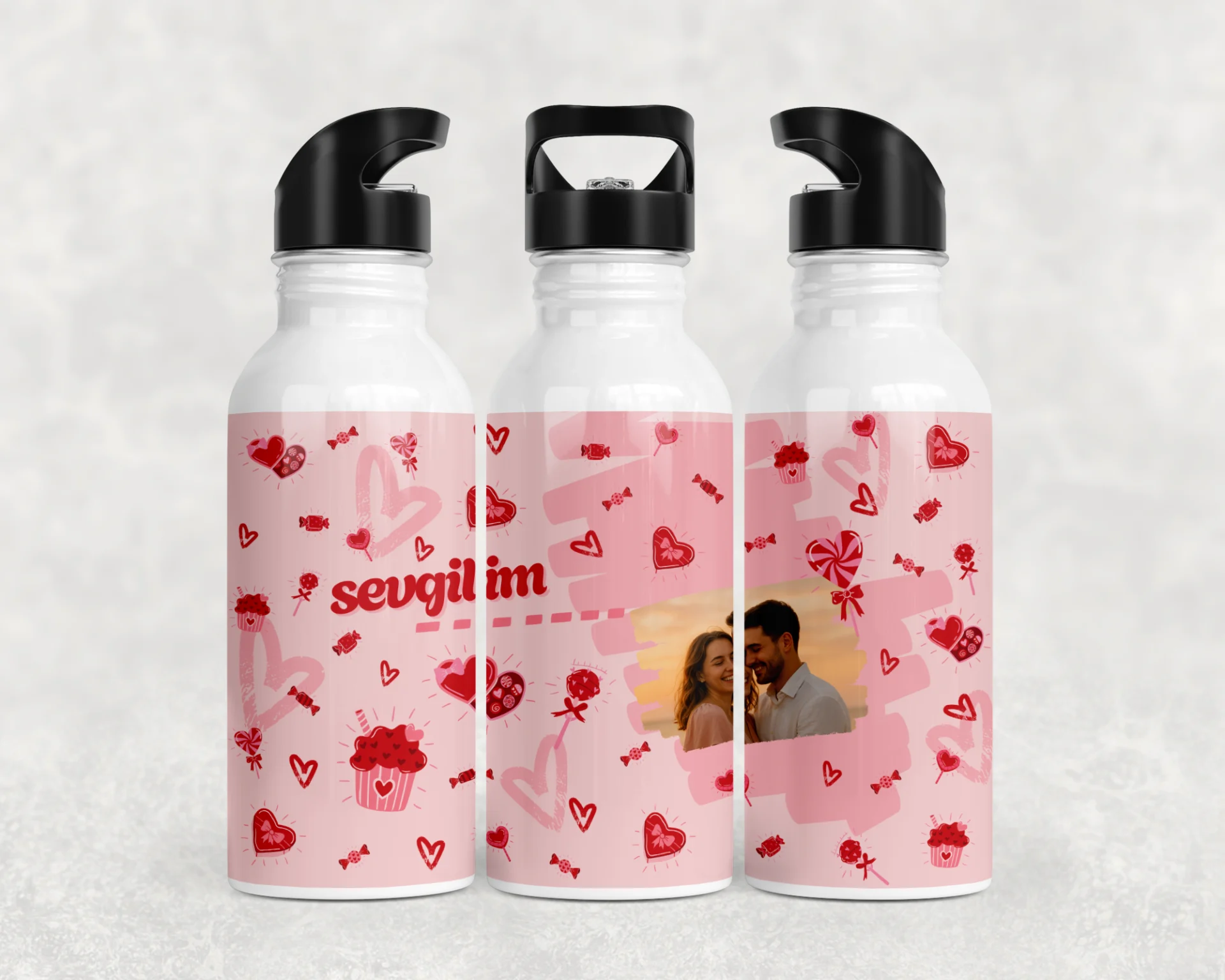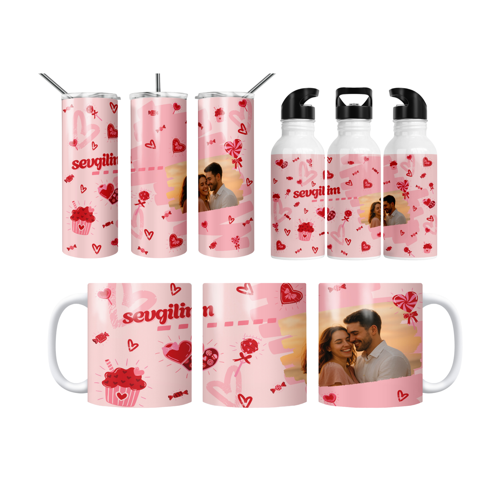 Romantik pembe tonları, kalpler ve “sevgilim” yazısıyla tasarlanan bu özel set, en güzel anınızı bardak, termos ve matara üzerine yansıtır. Sevgililer Günü, yıl dönümü veya sürpriz hediye için ideal; yüksek kaliteli baskısıyla unutulmaz bir hatıra olur. 600 ml termos, 600 ml matara, 11 oz kupa içerir. İsim/mesaj/tarih kişiselleştirme yapılır; hediye paketi ve not kartıyla gönderilir.