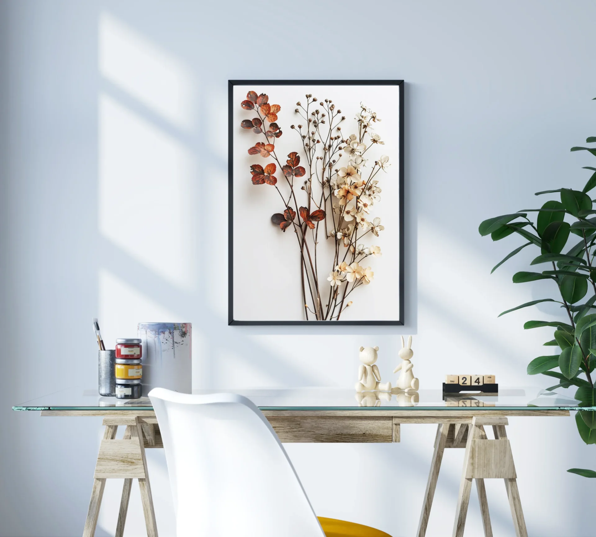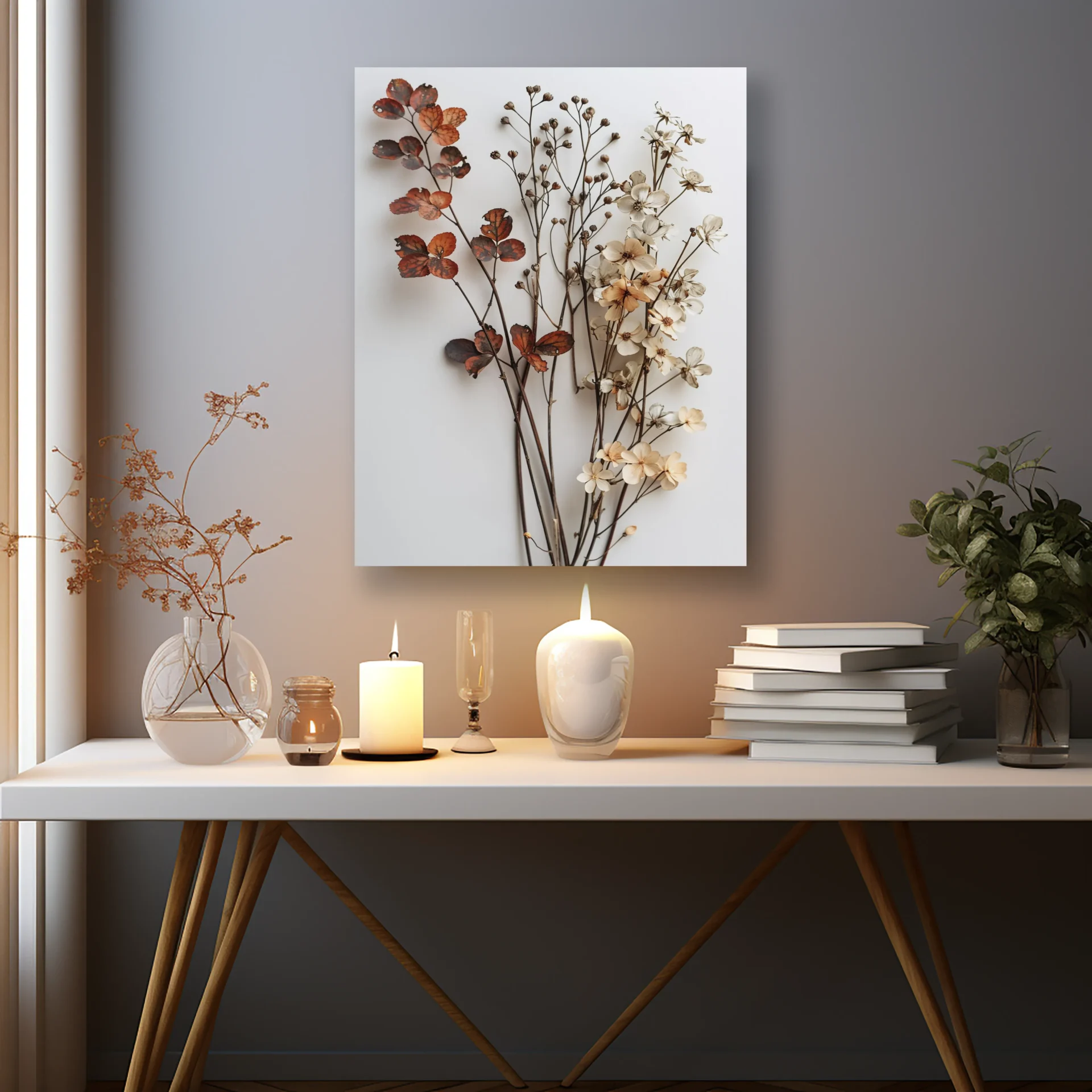 Kırmızı ve krem tonlarındaki yapraklar, mevsimin dönüşümünü betimliyor. Doğanın geçiciliğine dair romantik bir anlatım sunuyor.