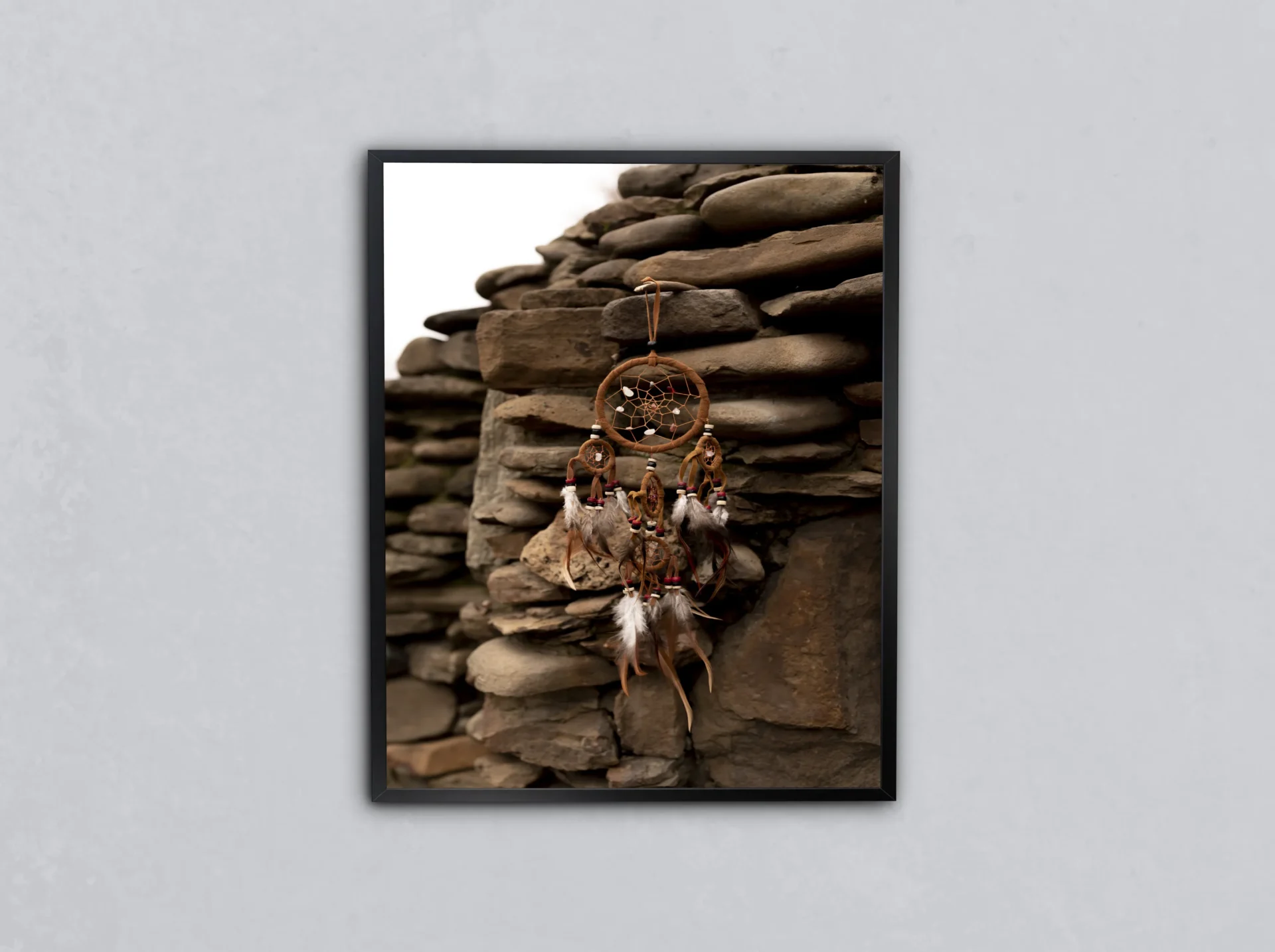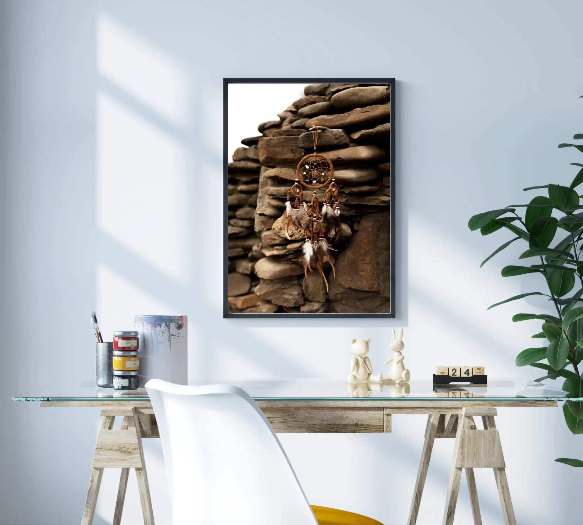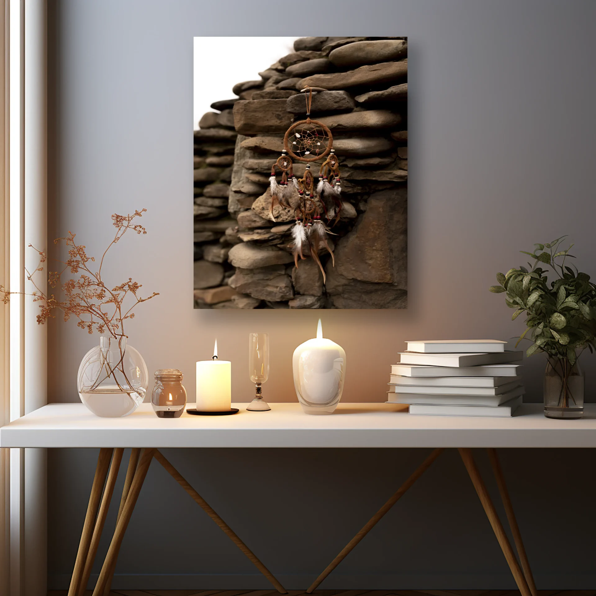 Doğal taş duvarların önünde yer alan dekoratif rüya kapanı, zamanla bütünleşmiş bir hikâyeyi anlatıyor. Rustik ruhu ve geleneksel motifleriyle dikkat çekici bir ambiyans yaratıyor.