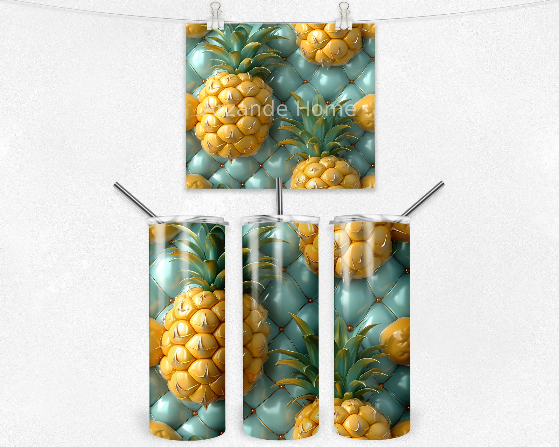 Ananas desenleri ve turkuaz arka plan tropik bir atmosfer yaratır. Yaz enerjisini ofise, spora ve seyahate taşımak için idealdir.