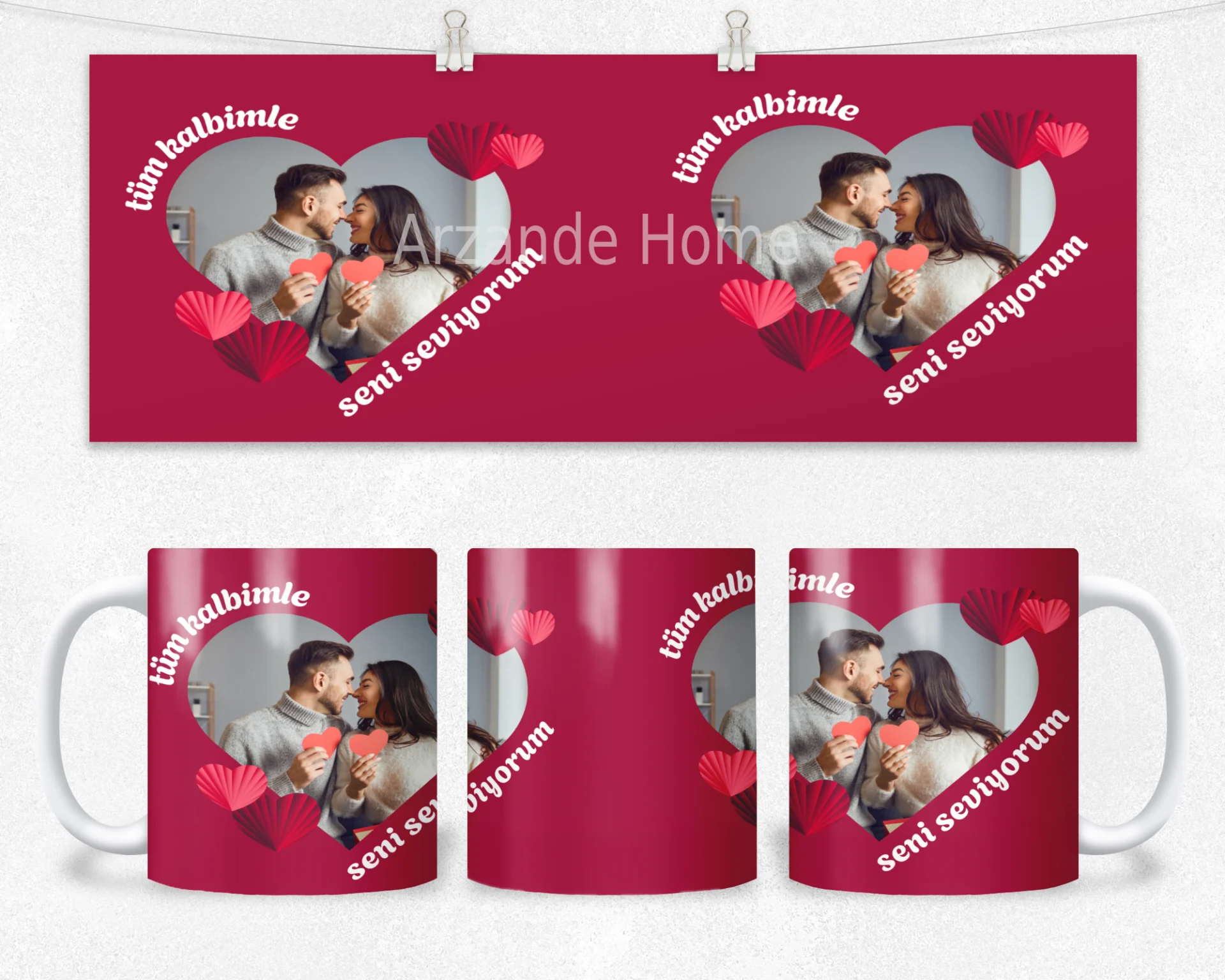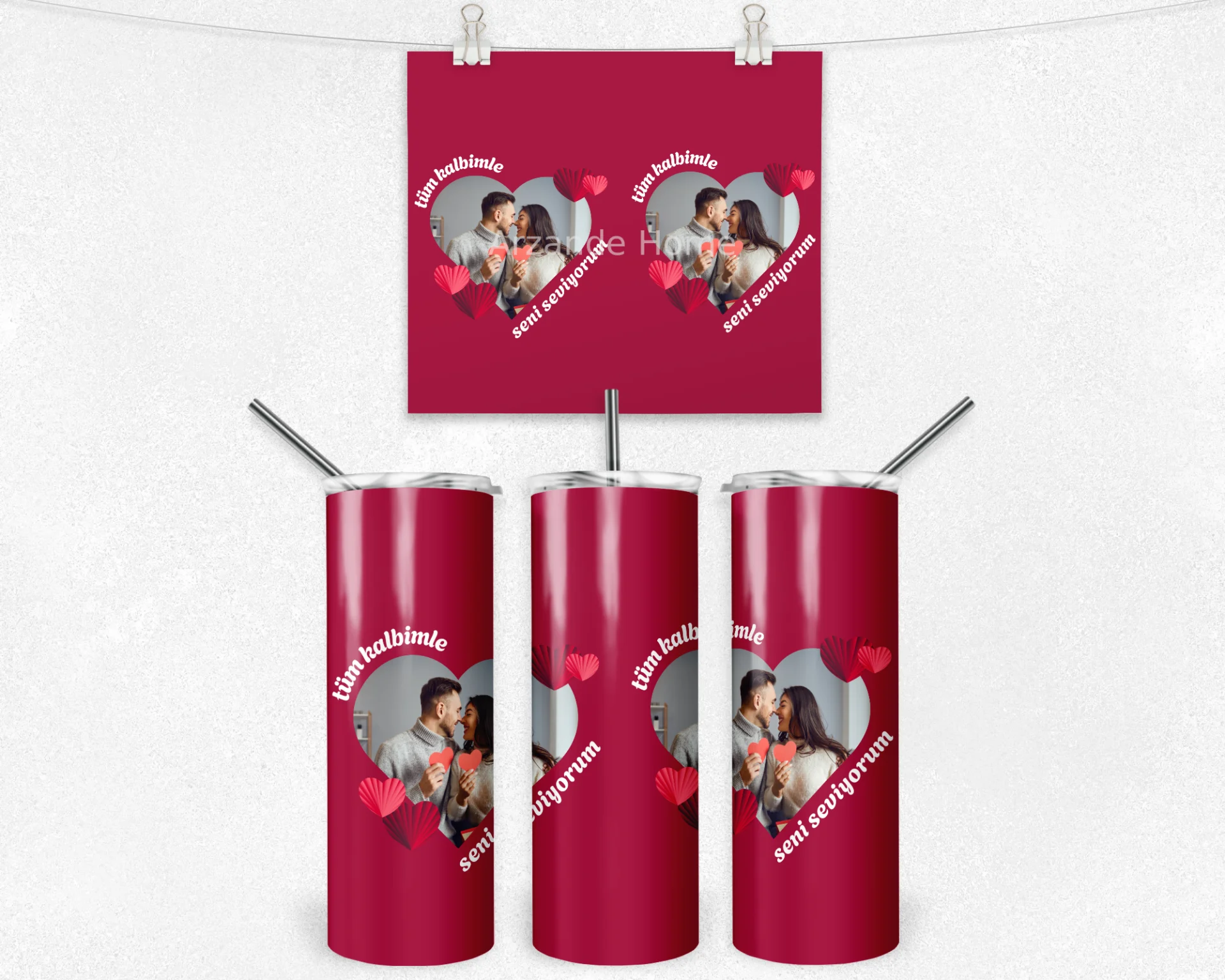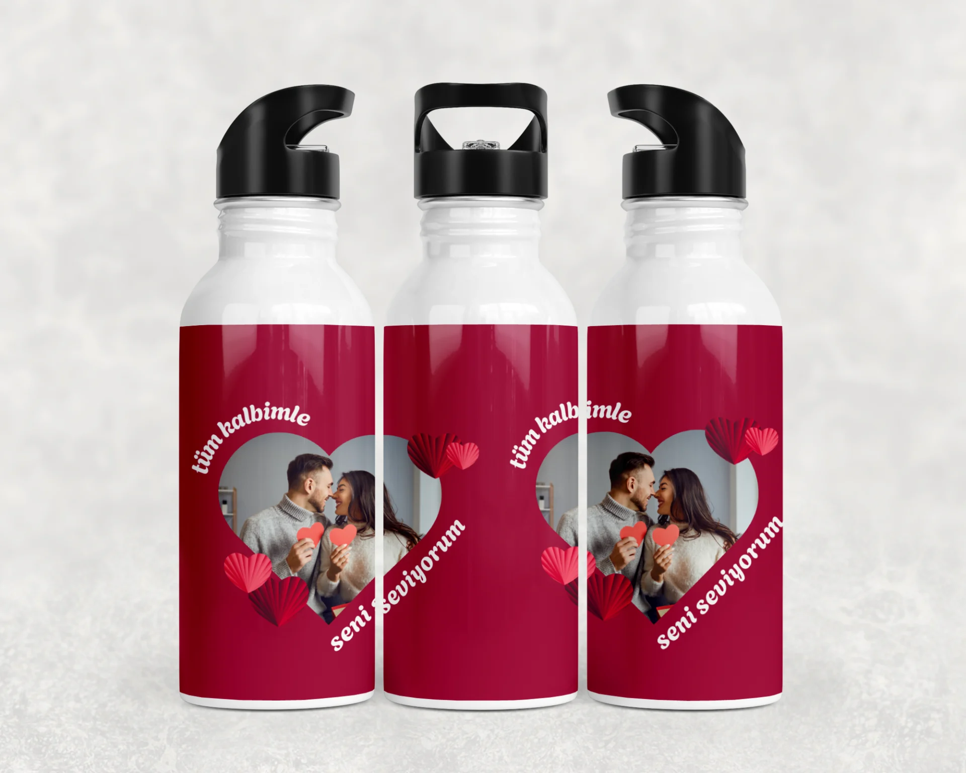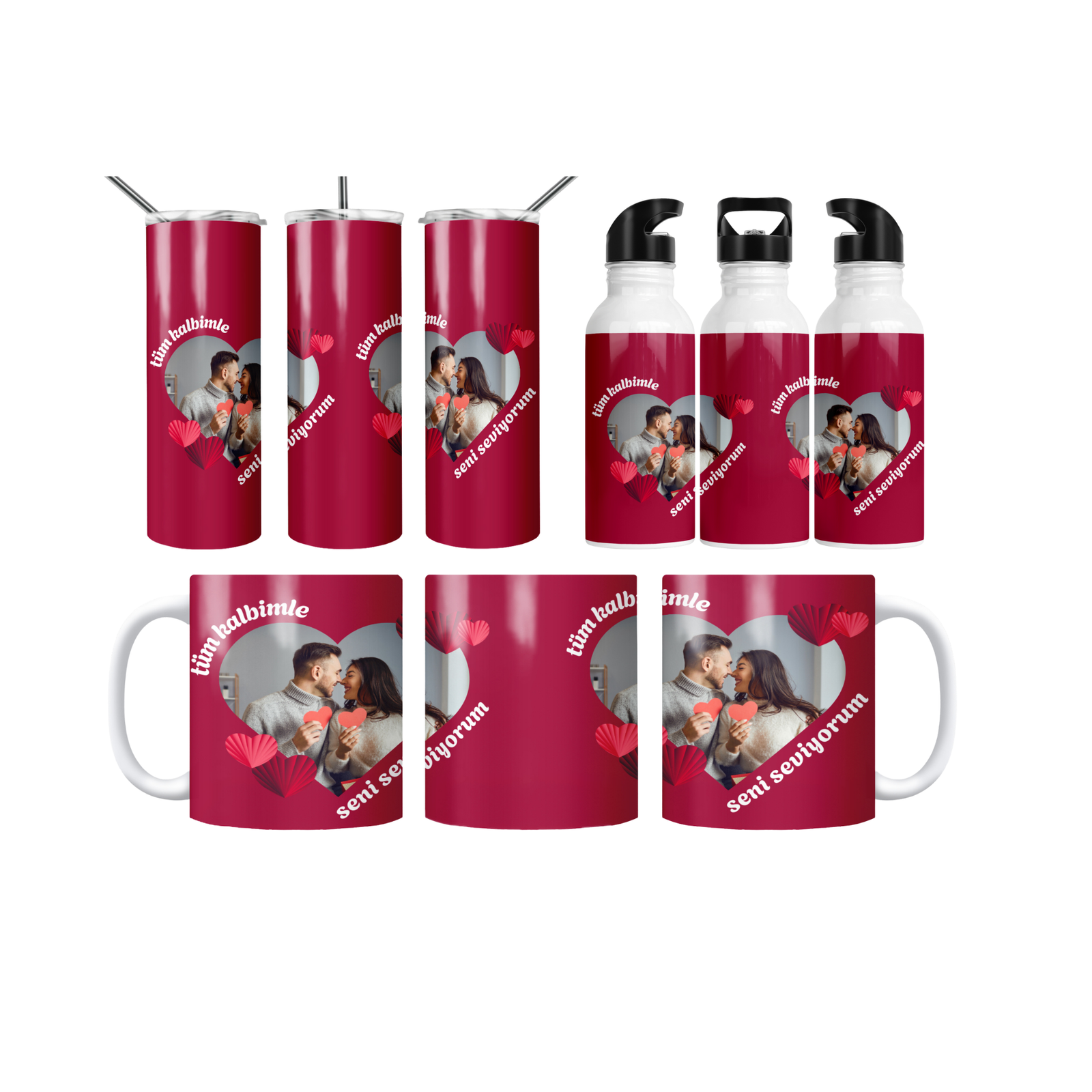 Nar kırmızısı zemin, kalp biçimli fotoğraf alanı ve 3D kâğıt kalp detaylarıyla romantik tasarım; Sevgililer Günü ve yıldönümü için ideal. 600 ml termos, 600 ml matara, 11 oz kupa içerir. Ad/mesaj/tarih baskısı yapılır; hediye paketi ve not kartı ile gönderilir.