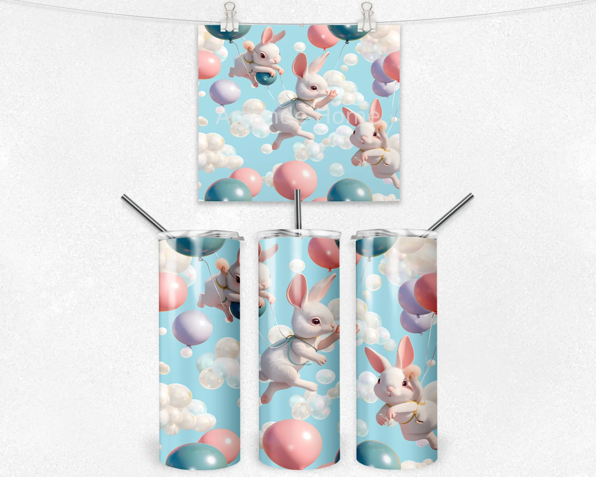 Gökyüzünde balonların arasında süzülen sevimli tavşan figürleri ile eğlenceli ve pozitif bir tasarım. Çocuklar ve genç ruhlular için harika bir hediye seçeneği.