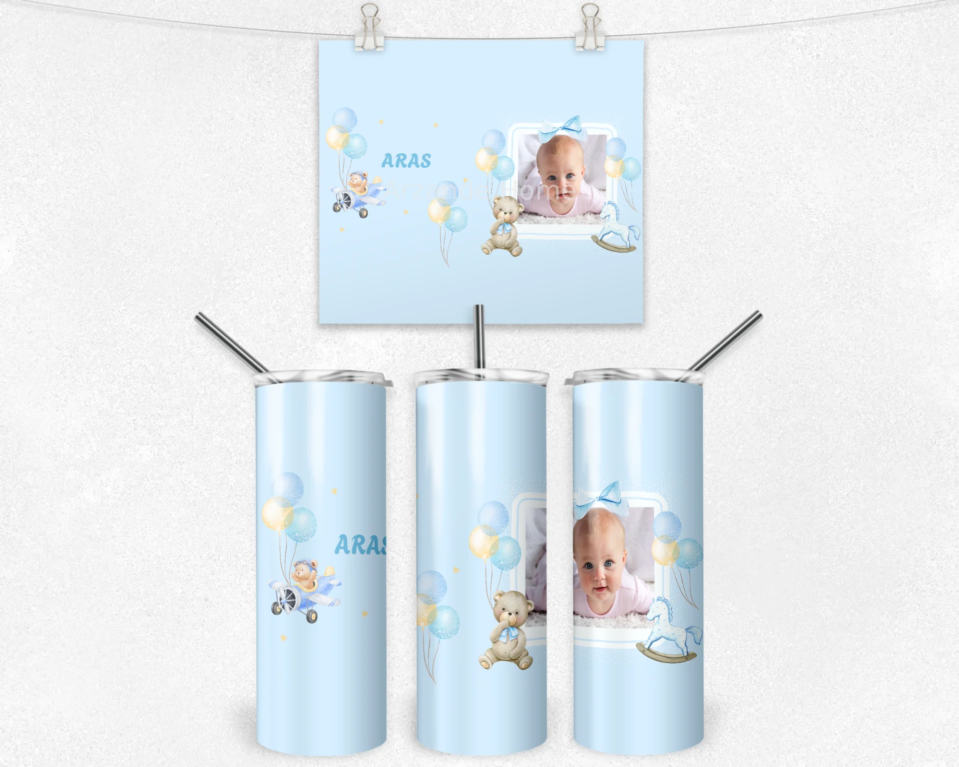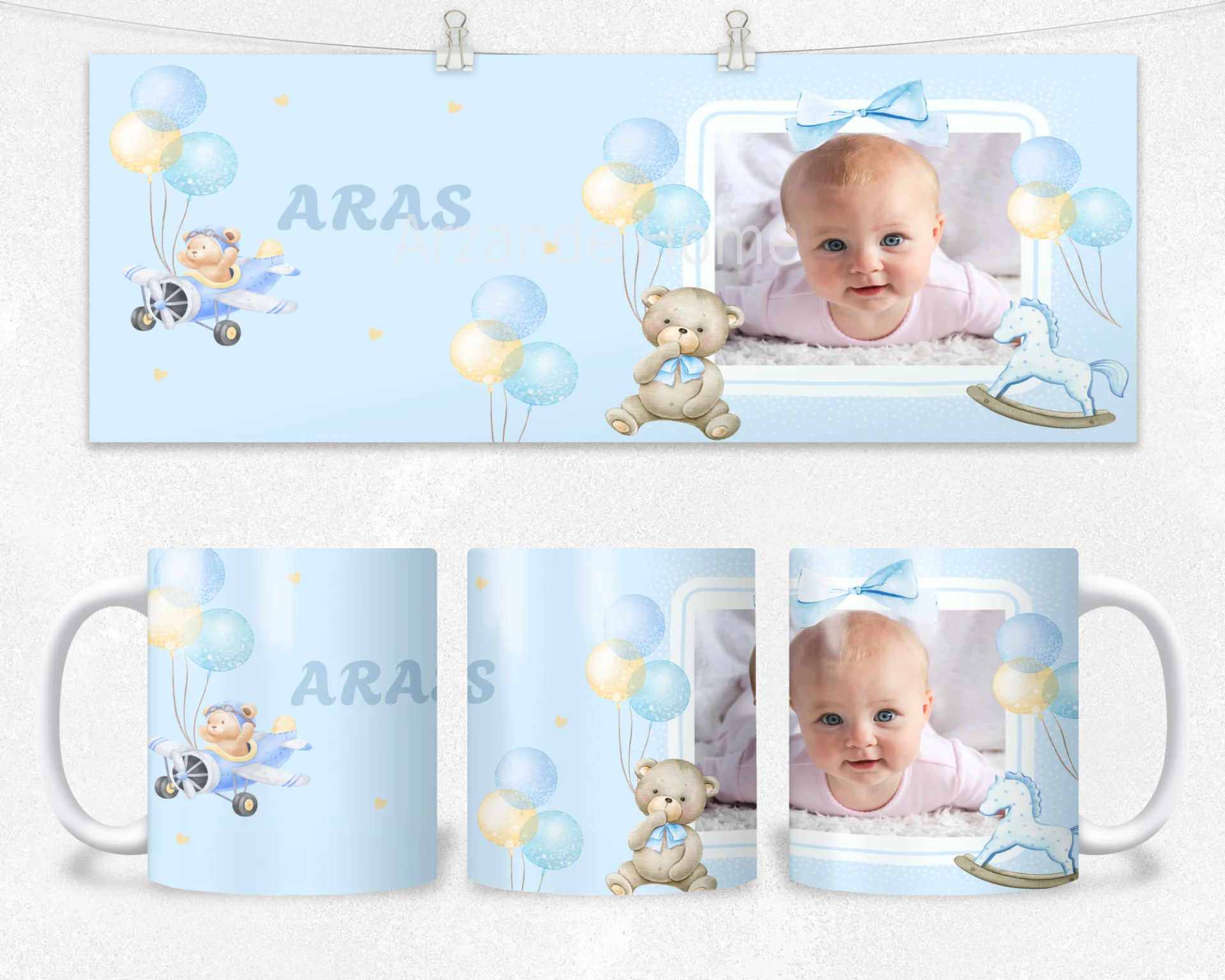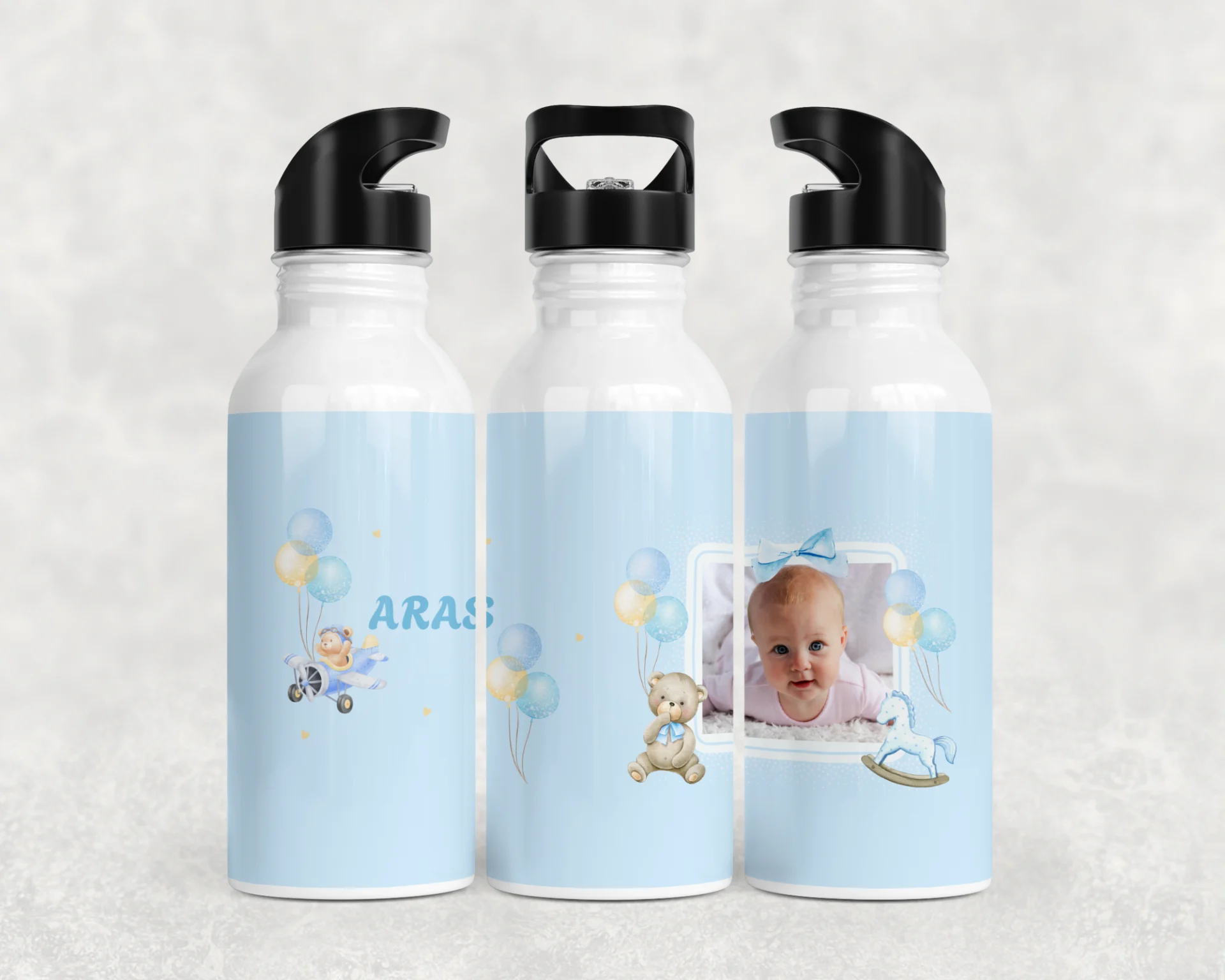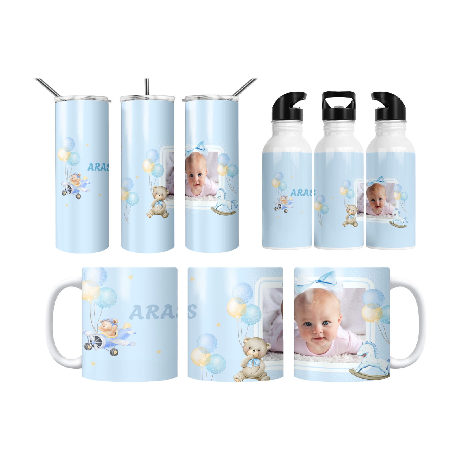 Açık mavi fonda balonlar, papyonlu ayıcık, uçak ve sallanan at illüstrasyonlarıyla tasarlanan bu konsept, bebeğinizin adını ve fotoğrafını çerçeveli alanda şıkça vurgular. Baby shower, hoş geldin bebek ve 1 yaş hediyesi için ideal; bardak, termos ve matarada yüksek çözünürlüklü canlı baskısıyla uzun yıllar saklanır. 600 ml termos, 600 ml matara, 11 oz kupa içerir. İsim/mesaj/tarih kişiselleştirme yapılır; hediye paketi ve not kartıyla gönderilir.