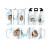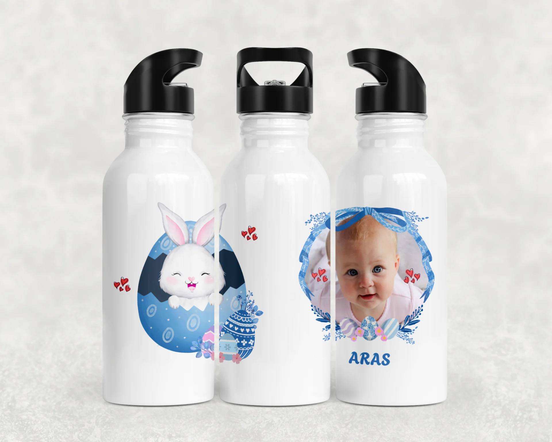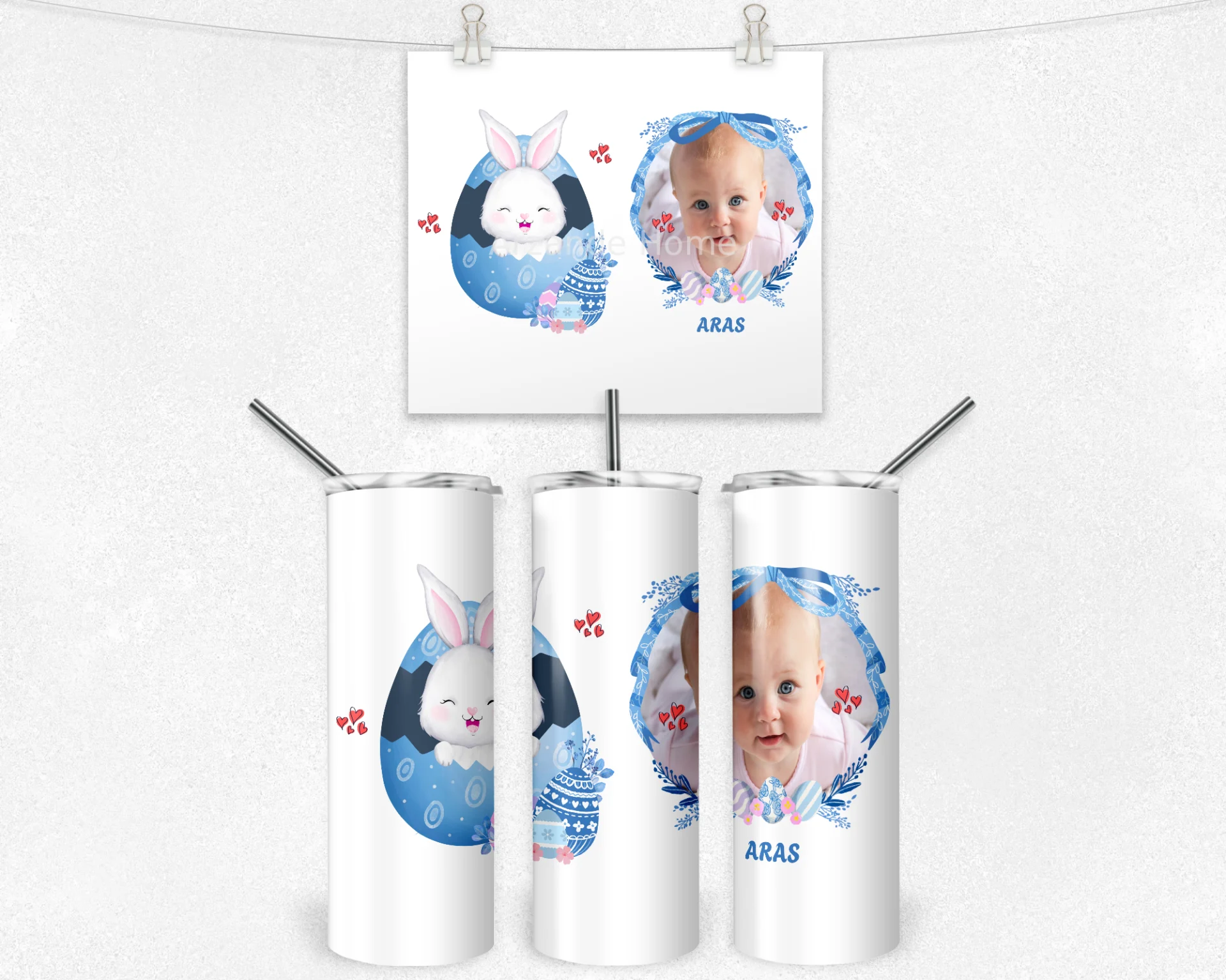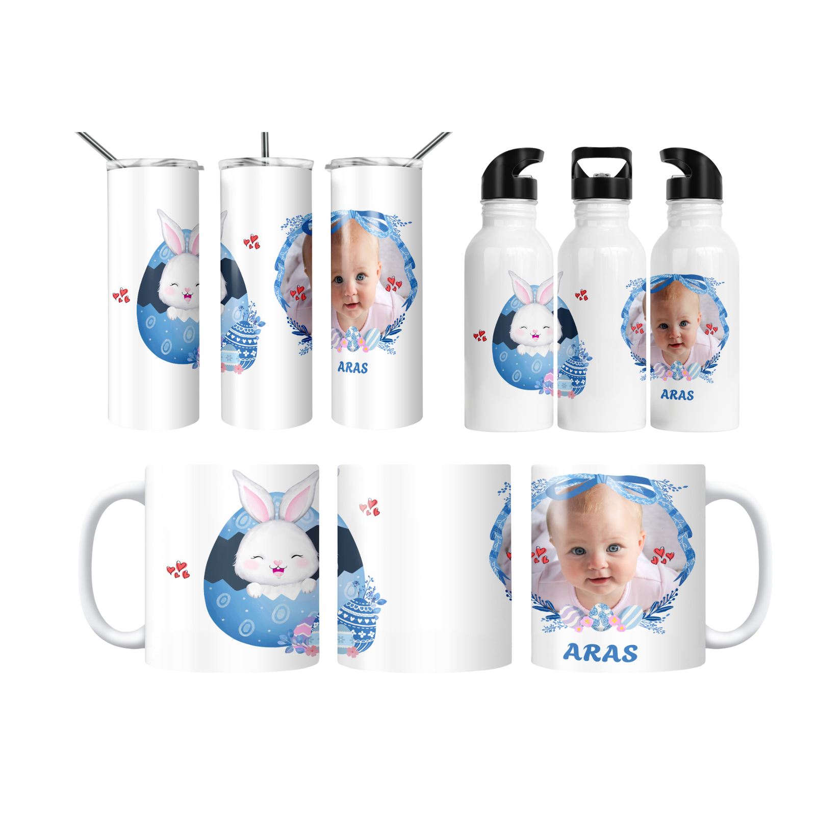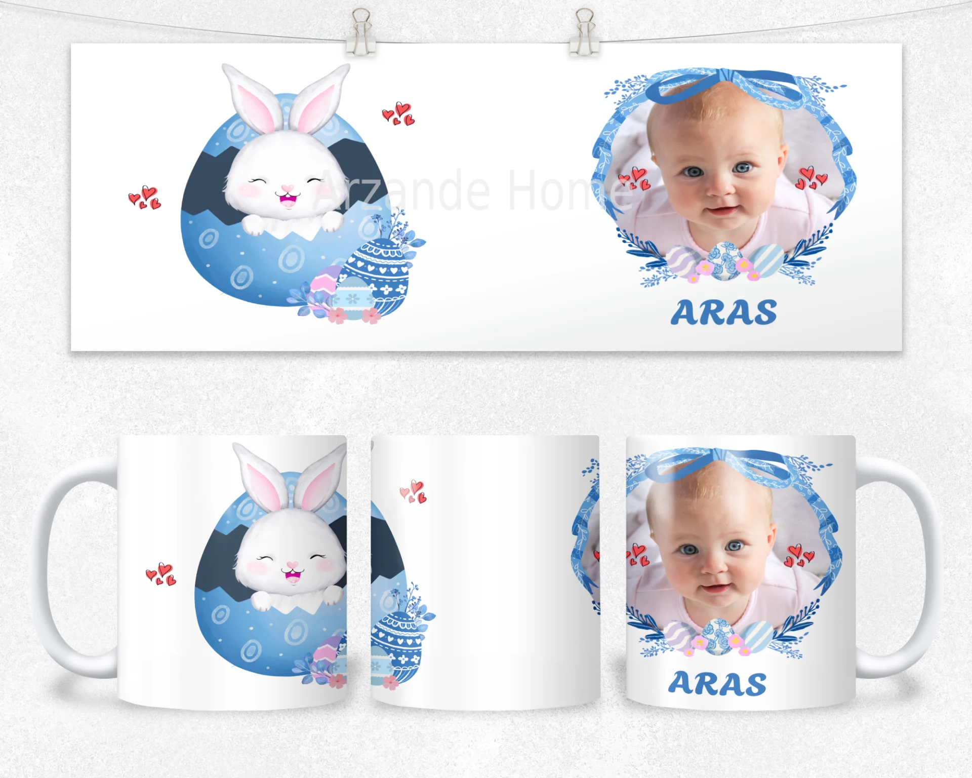 Mavi tonlu yumurtalar ve sevimli tavşan illüstrasyonuyla süslenen bu tasarım, fiyonk detaylı çerçevede bebeğinizin adını ve fotoğrafını zarifçe öne çıkarır. Baby shower, hoş geldin bebek ve ilk yaş için ideal; bardak, termos ve matarada yüksek çözünürlüklü canlı baskıyla yıllarca saklanır.