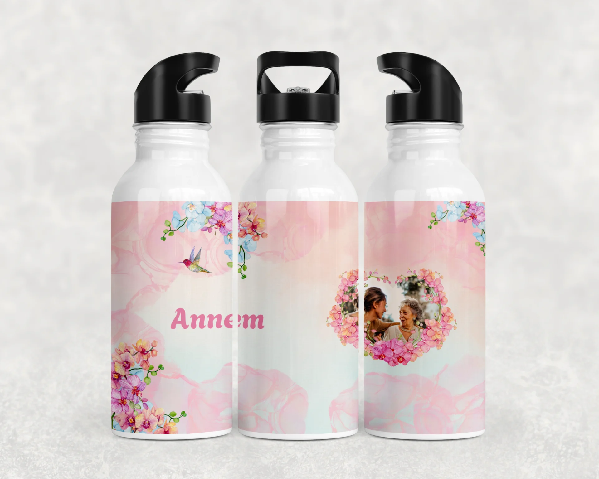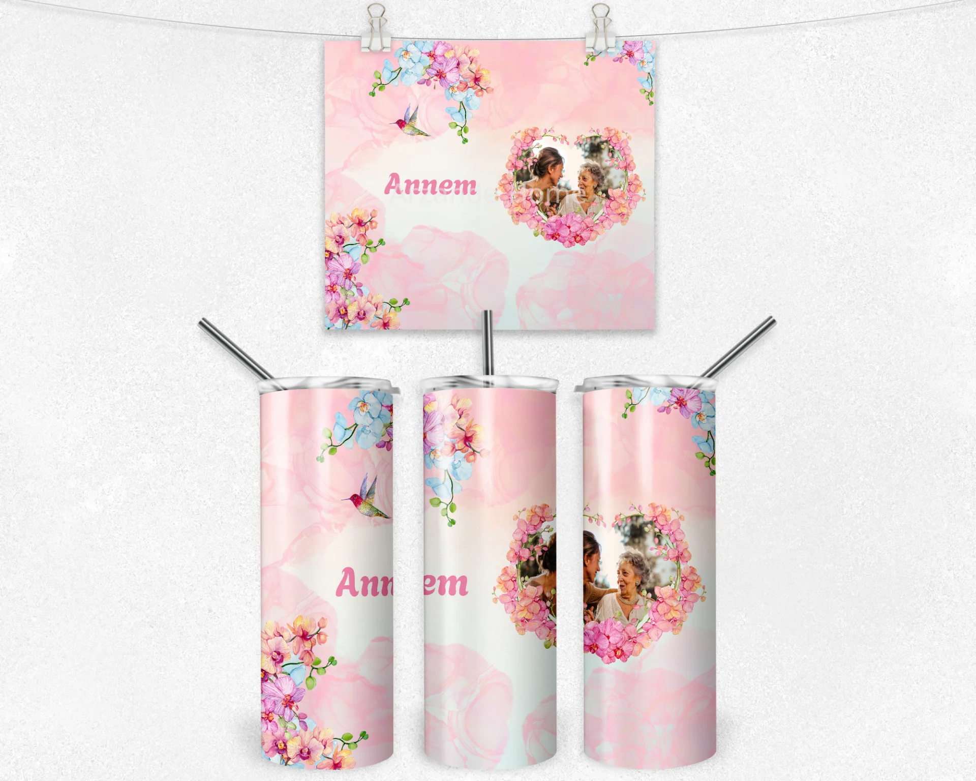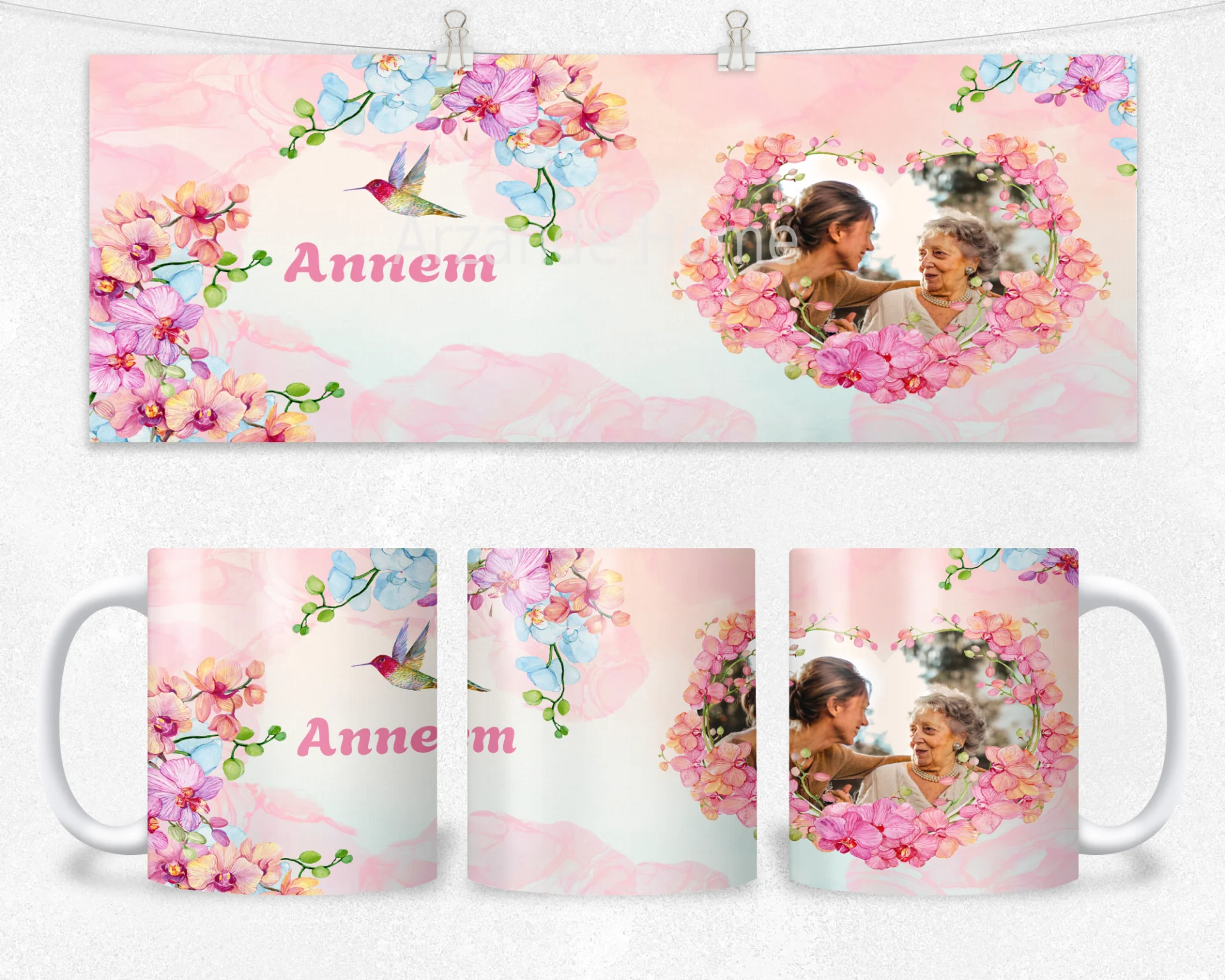 Pembe suluboya fonda kolibri ve akvarel orkide çelenkleriyle romantik kompozisyon, “Annem” yazısı ve fotoğraf alanıyla hediyenizi tamamen kişiselleştirir. Anneler Günü, doğum günü ve özel kutlamalar için şık bir seçim; bardak, termos ve matarada yüksek çözünürlüklü baskısıyla kalıcı bir hatıraya dönüşür. 600 ml termos, 600 ml matara, 11 oz kupa içerir. İsim/mesaj/tarih kişiselleştirme yapılır; hediye paketi ve not kartıyla gönderilir.