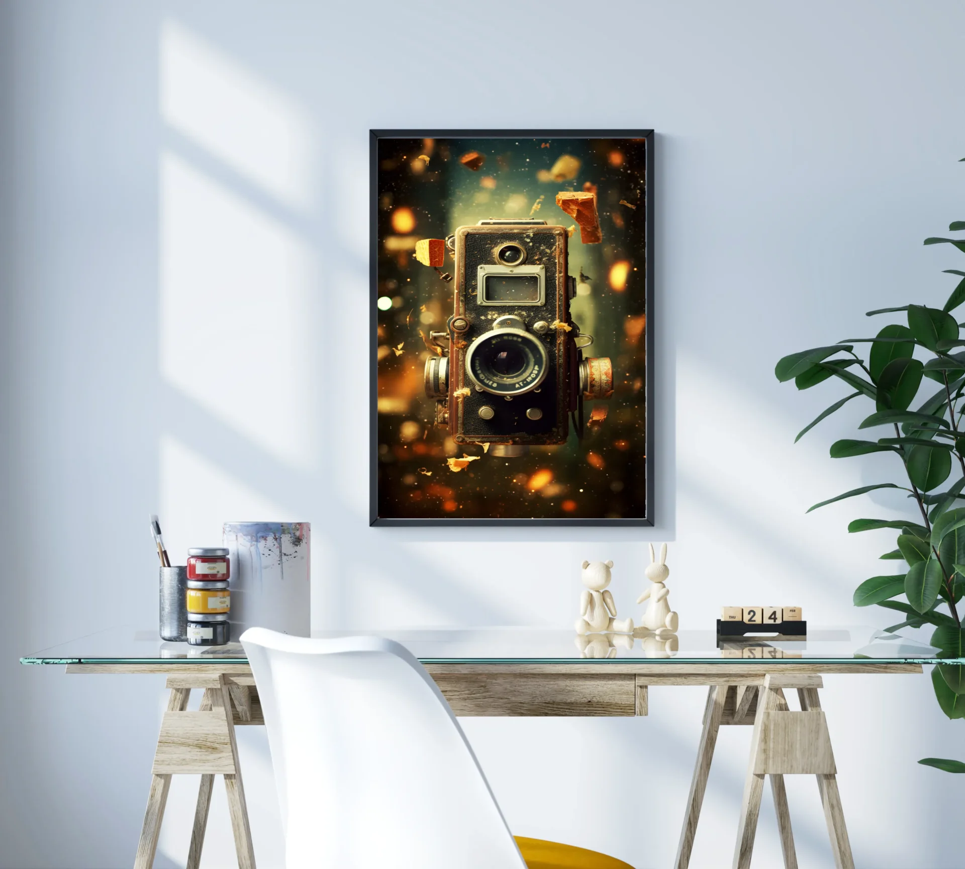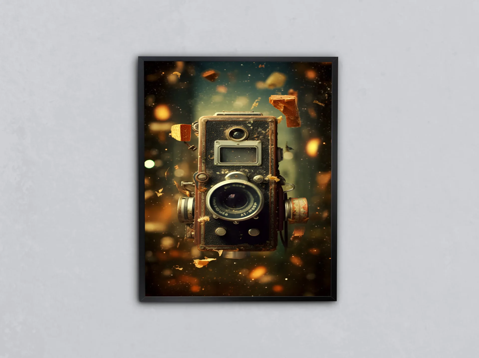 Parlayan tozlar arasında duran klasik kamera, geçmişin büyüsünü bugüne taşıyor. Bu tablo nostaljiyi sevenler için eşsiz bir atmosfer sunar.