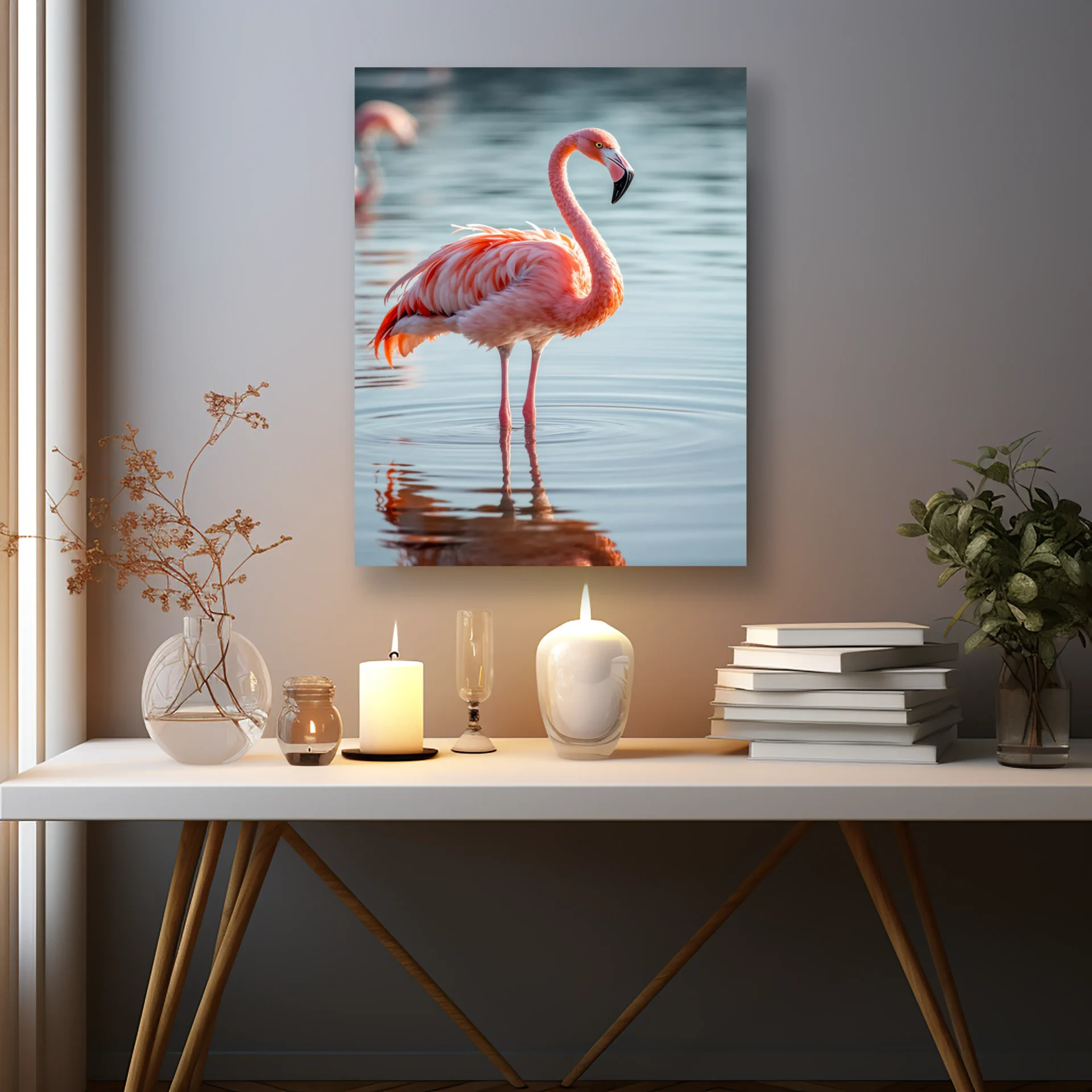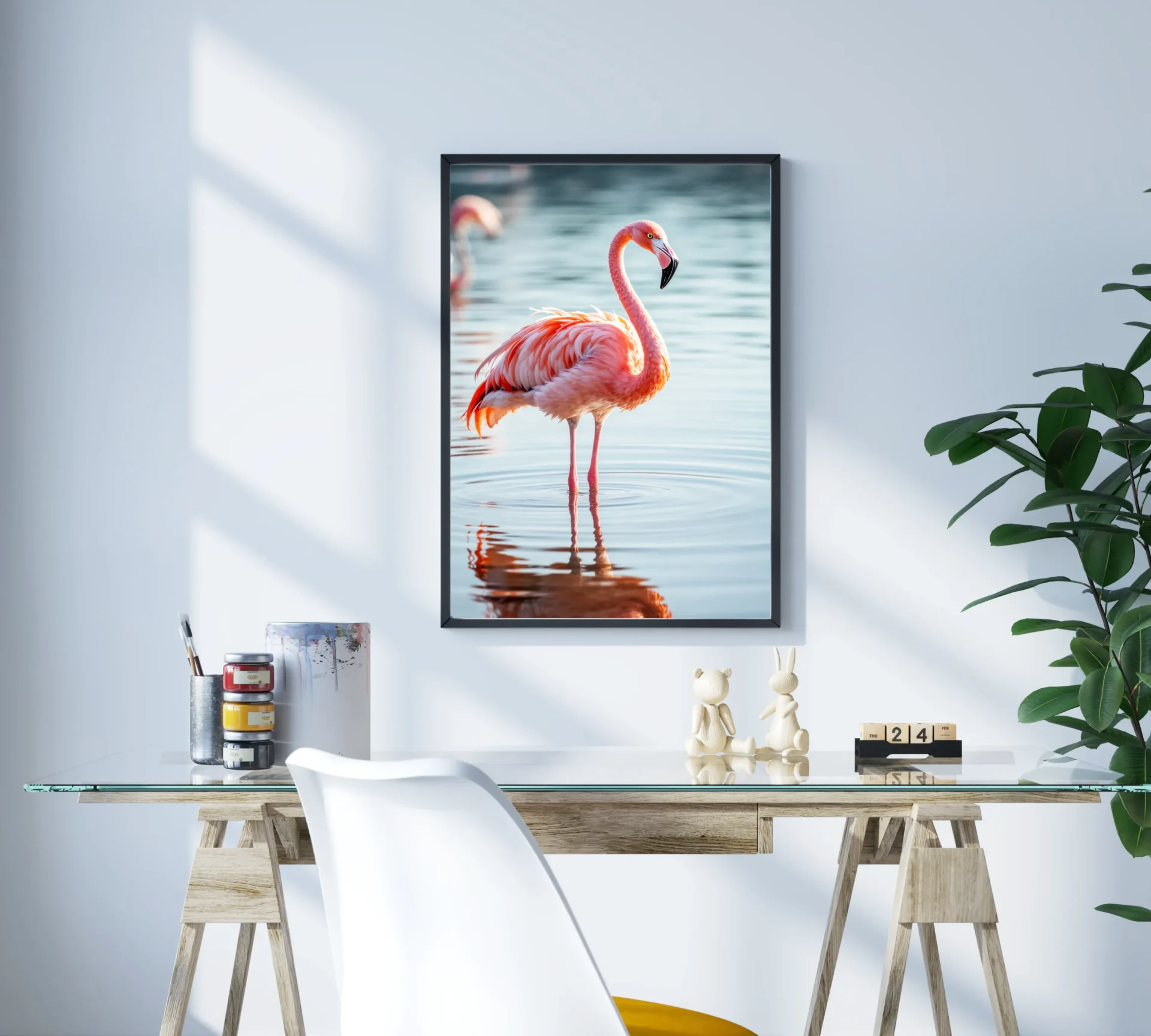Göletin ortasında duran flamingo, sadelik ve estetiği bir arada sunuyor. Minimal çizgilerle doğanın huzurunu hissettiriyor.
